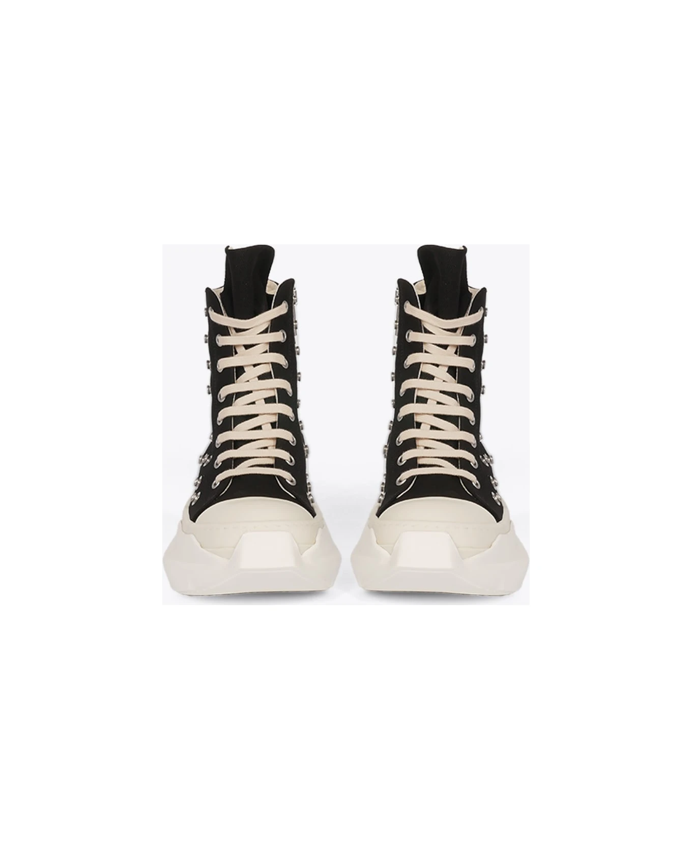 Black canvas lace-up high sneaker with metal snaps. Metal zip side closure. Off white leather cap-toe and abstract rubber sole. Made in Italy.