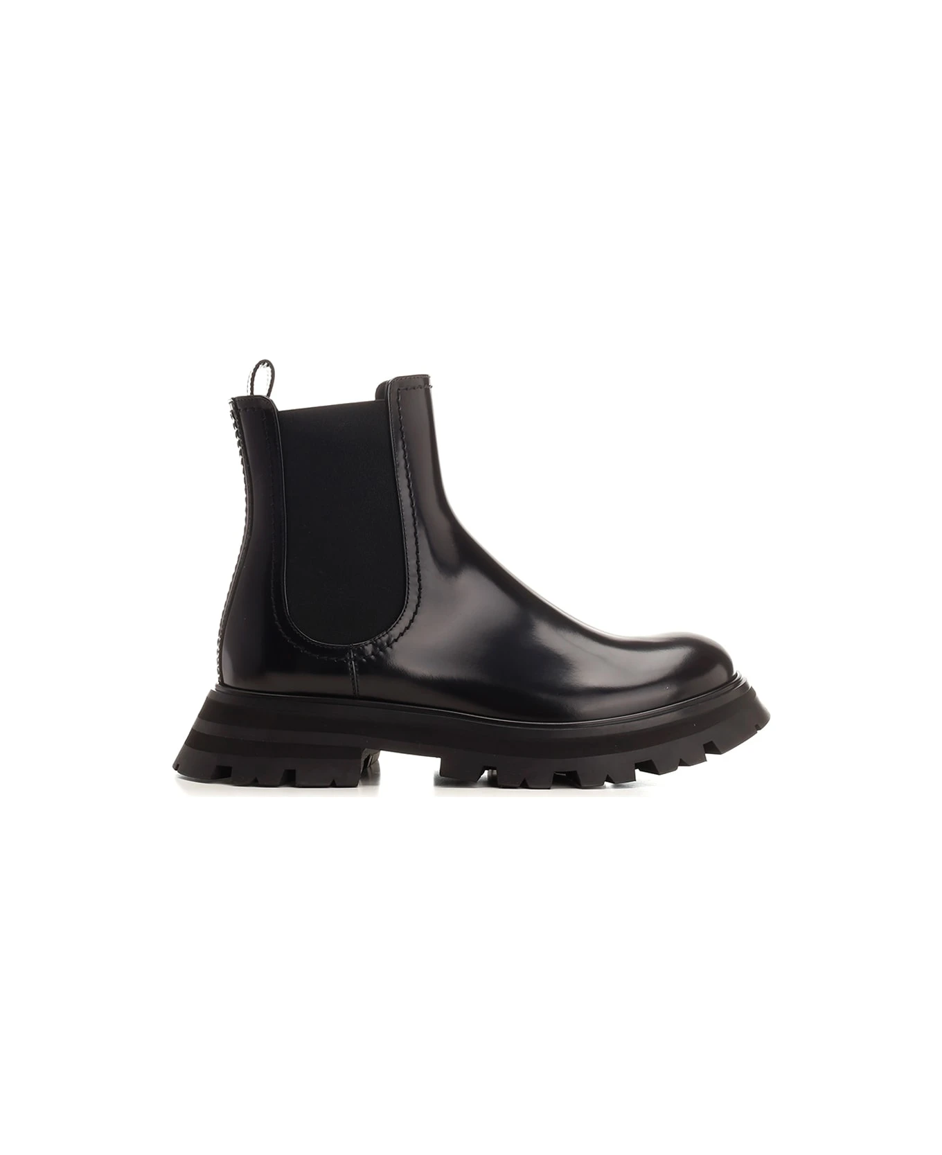 Black Chelsea boot from Alexander Mcqueen in shiny leather, with elastic inserts and lug sole.