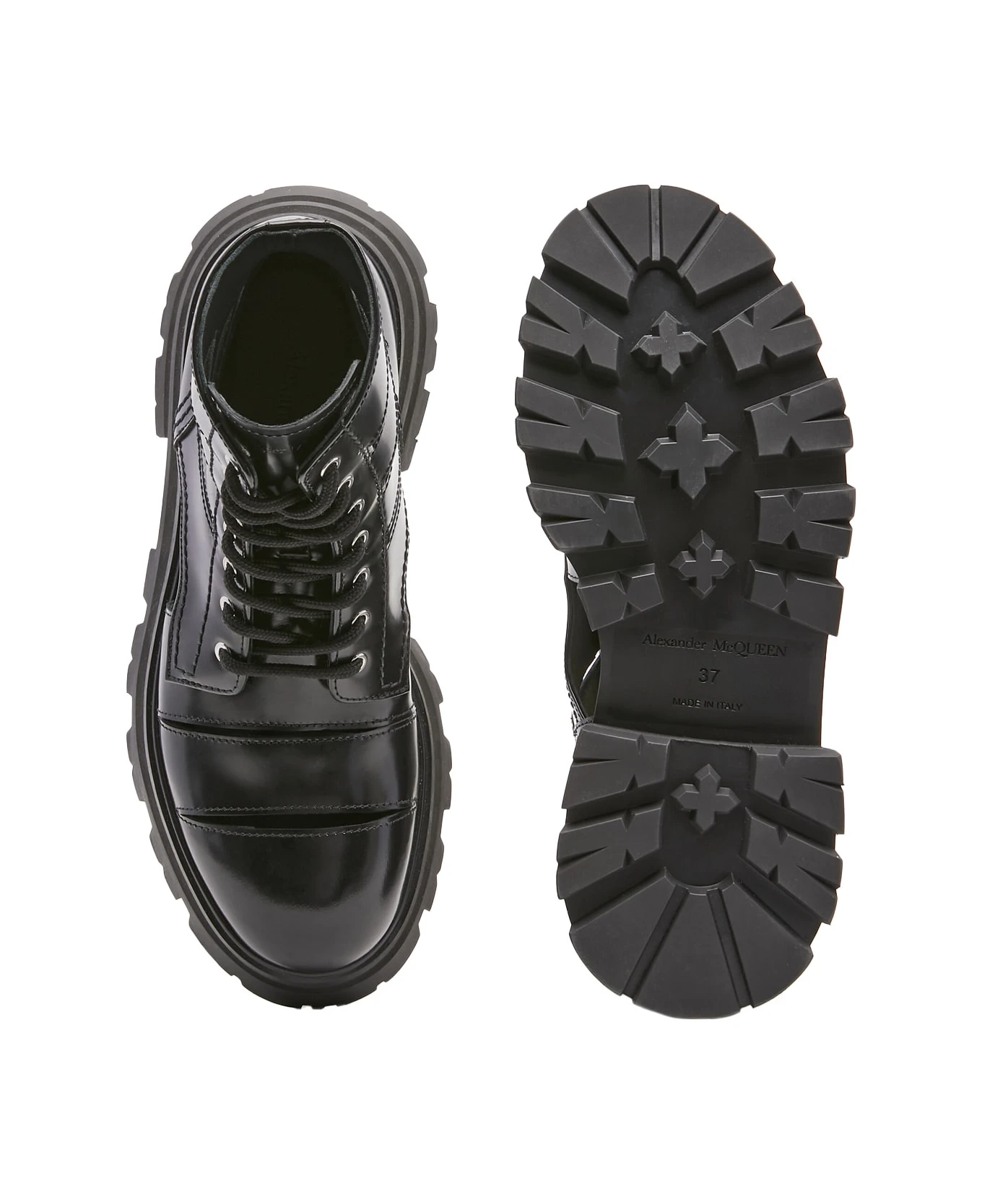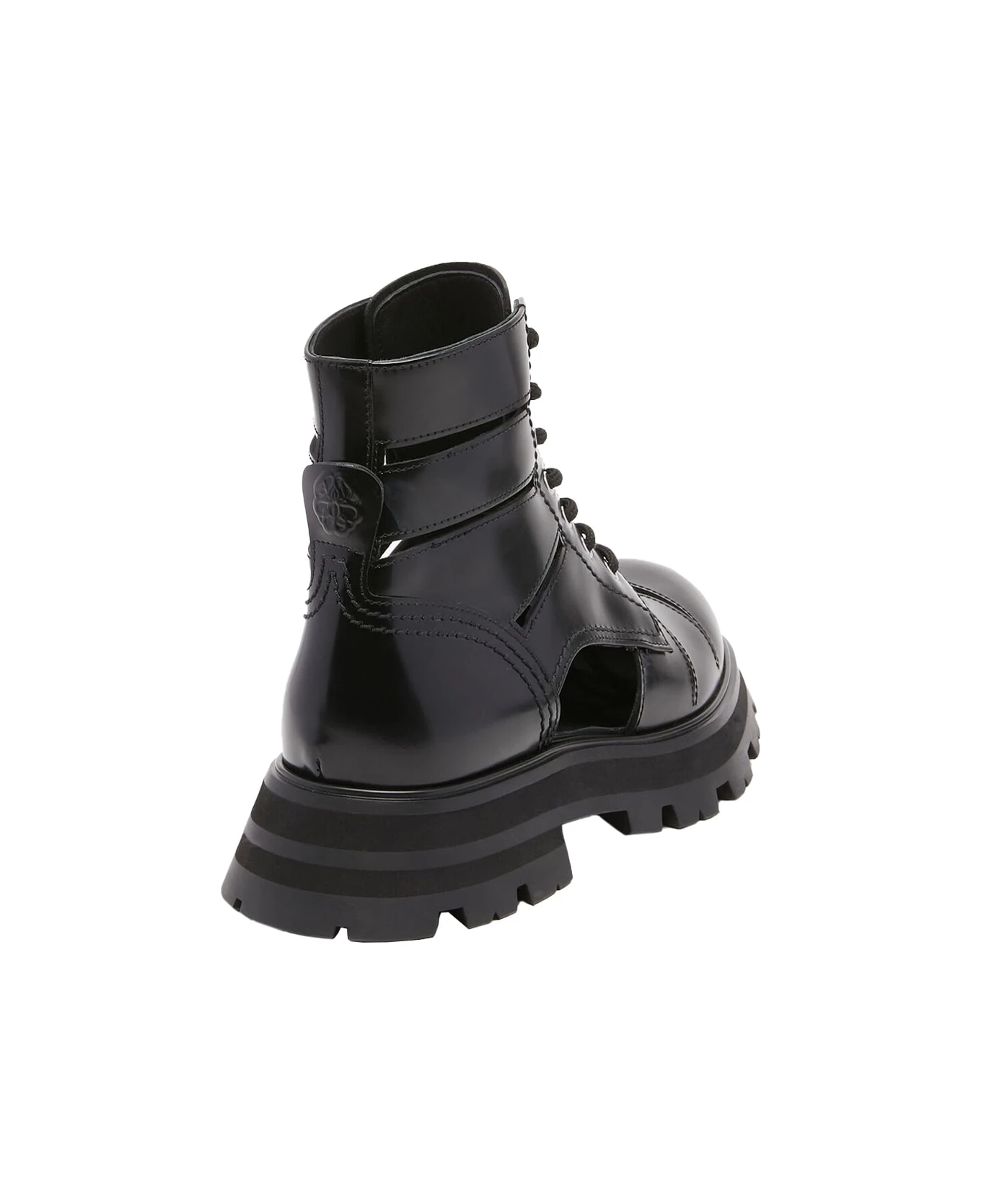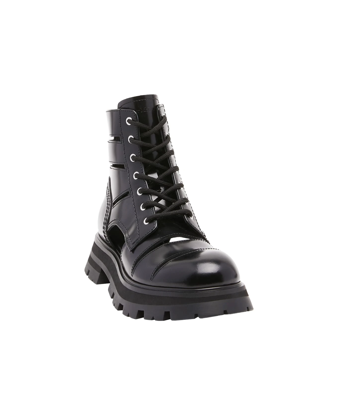 Wander ankle boots for women by Alexander McQueen crafted from black shiny calf leather with cut-out detailing, a round toe, a lace-up design with black laces, an oversized black rubber flared sole, an embossed Seal logo on the heel and an Alexander McQueen signature on the tongue. Sole height: 45 mm.