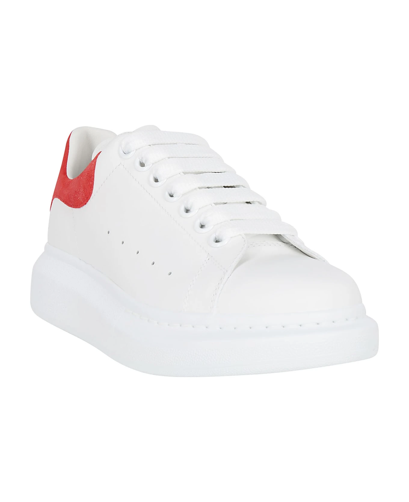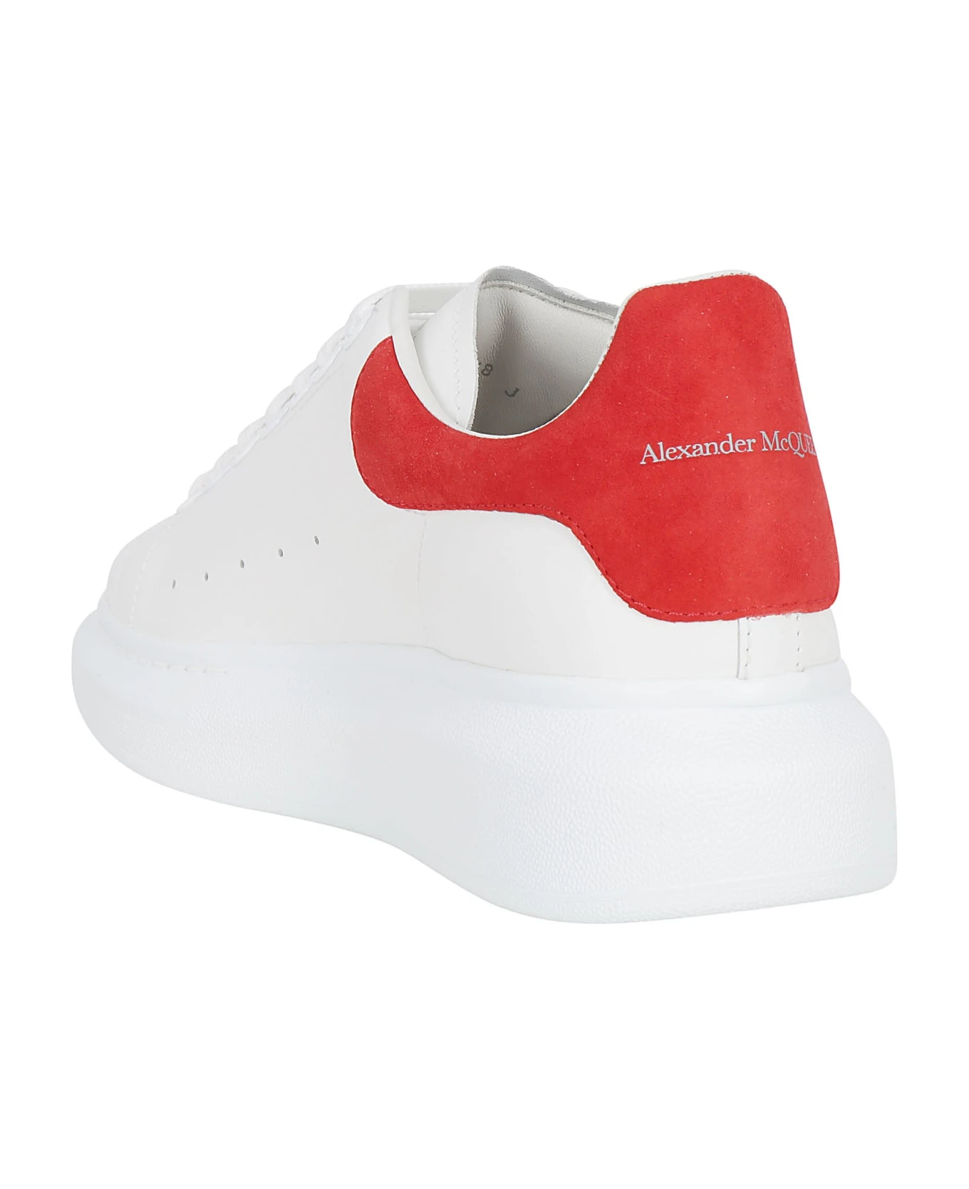 White Calfskin Sneakers by Alexander McQueen, round toe, logo printed on front, lace up closure, red suede detail on back with logo, high sole.