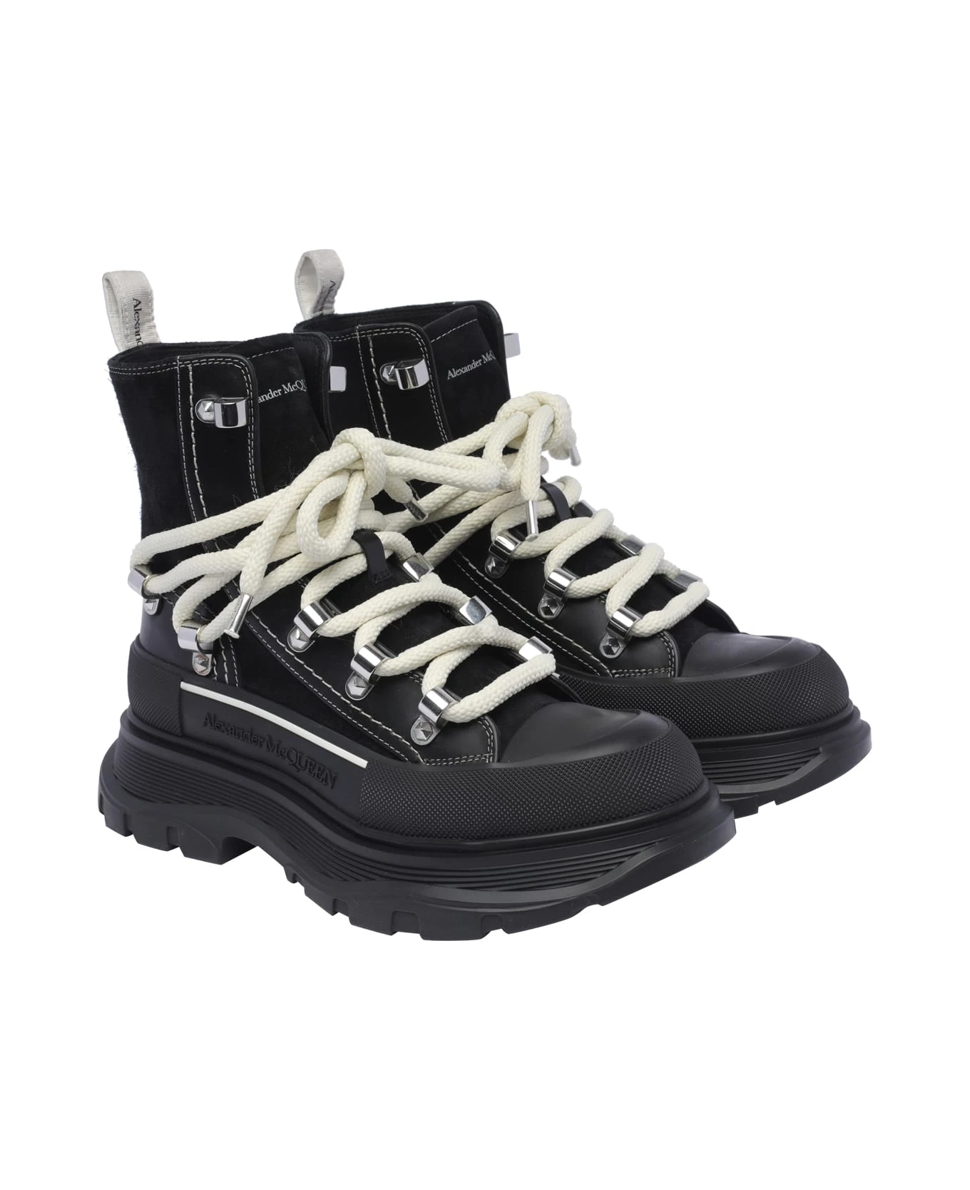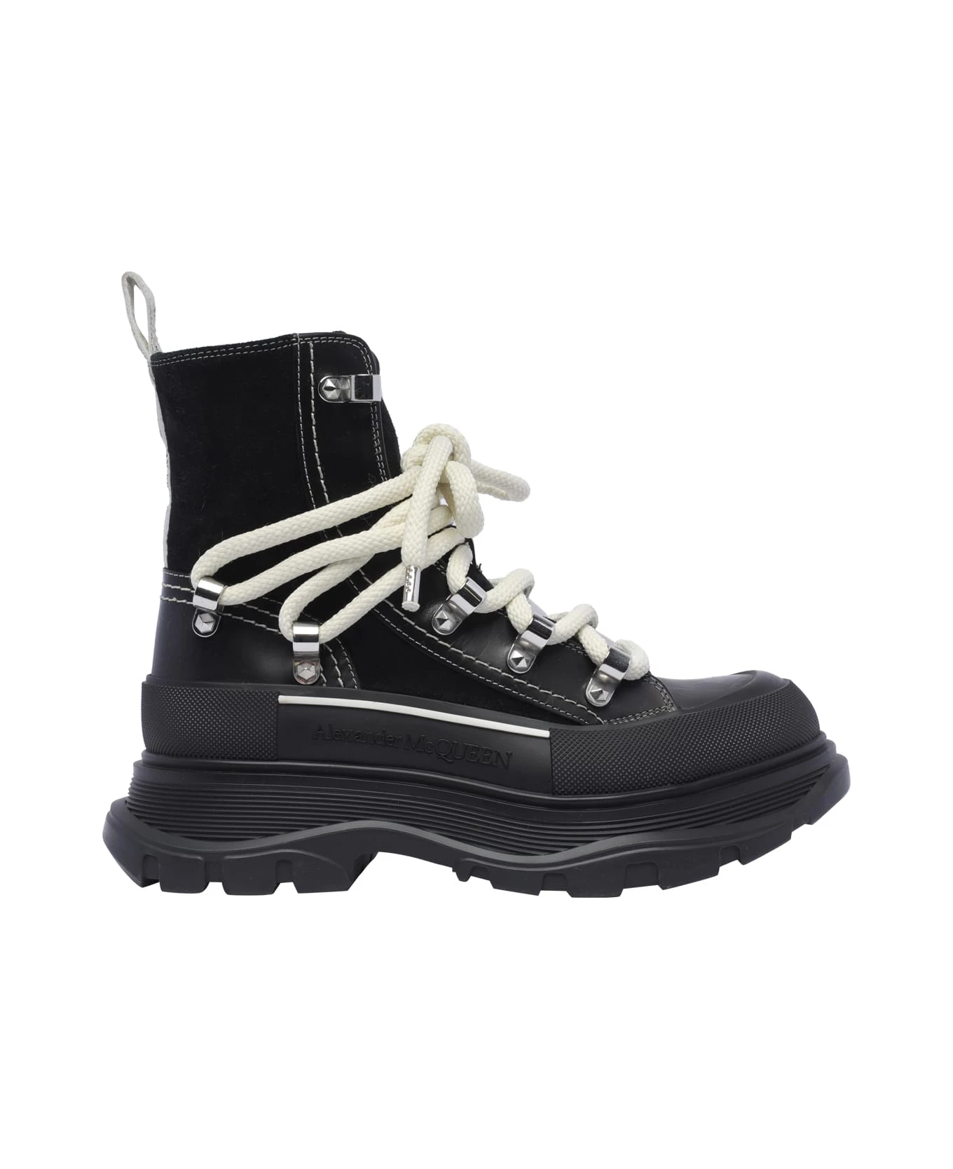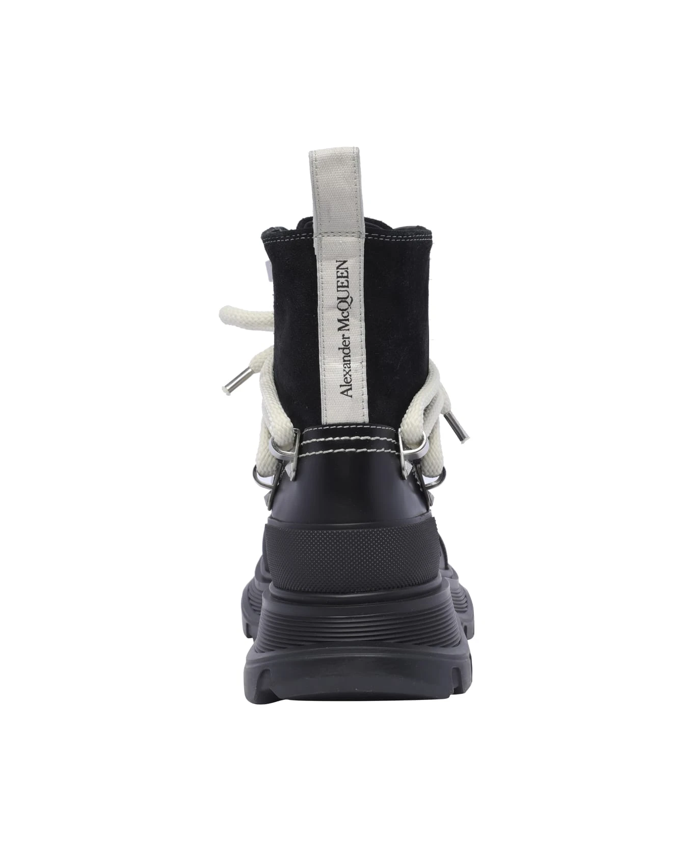 Alexander Mcqueen black booties, leather upper, laces closure, round toe, logo