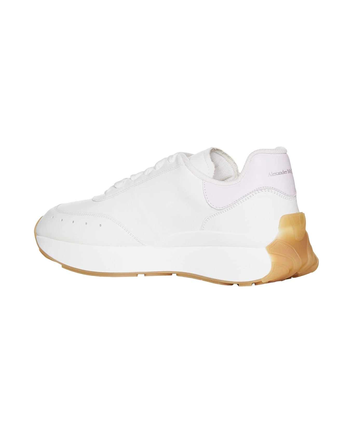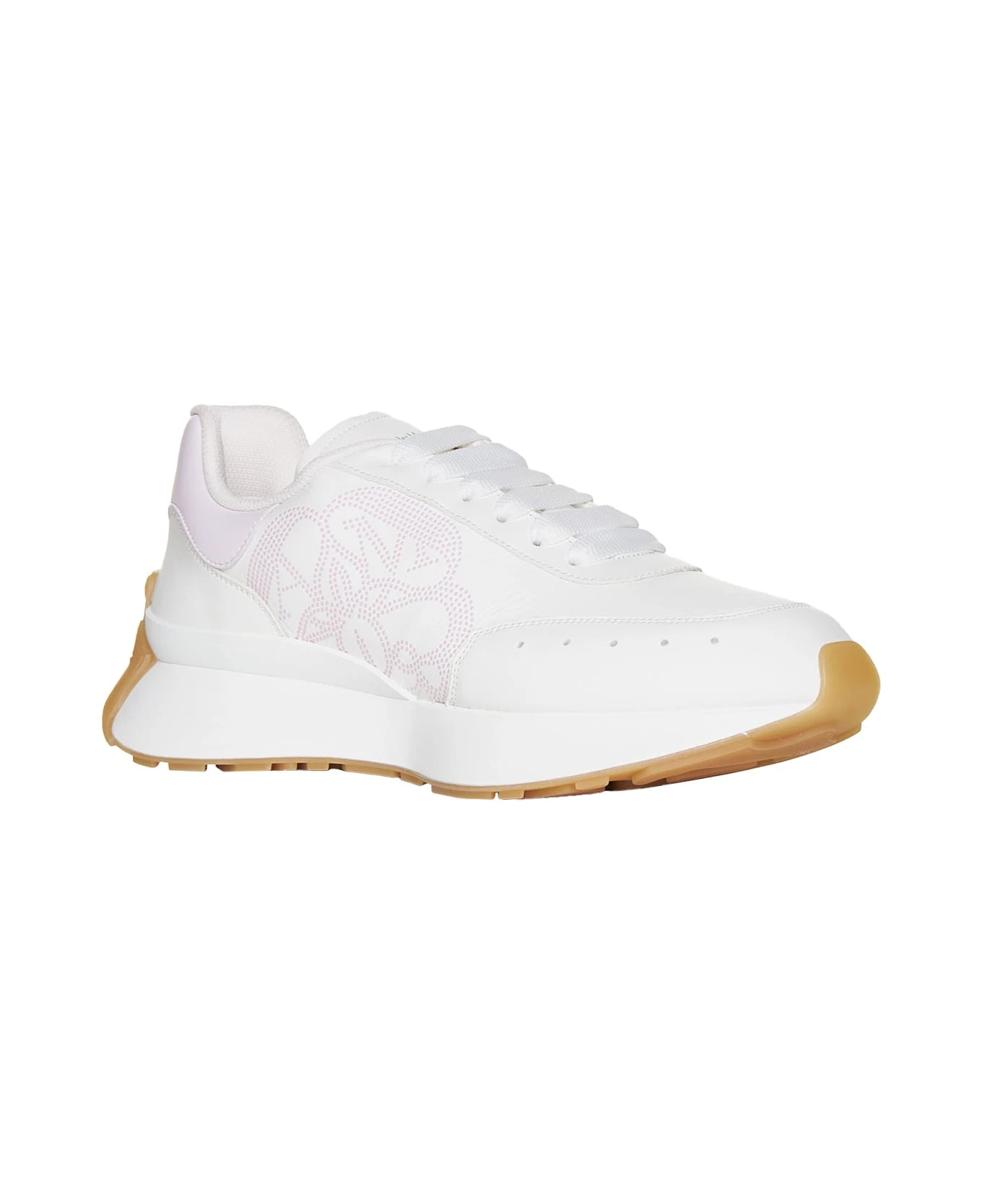 White and light pink Sprint Runner sneakers by Alexander McQueen made from nappa leather featuring a mixed material upper, a round toe, white laces, a padded heel and tongue, a high frequency rubber Seal logo on one side and an Alexander McQueen signature on the heel. The oversized lightweight white rubber sole features a subtle contrasting layer of colour. Extra white laces are included. In order to reduce our environmental impact and cotton consumption, we have decided to discontinue supplying the trainer bag. Exact fit.