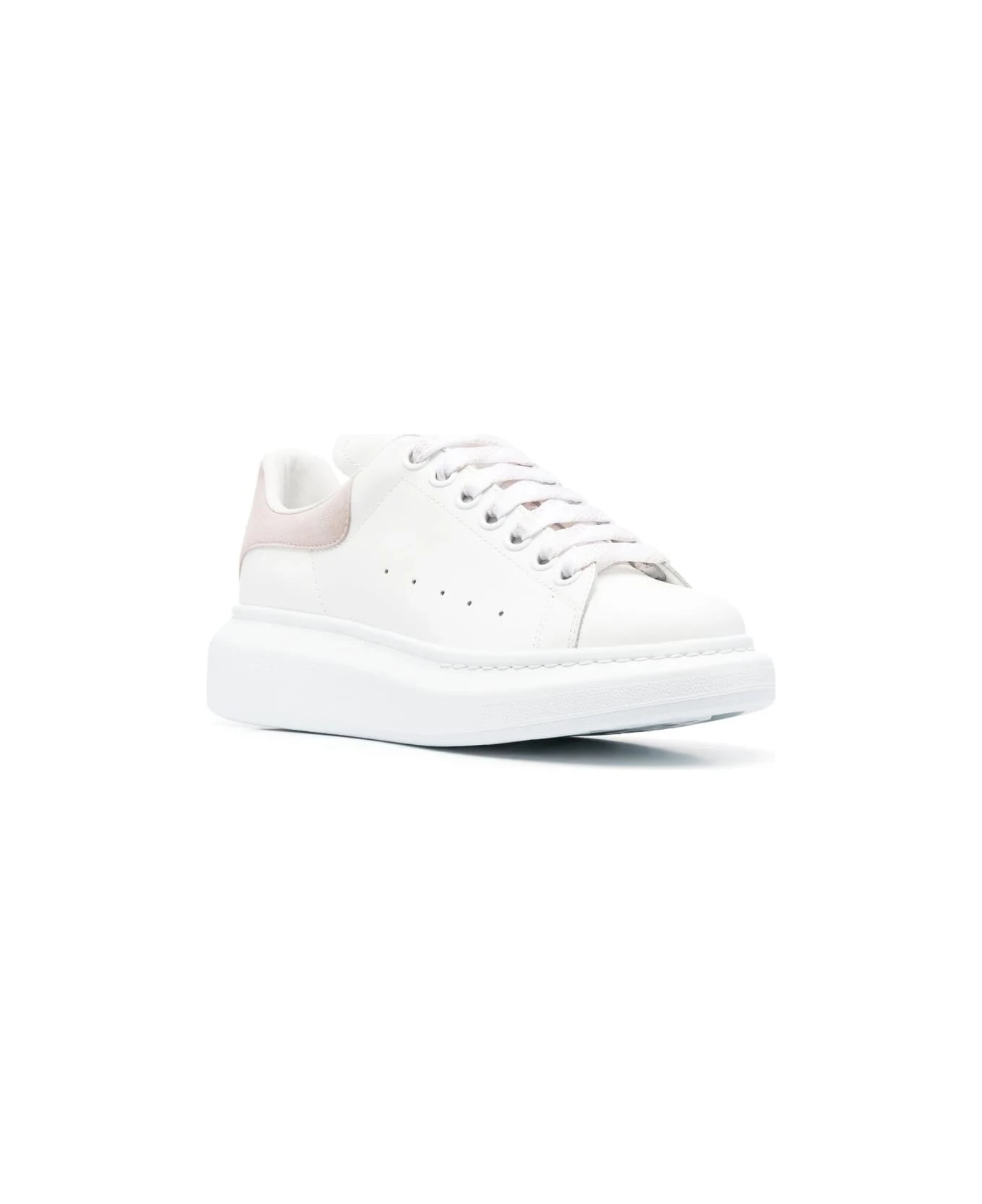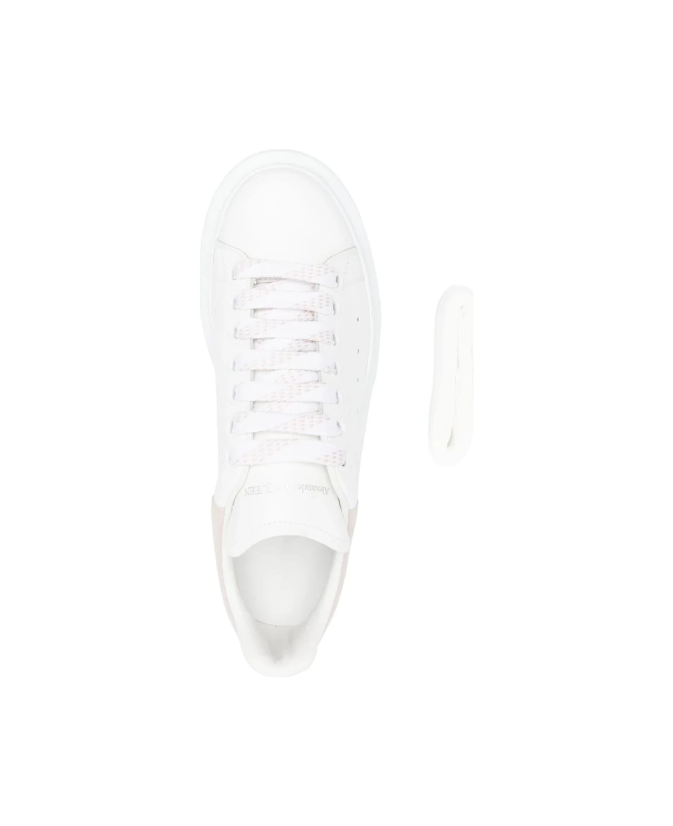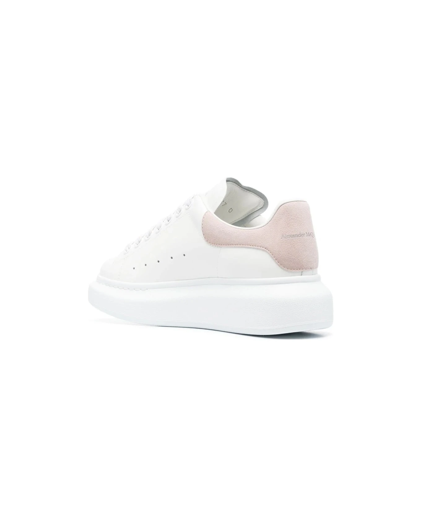 Oversized sneakers for women by Alexander McQueen made of smooth white leather with patchouli-coloured suede spoiler enriched with silver Alexander McQueen logo. Iconic model of the brand characterized by round toe, front lacing, white and pink wide flat laces, front tongue with Alexander McQueen logo and oversized white rubber sole. Supplied with an extra pair of white laces. To reduce the environmental impact and the consumption of cotton, the brand has chosen not to accompany sneakers with a dust bag anymore.