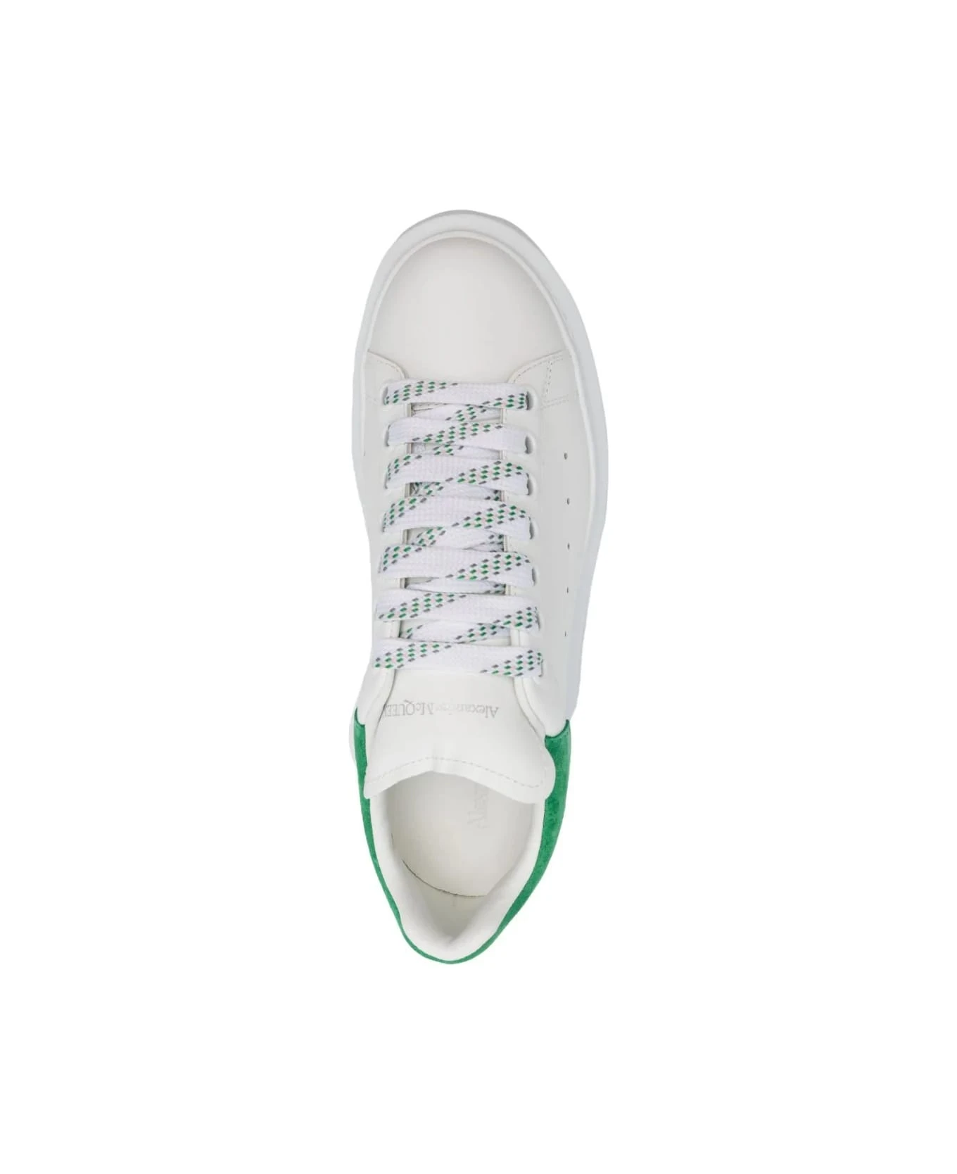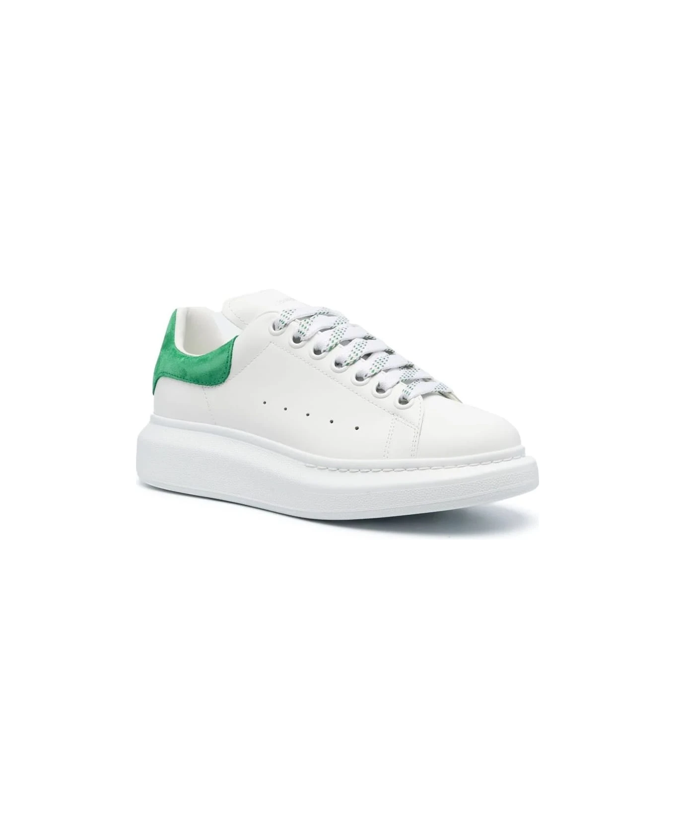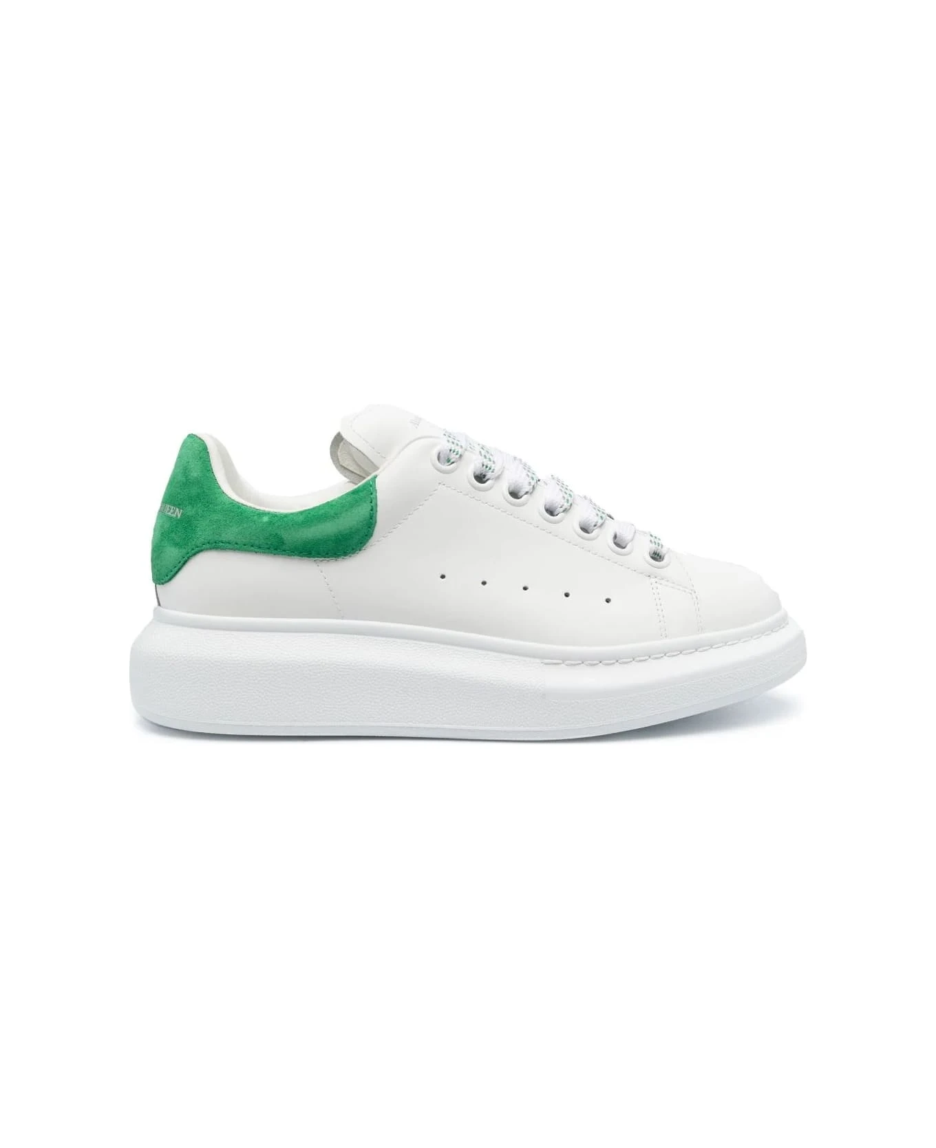 Oversized sneakers for women by Alexander McQueen made of white smooth calf leather with bright green suede spoiler. Model with front lacing, two-tone flat laces, oversized white rubber sole and silver Alexander McQueen logo on the spoiler and on the front tongue. A pair of extra white laces included. To reduce the environmental impact and the consumption of cotton, the brand has decided to no longer provide the special bag for sneakers.