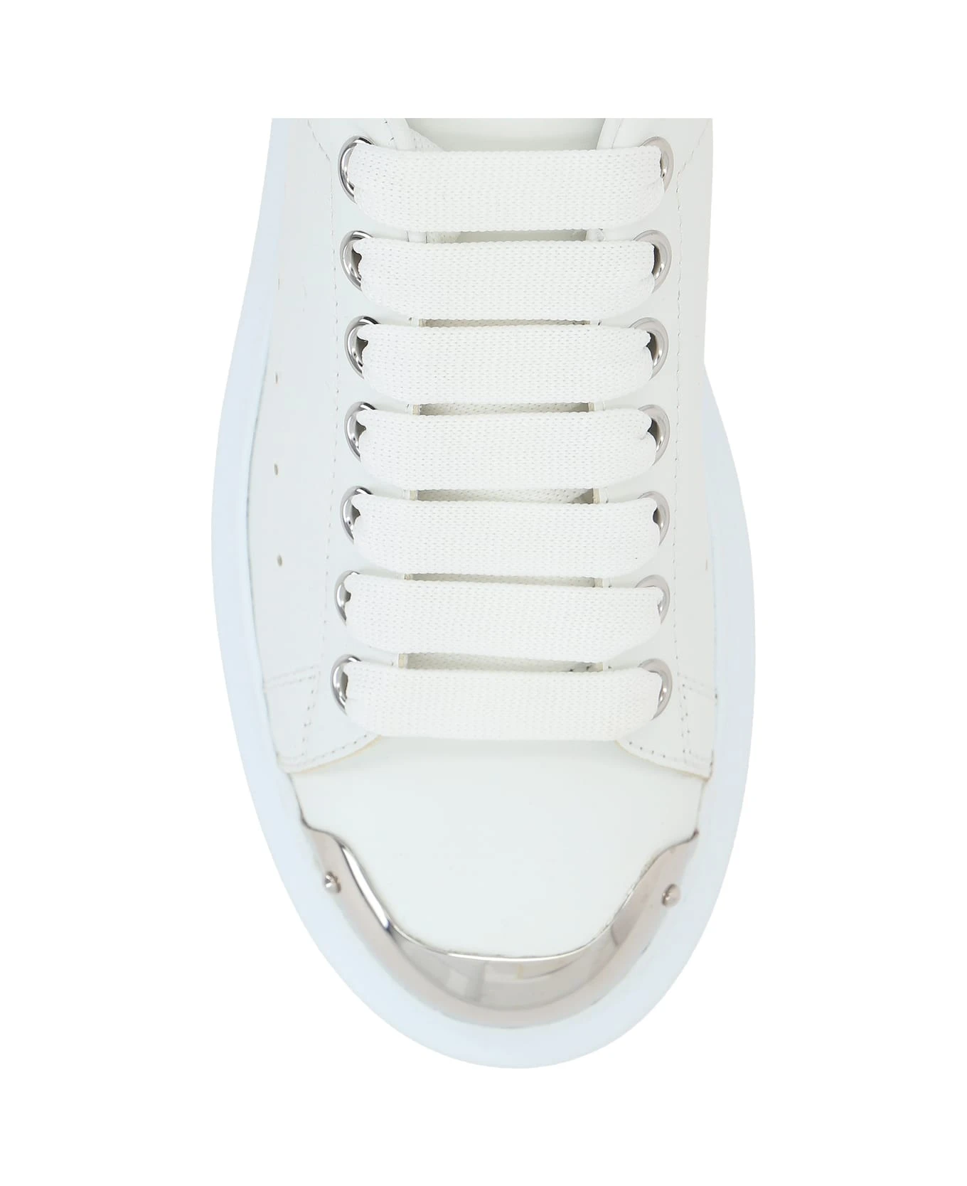 Oversized sneakers for women by Alexander McQueen crafted from white Larry leather with a spoiler embellished with the unmistakable embossed logo. The details include: leather lining, lace-up closure, embossed logo on tongue, oversized rubber sole and round toe with silver-tone metal toe cap. Replacement white laces are included.