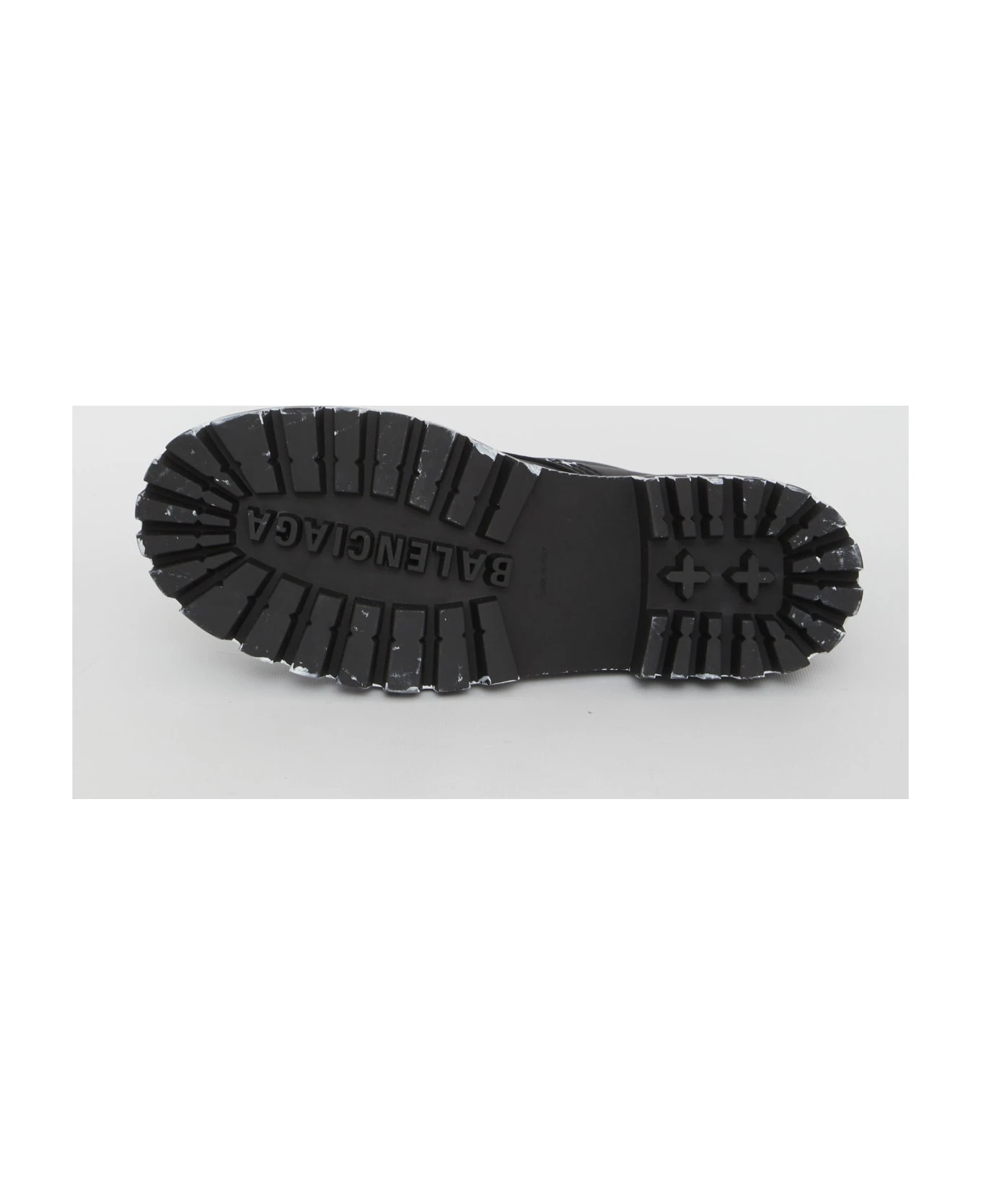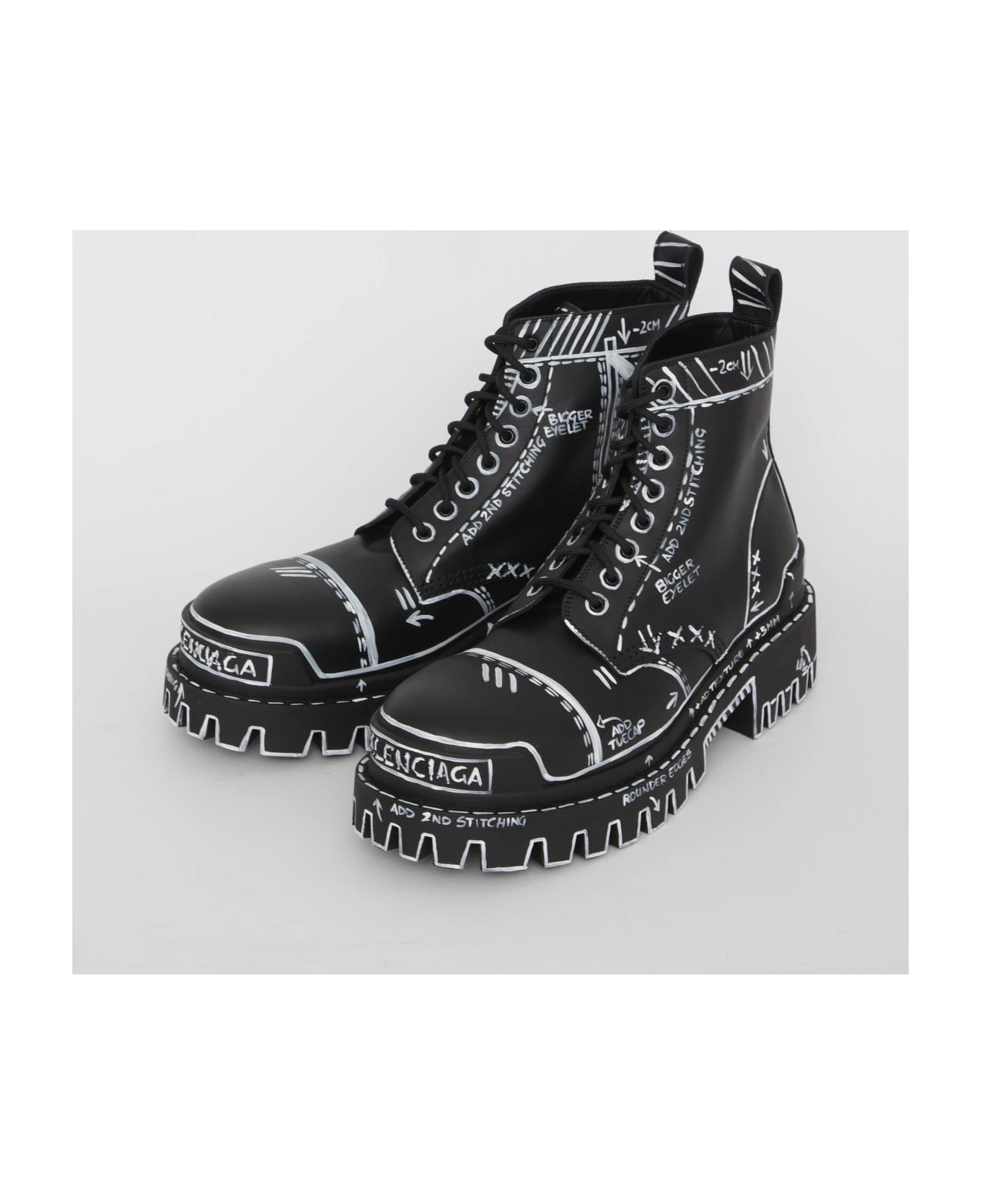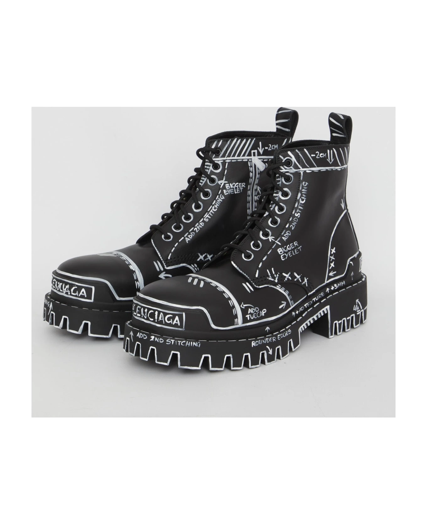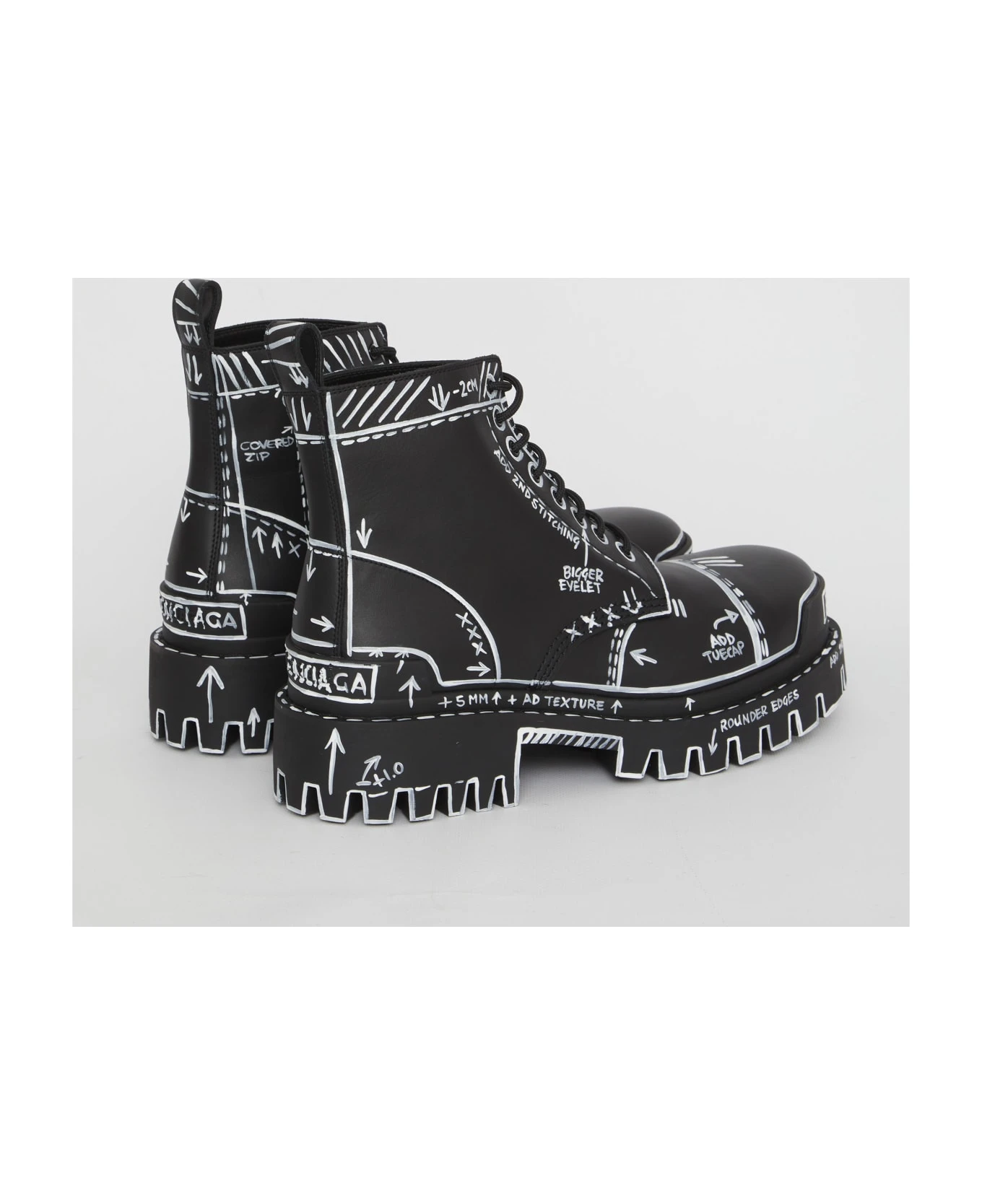 Strike Bootie L20 in black matt calfskin with all-over contrast sketches. They feature lace-up closure, embossed Balenciaga logo on the front and on the back, rear loop tab and rubber lug sole.