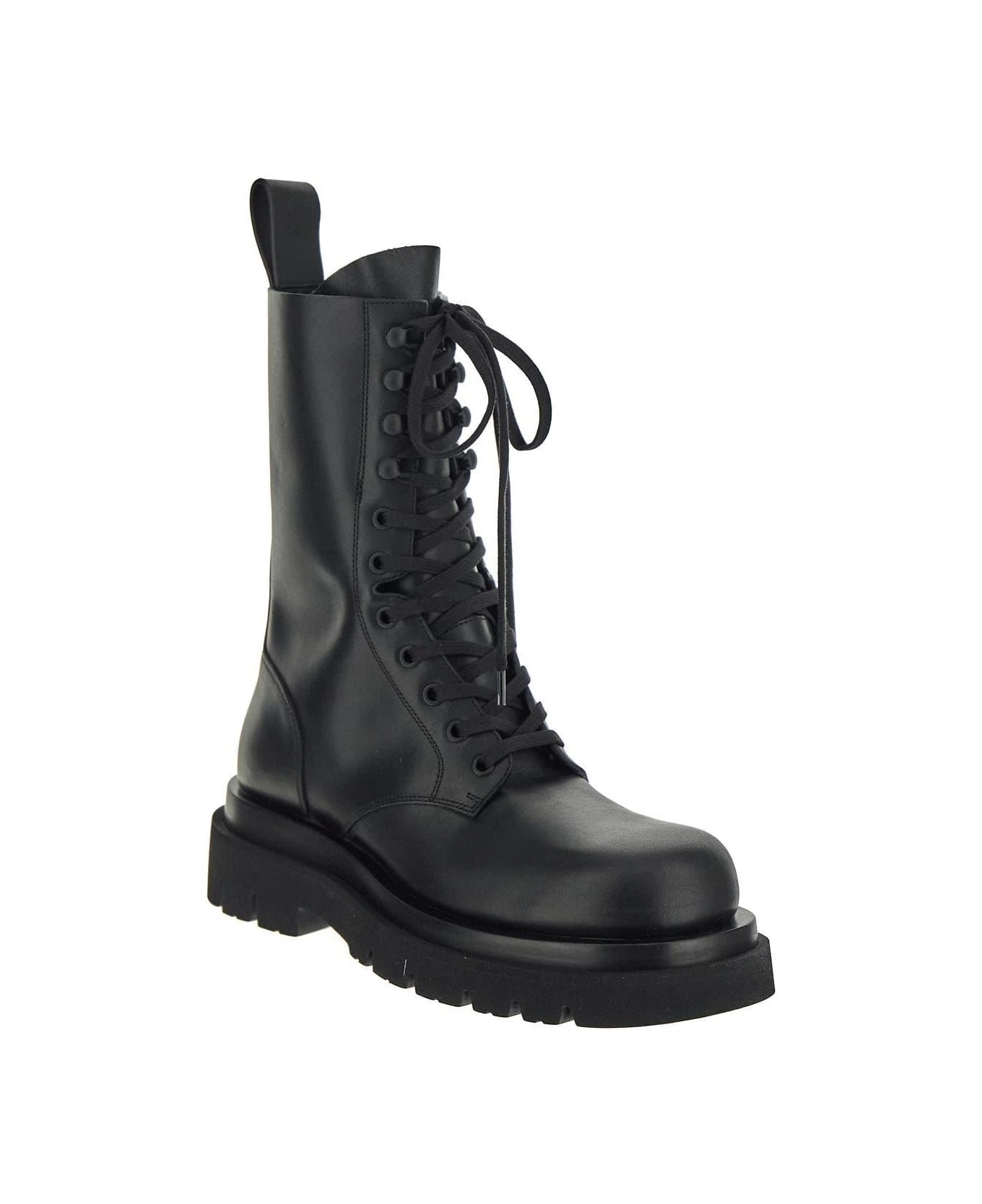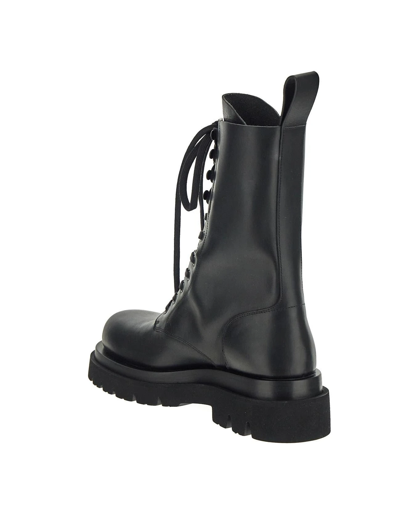 Bottega Veneta boots in black leather with round toe. The item features by chunky rubber sole, and lace-up closure.