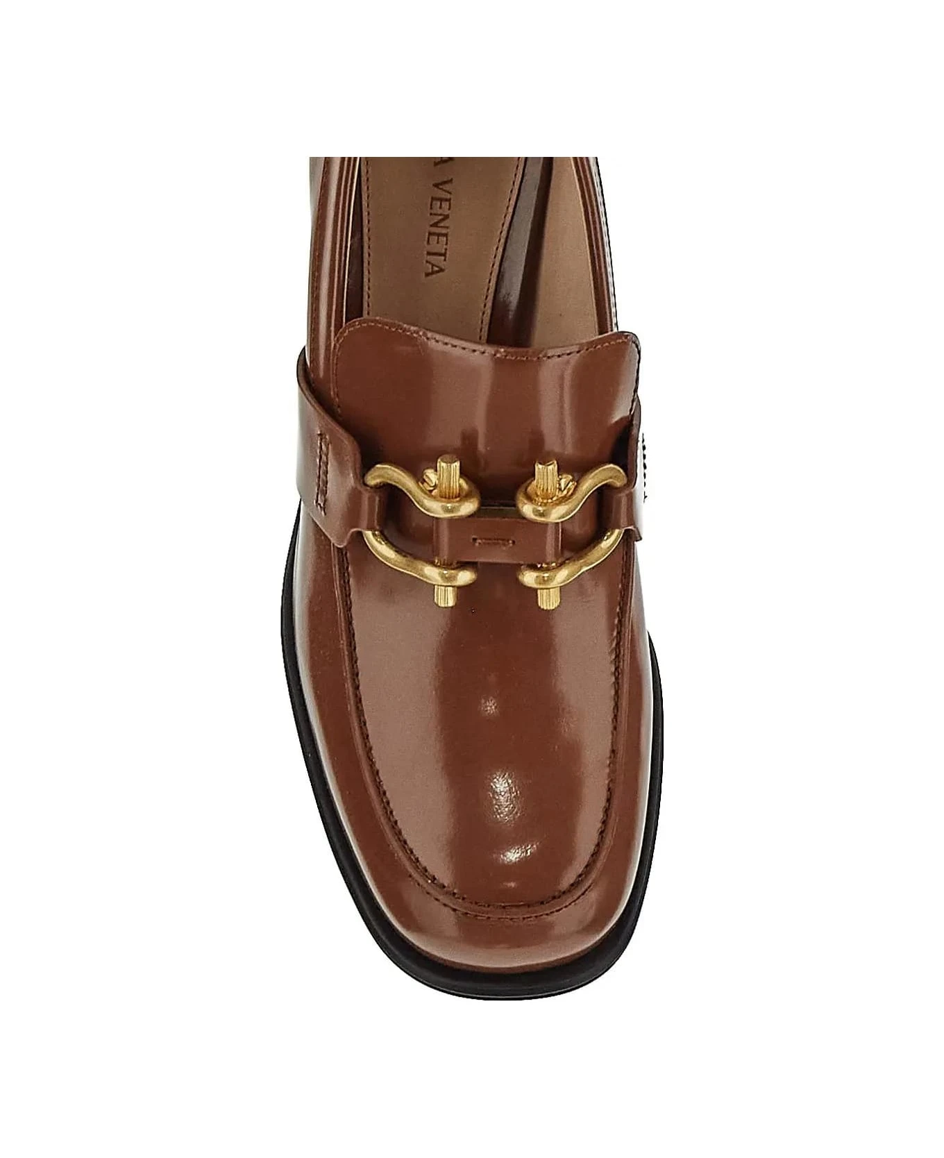 Bottega Veneta pump in brown sugar glossy leather with golden-finish metal knotted plaque on the upper, round toe and stitching details.