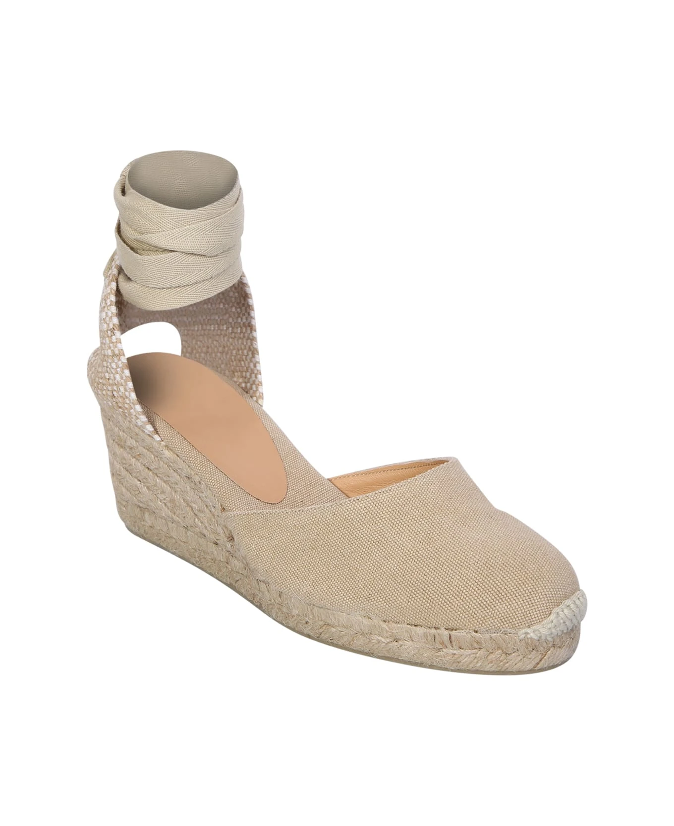 Almond toe. Tie fastening ankle strap. Branded insole. High wedge. Braided edge. Color: sand