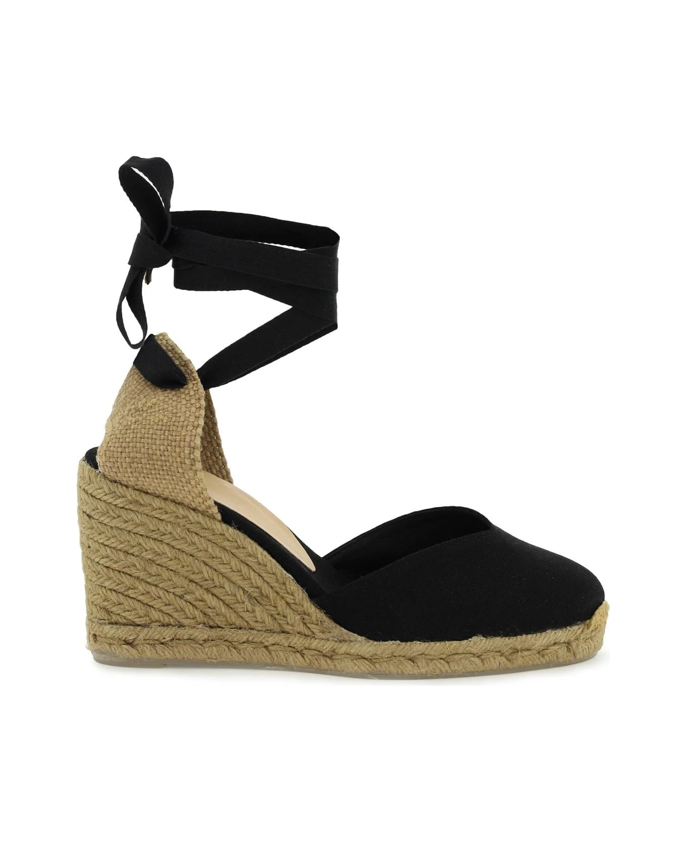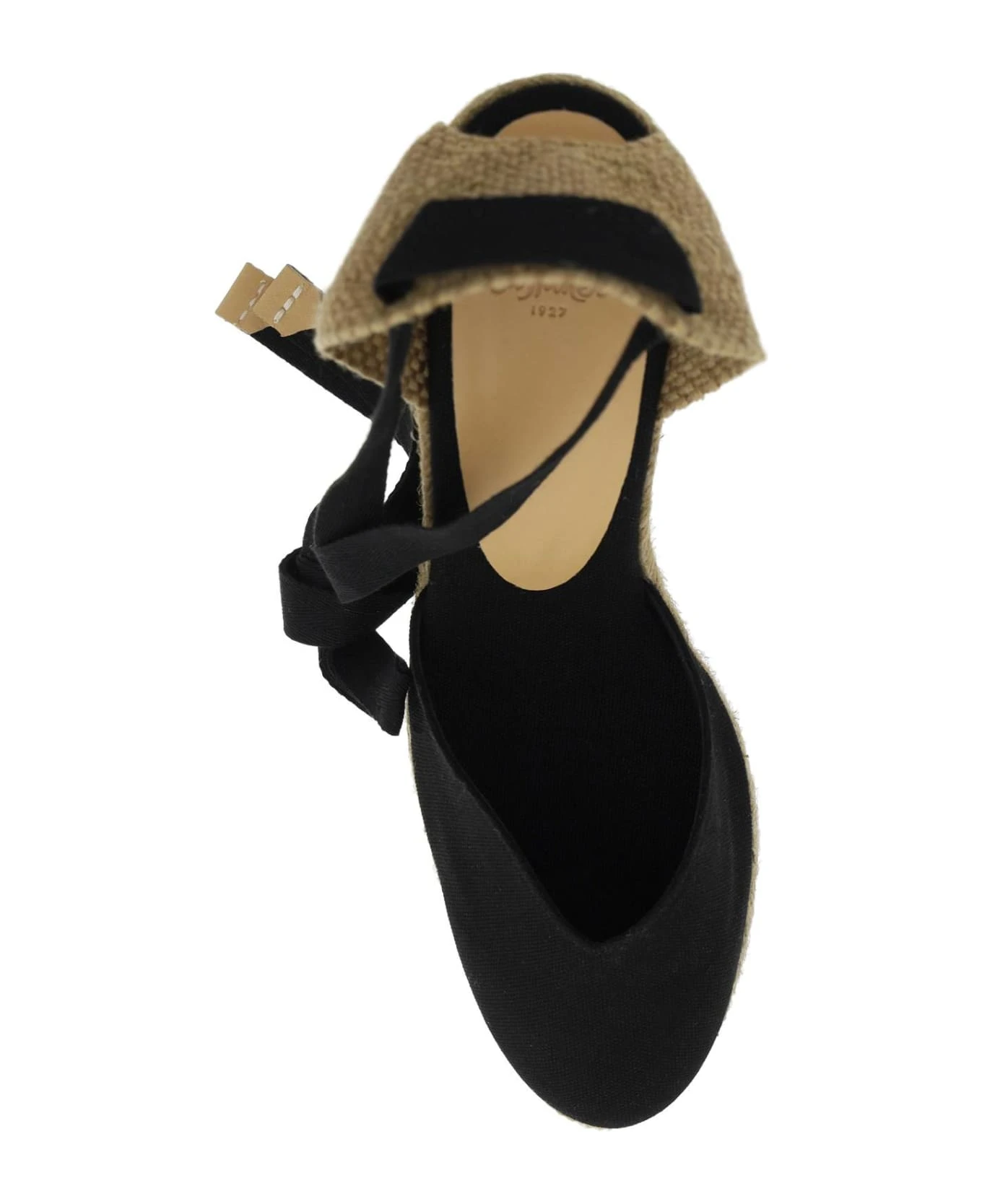 Chiara handmade espadrilles by Castaner with front canvas V-shaped upper and contrasting heel with ribbon tied at the ankle. Wedge covered in braided rope, canvas and leather interior, rubber sole.