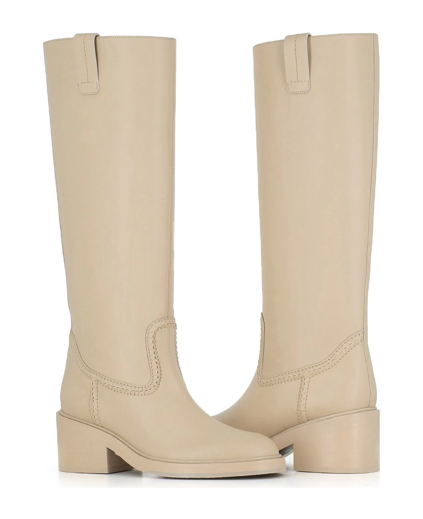 Beige soft leather over-the-knee boot Boot froom Chloè, featuring saddle stitching and an elongated almond-shaped toe. Leather fund with light notched rubber sole. Lined interior. Heel: 6 cm