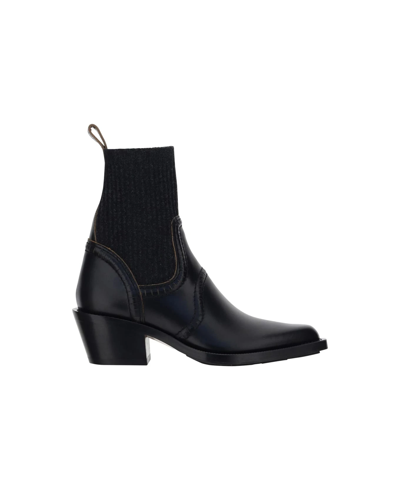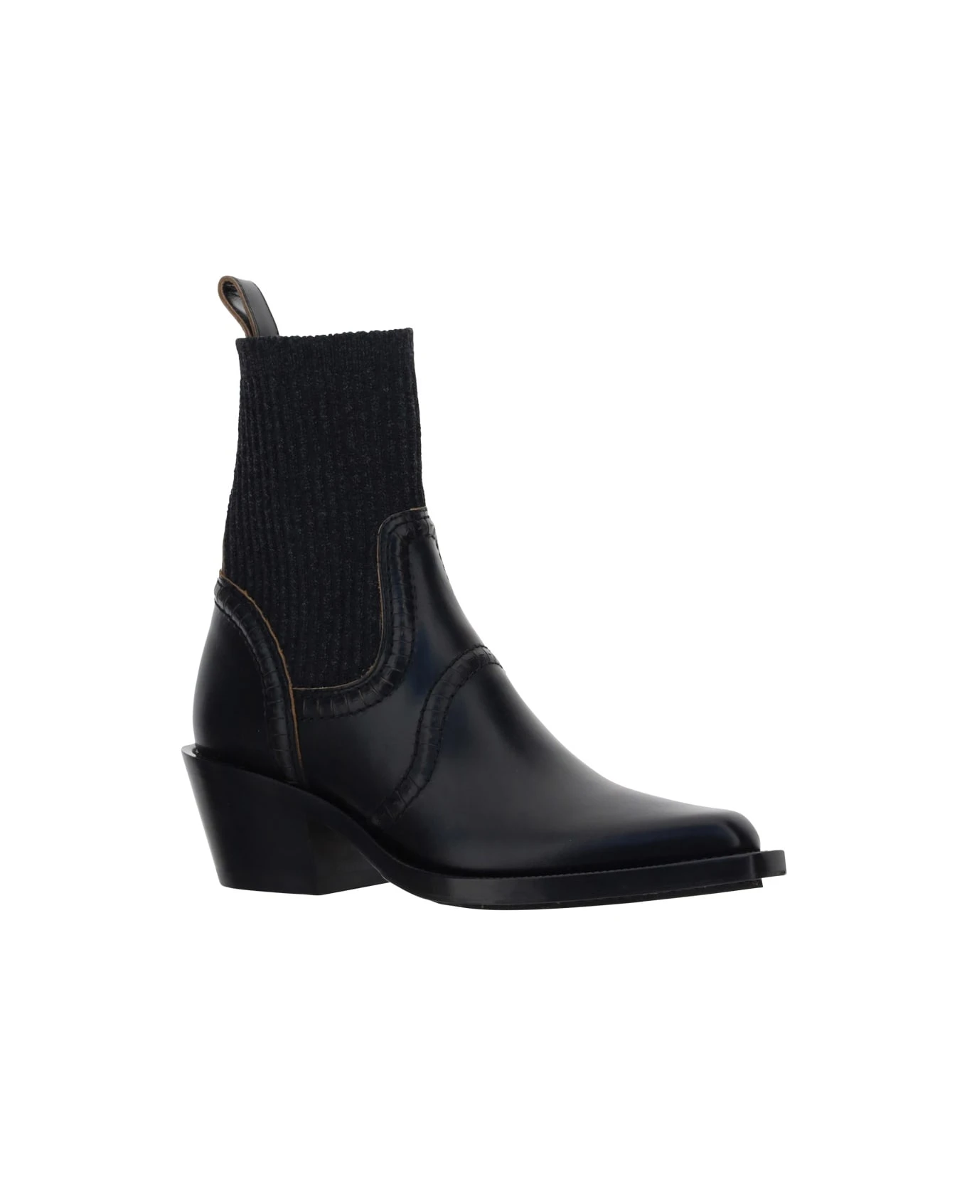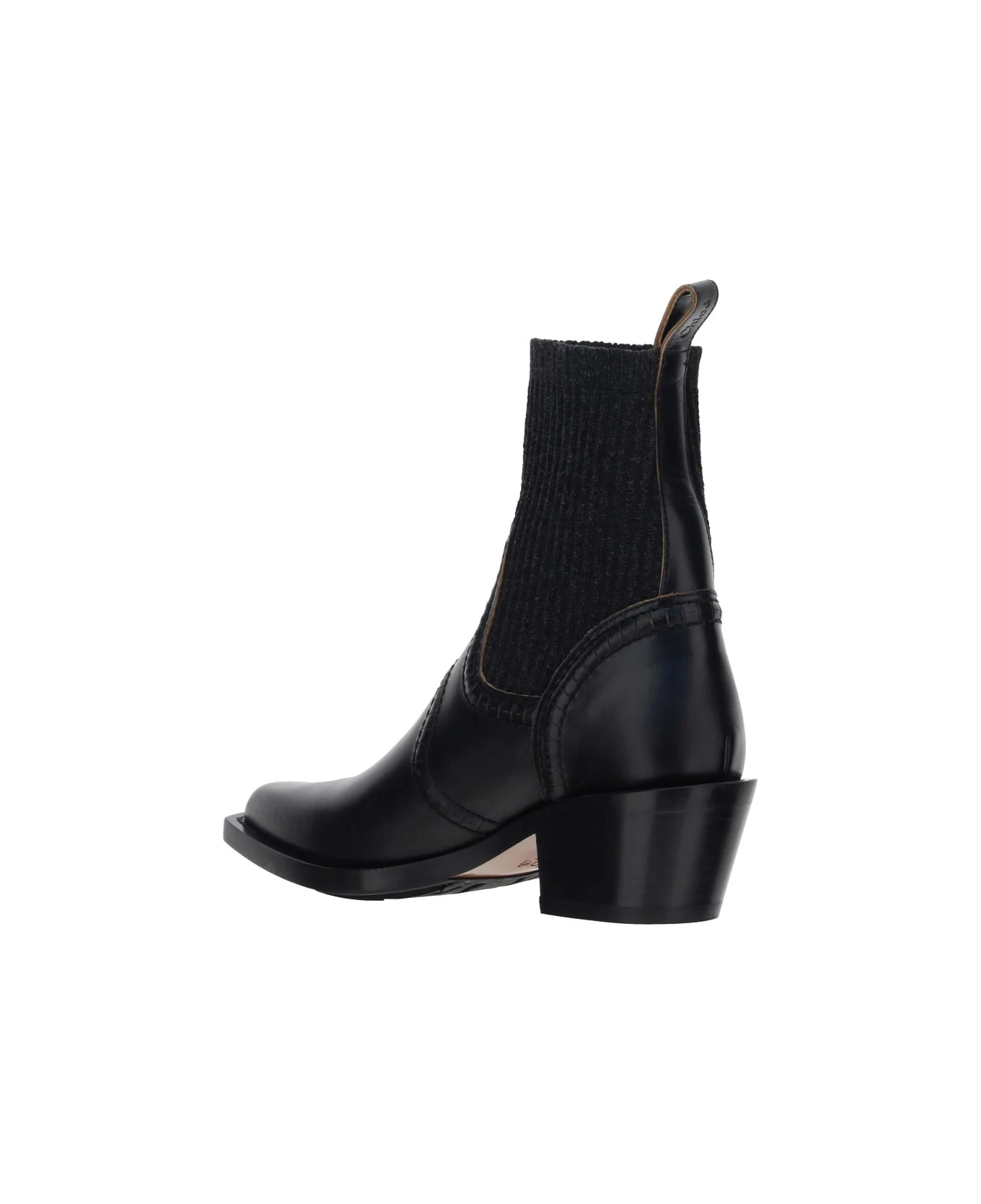 Calfskin nellie ankle boots by chloé, elongated toe, slight leather block heel, elastic ribbed cuff, pullback, contrast stitching and trim.