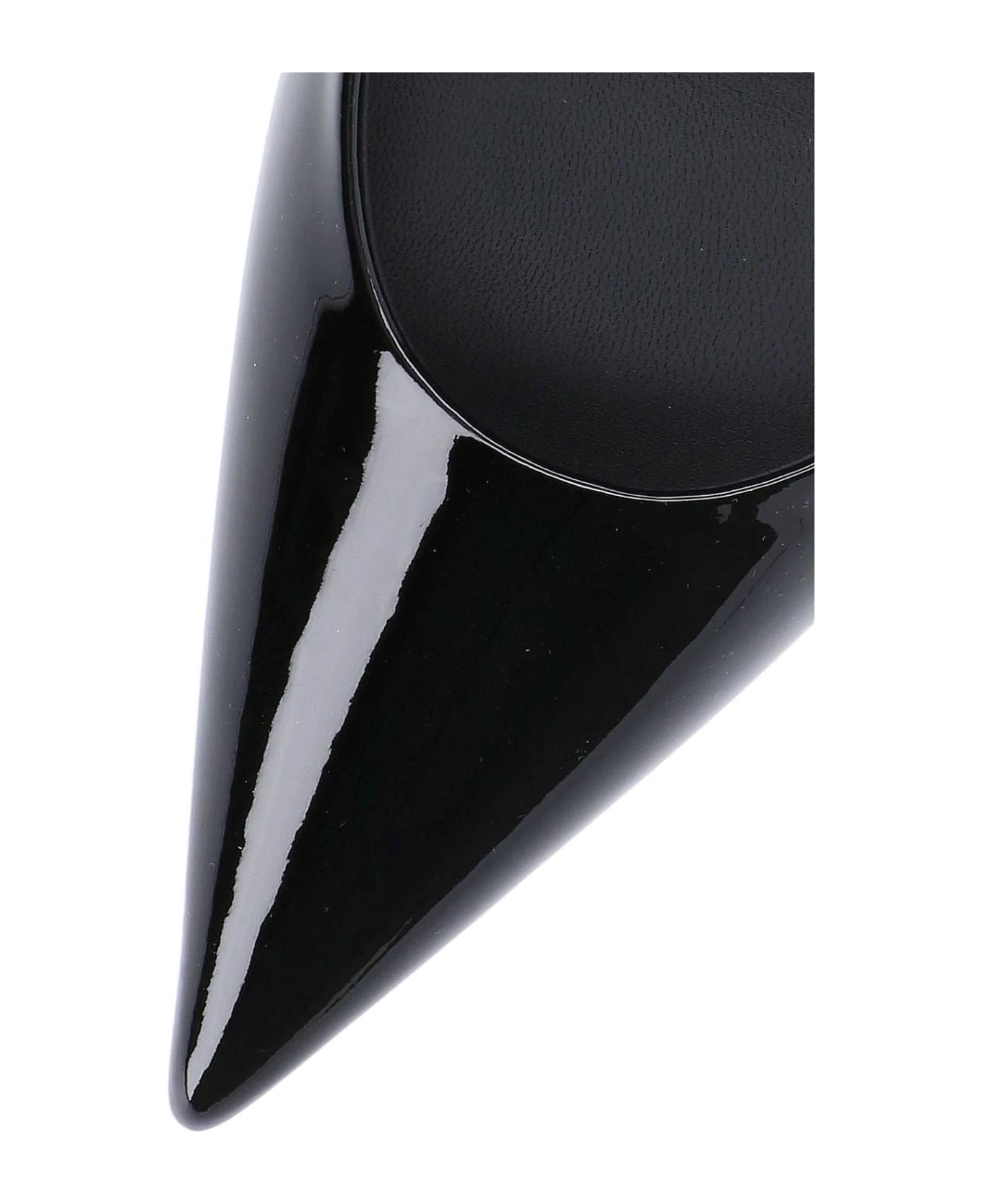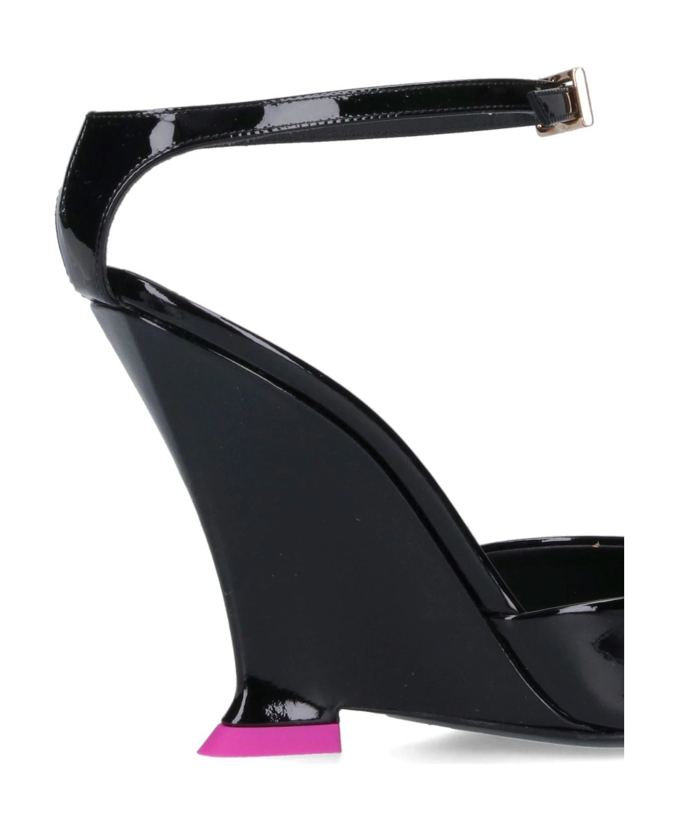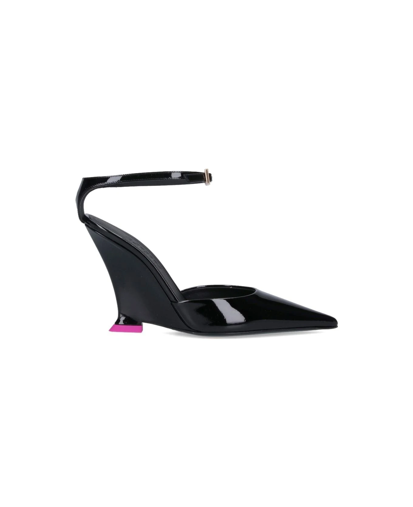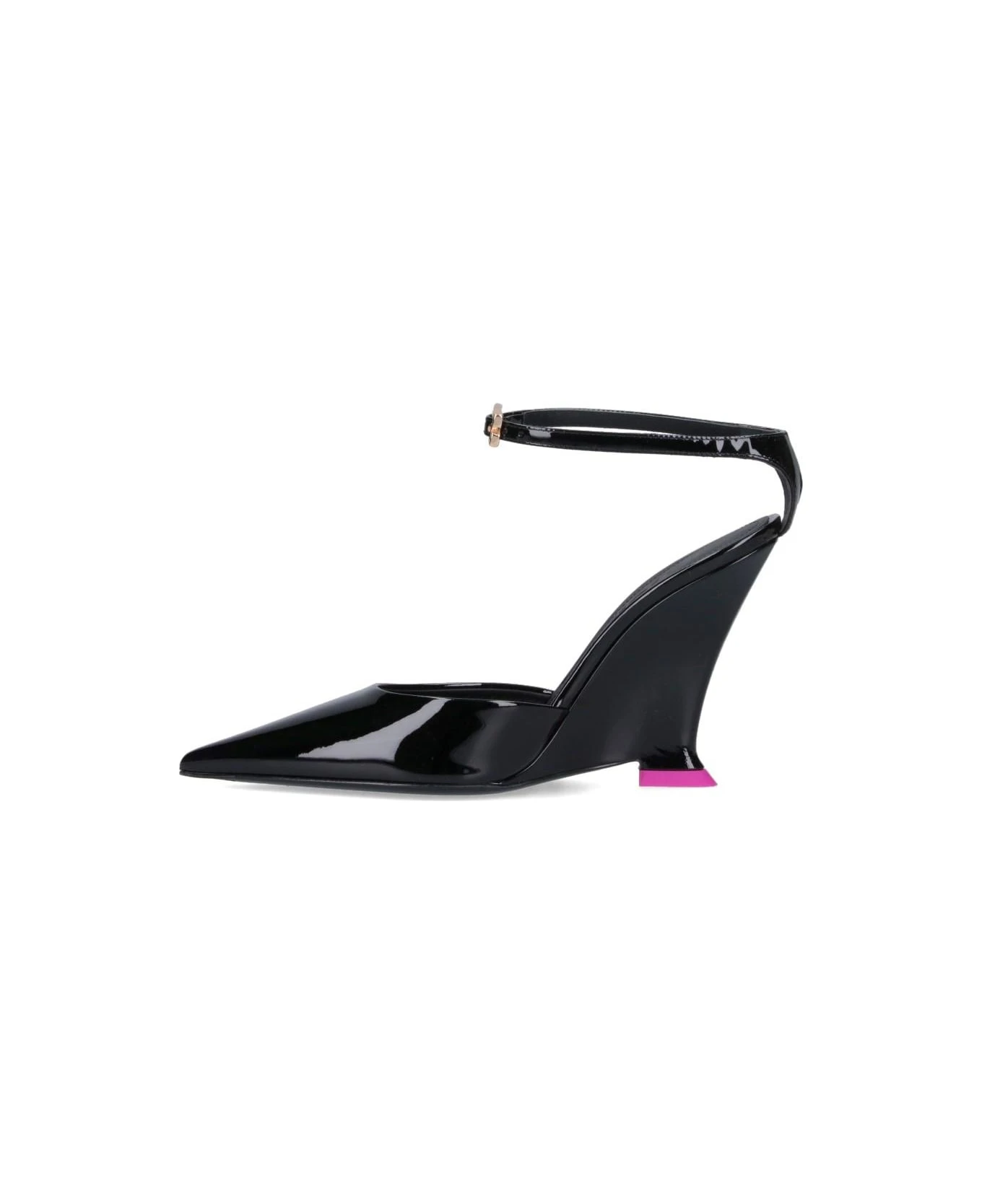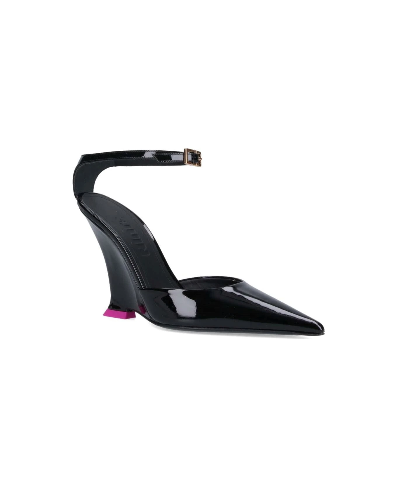 Pumps ‘Clea’ 3JUIN, in black patent leather, pointed, ankle strap closure, sculpted heel, pink detail, leather sole.