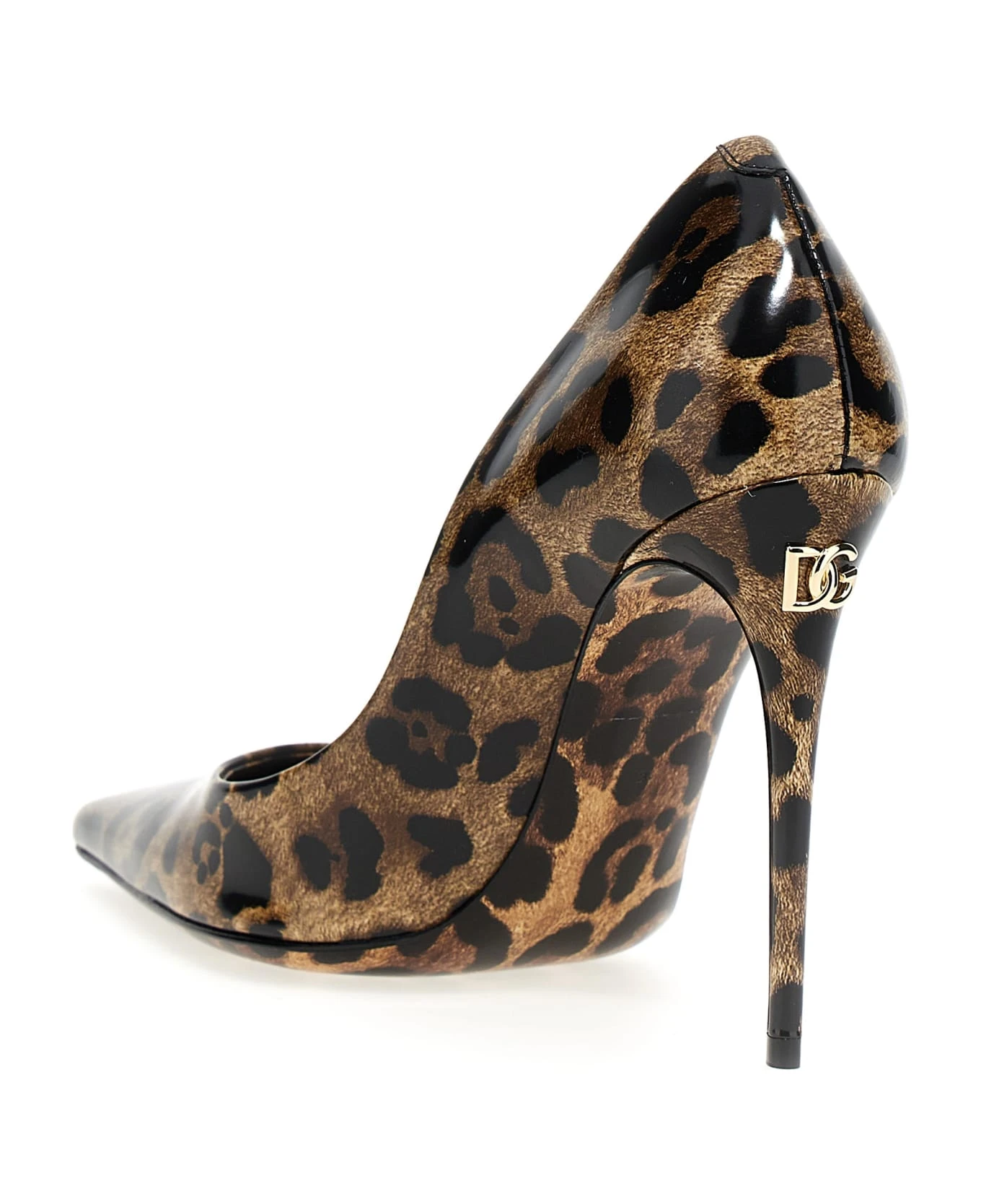 Animal print shiny leather pumps with logo application on heel.