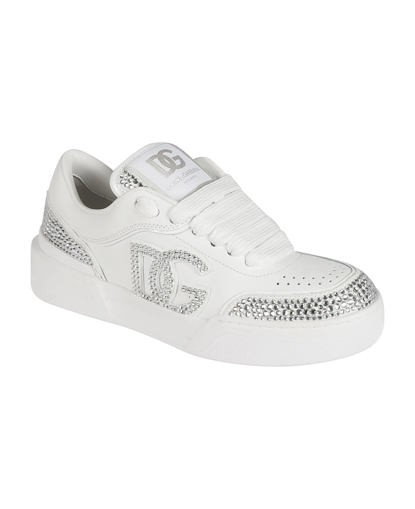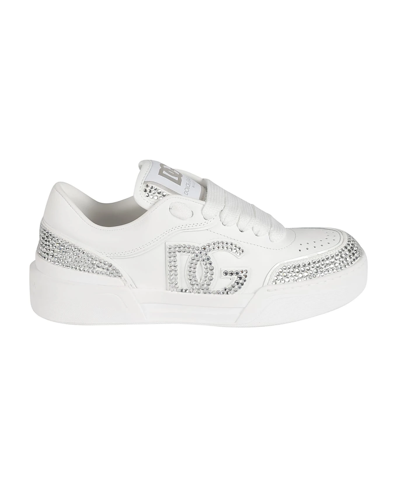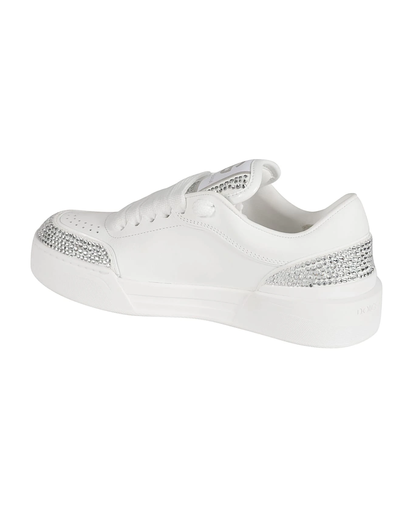 rhinestone-embellished leather sneakers from DOLCE & GABBANA featuring white, calf leather, rhinestone embellishment, panelled design and front lace-up fastening.