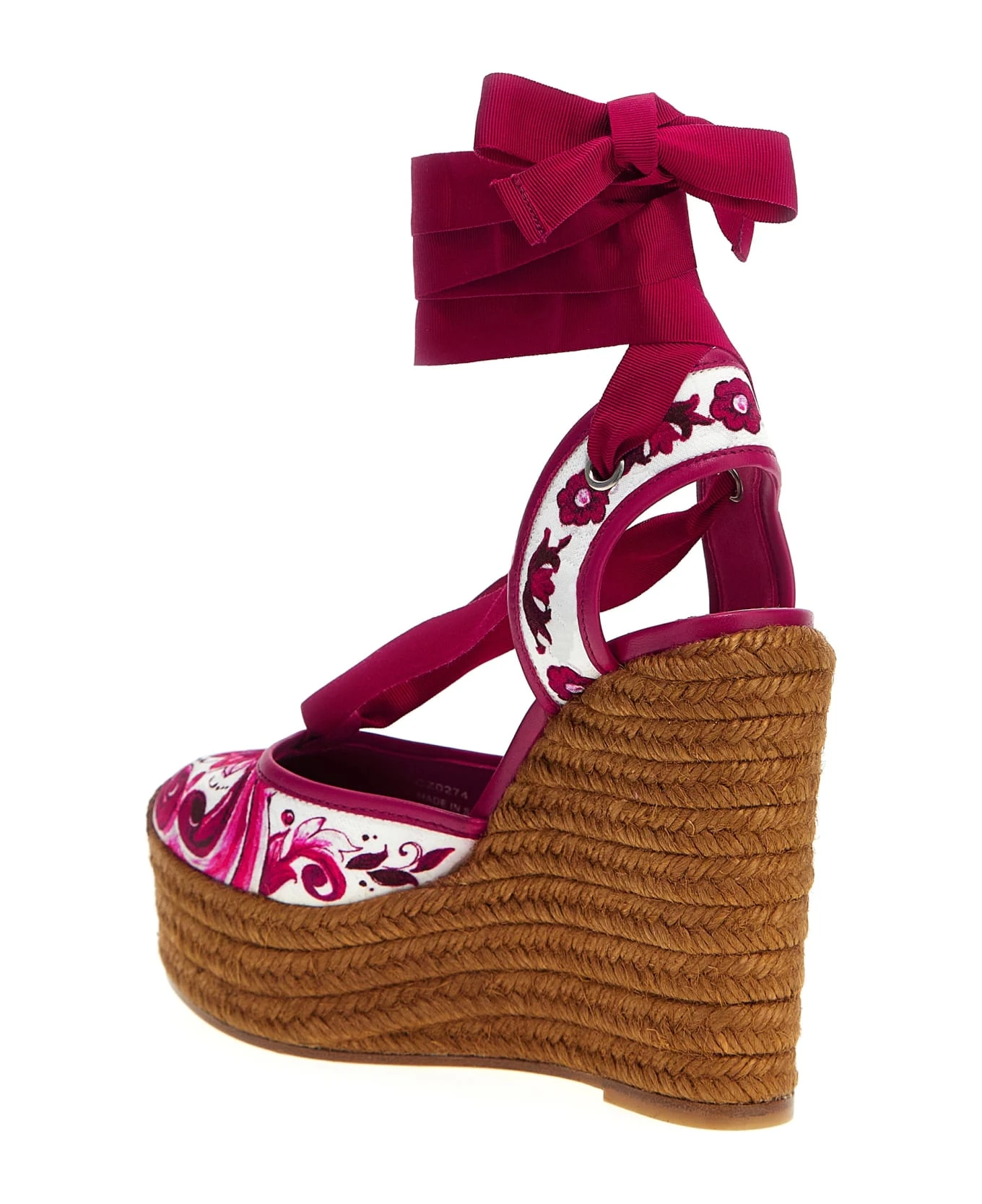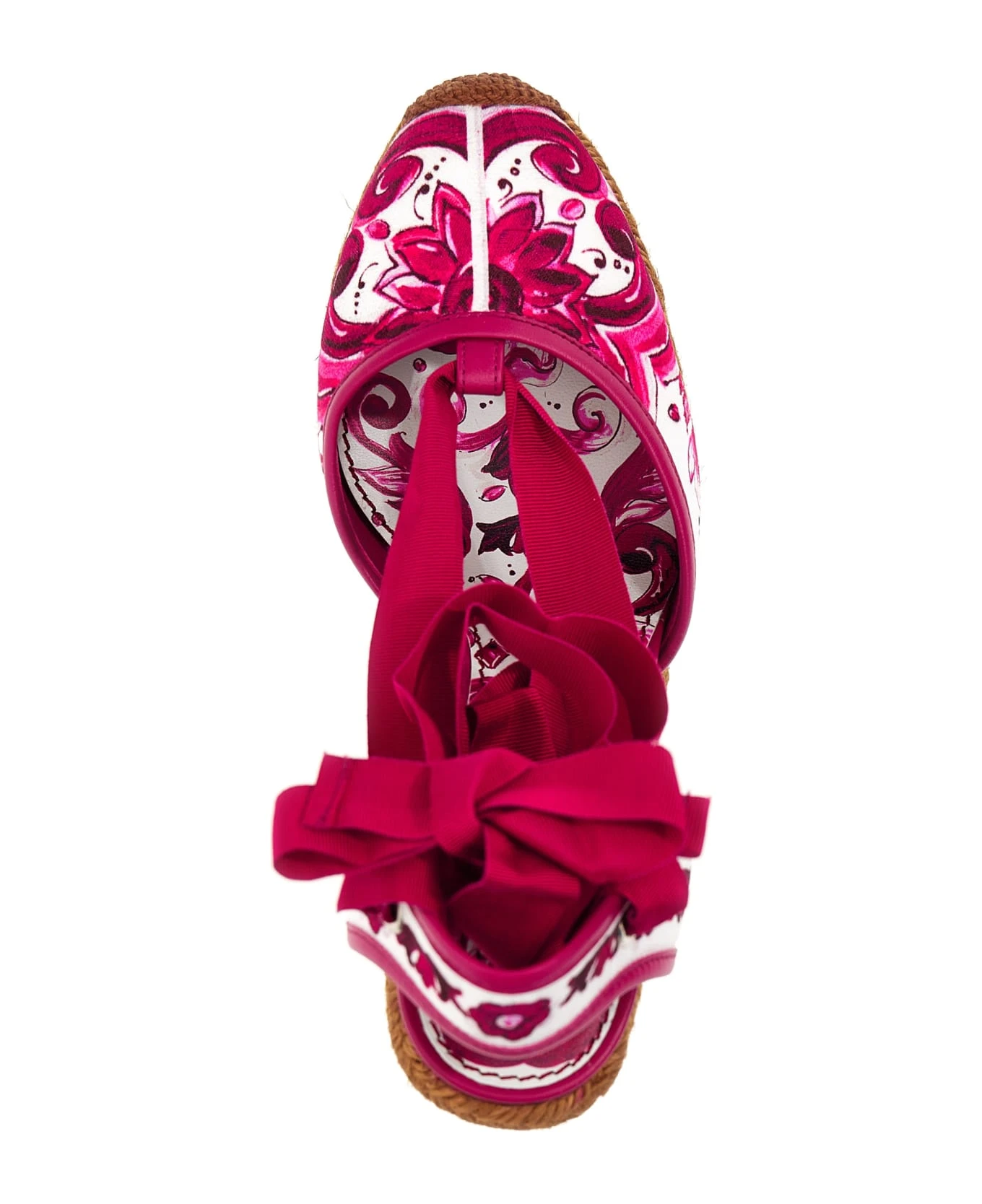 Woven rope bottom wedges in soft Maiolica-print brocade fabric with nappa trim, grosgrain ribbon, hollow wedge, printed kidskin footbed with logo label, woven rope bottom, and logo rubber sole.