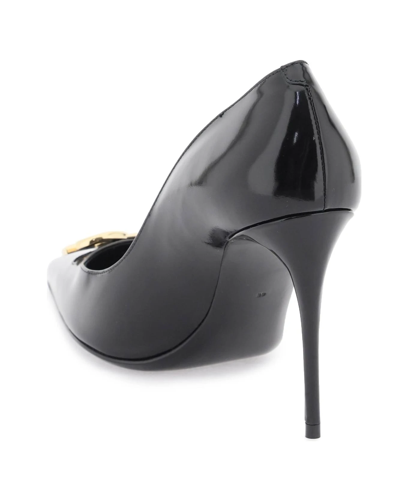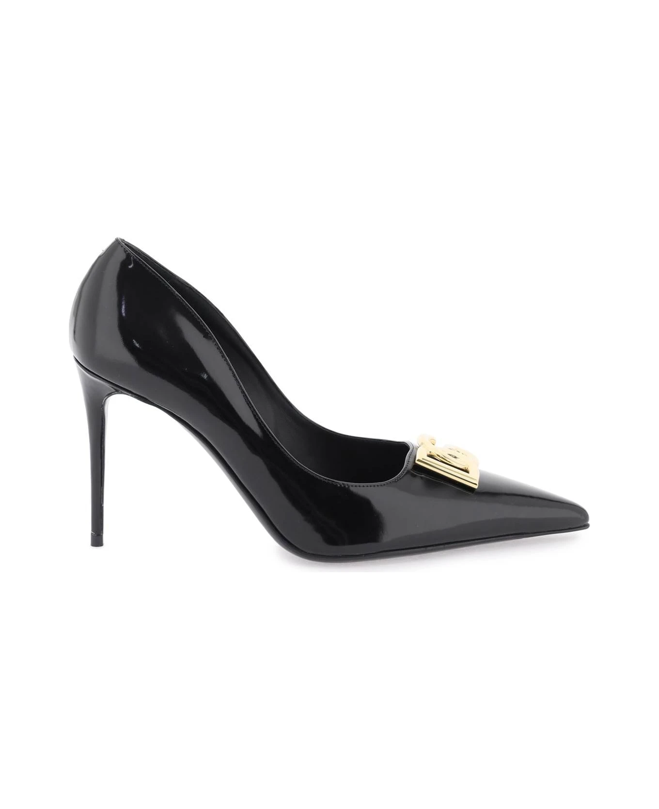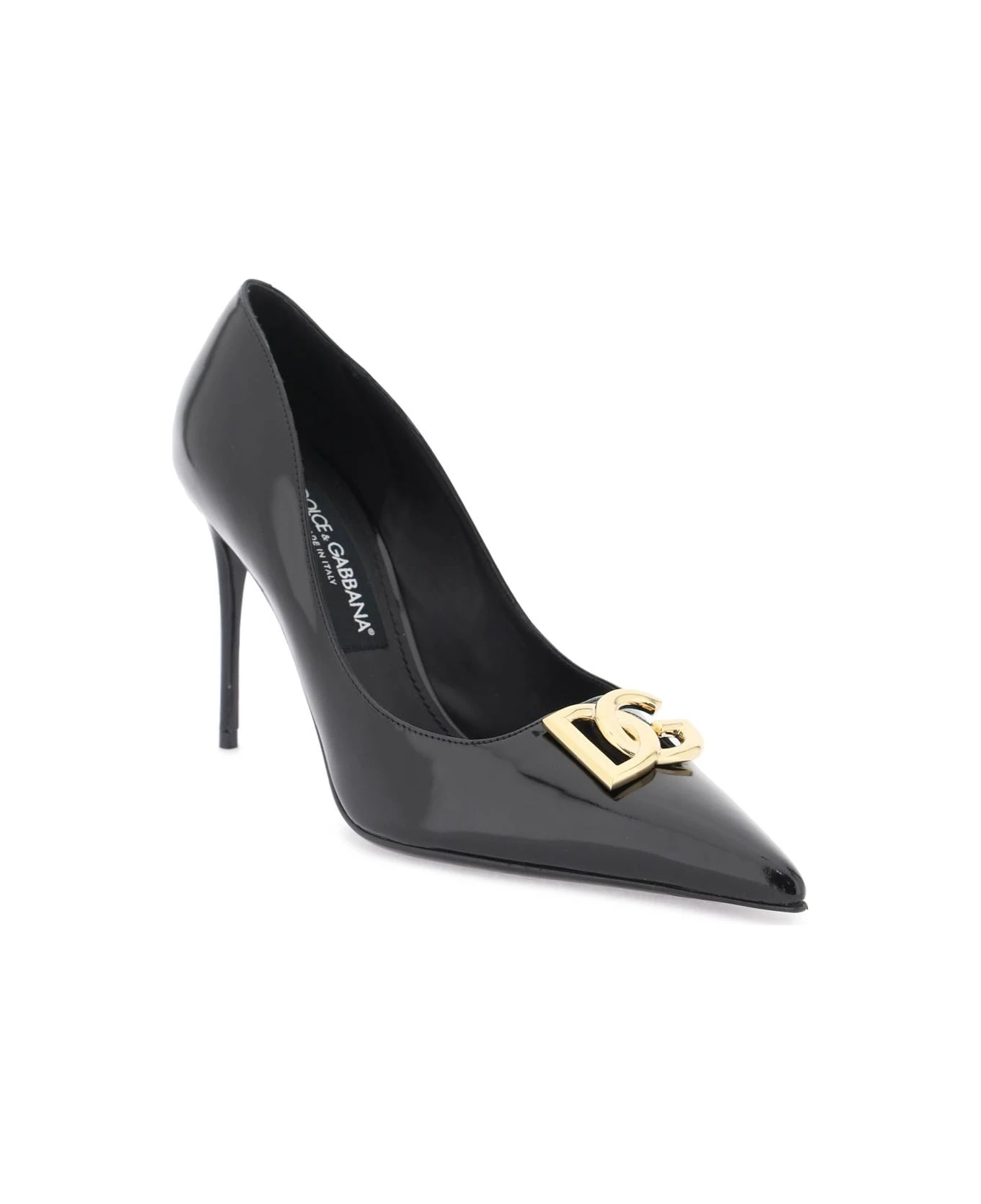Dolce & Gabbana pumps crafted in patent leather and embellished with gold metal DG monogram with cut-out applied to the toe. Leather footbed and leather sole.