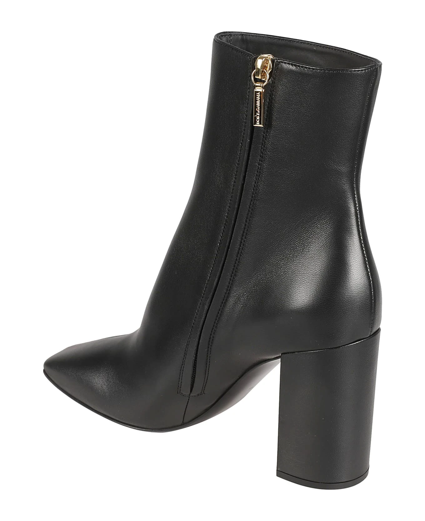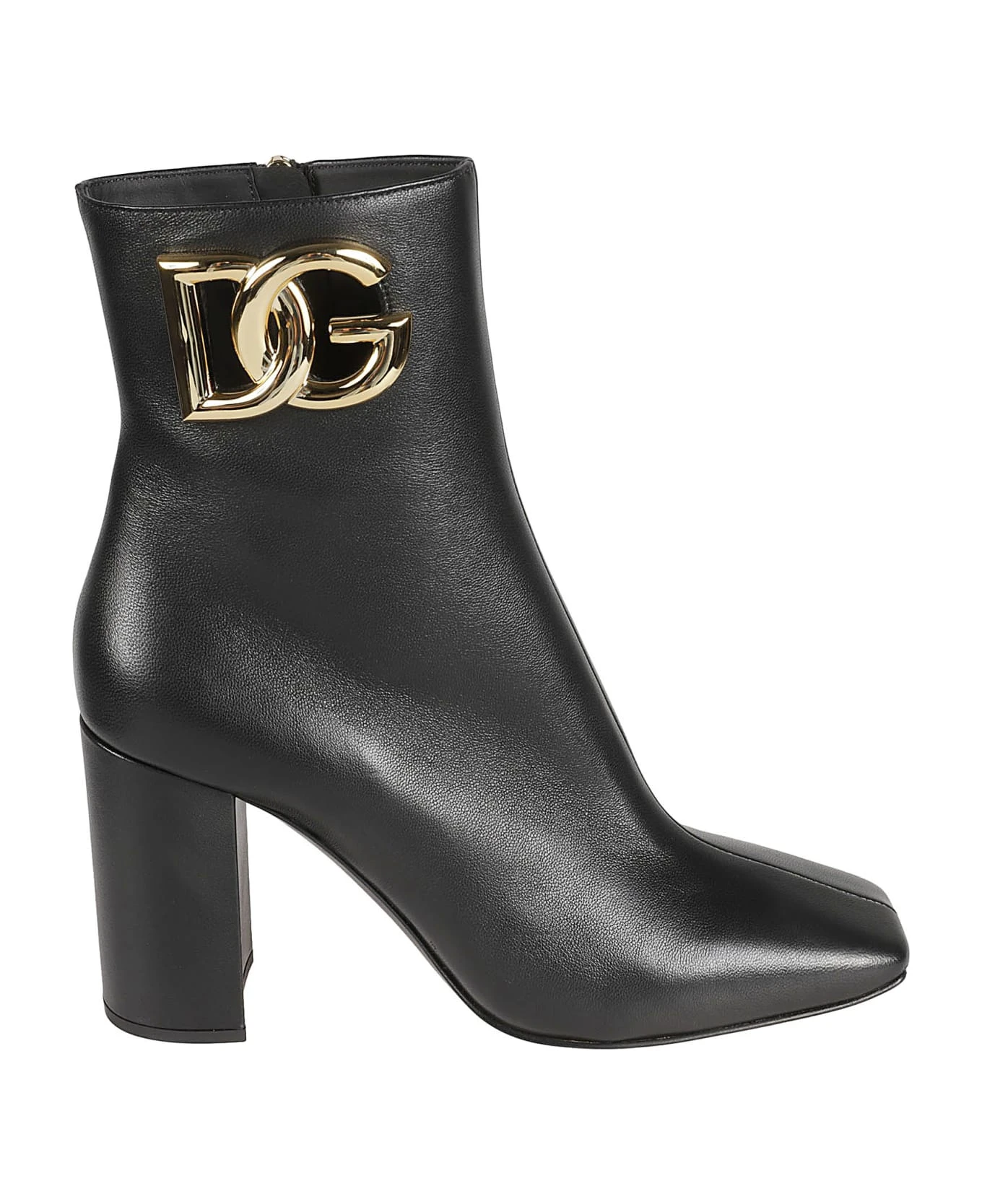 90mm logo-plaque leather boots from DOLCE & GABBANA featuring black, lambskin, logo plaque, gold-tone hardware, square toe, ankle-length, side zip fastening, branded leather insole and high block heel.