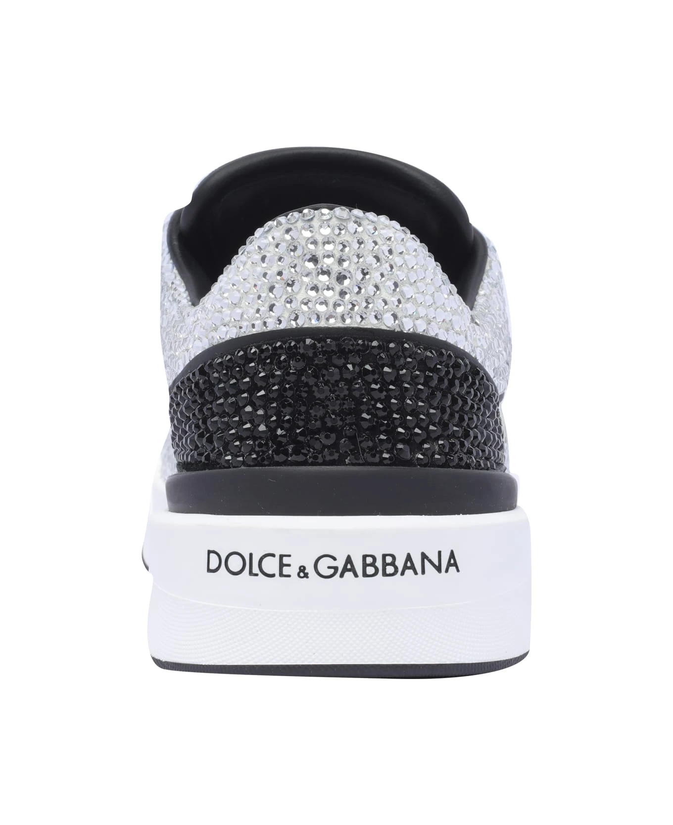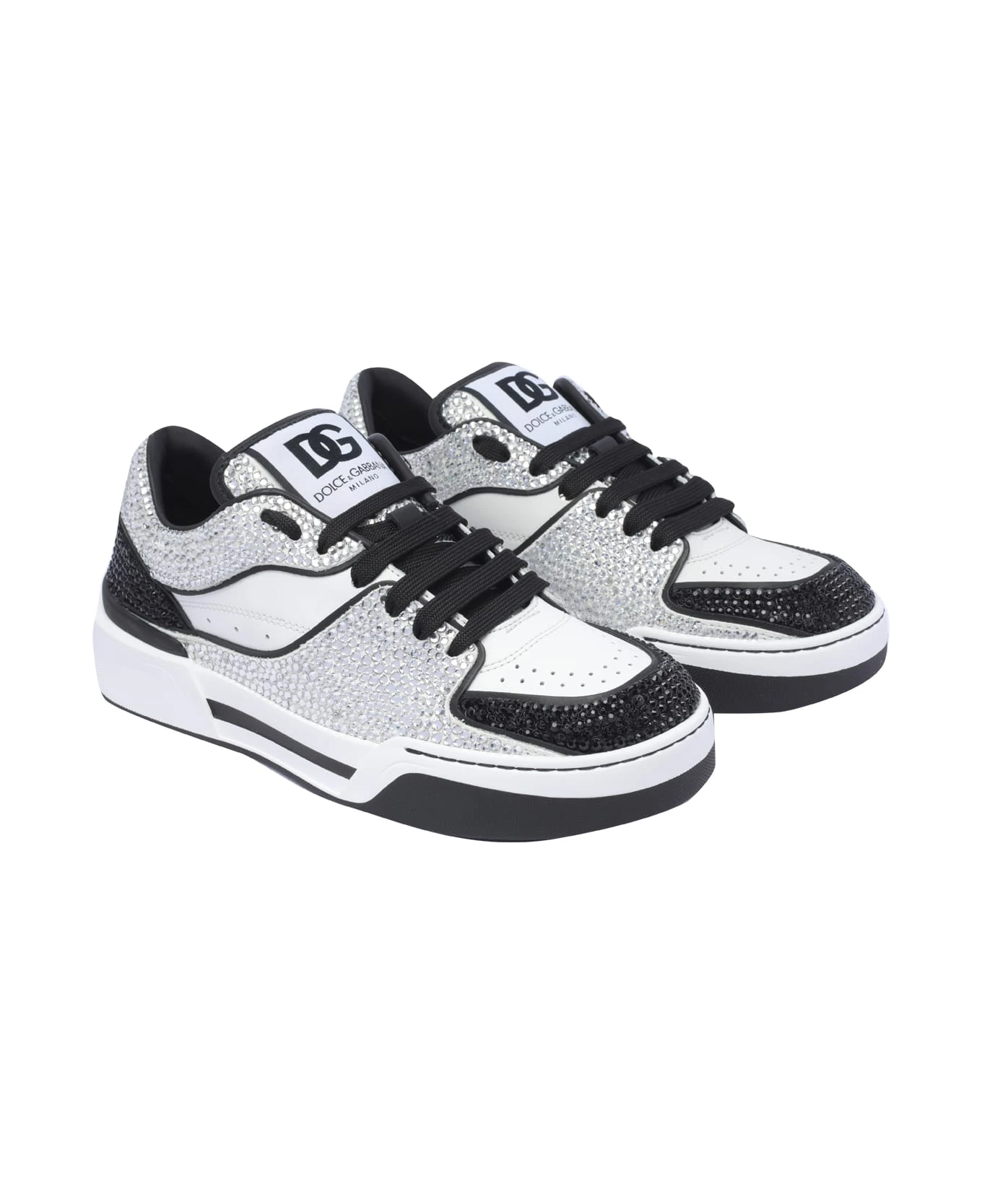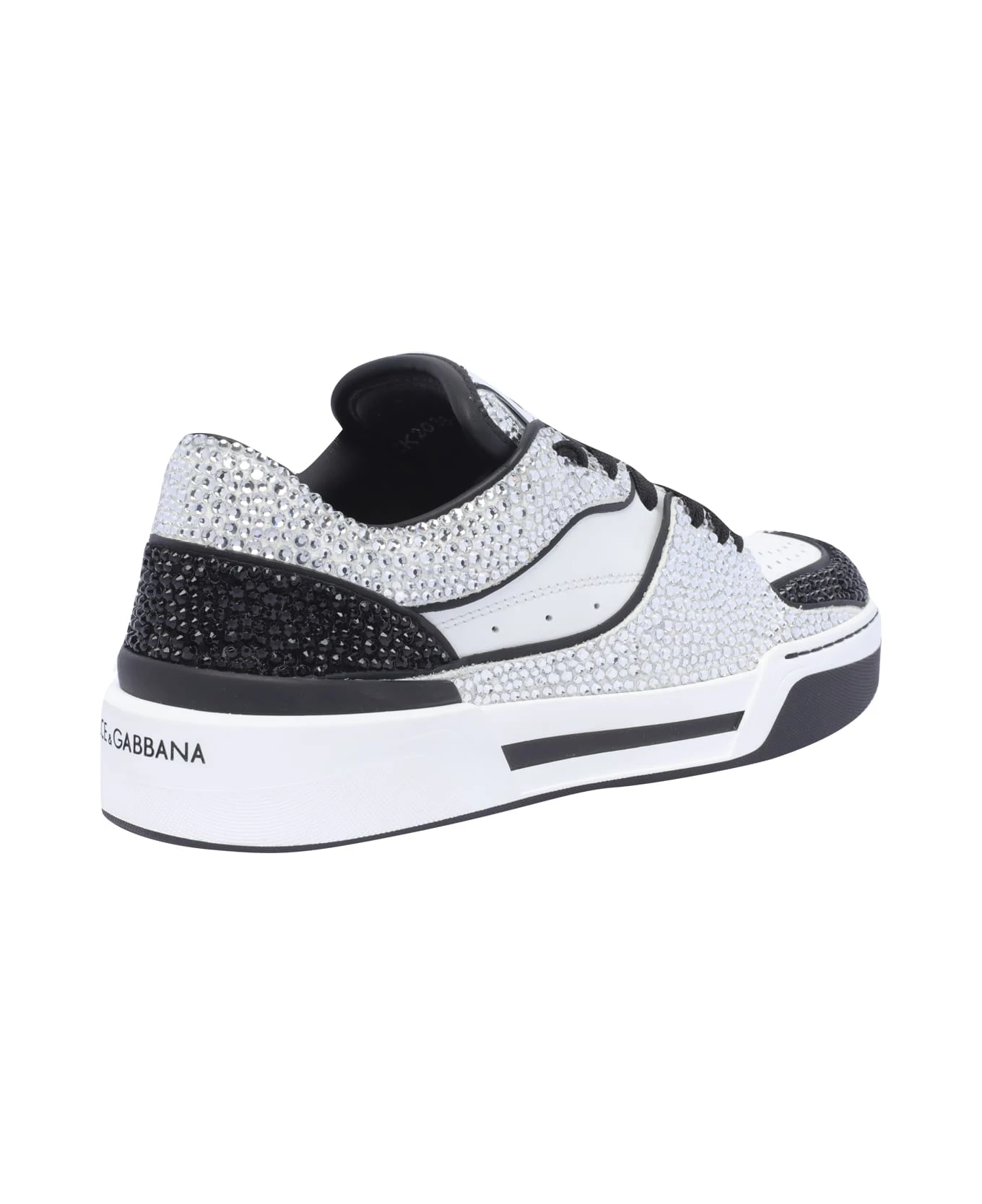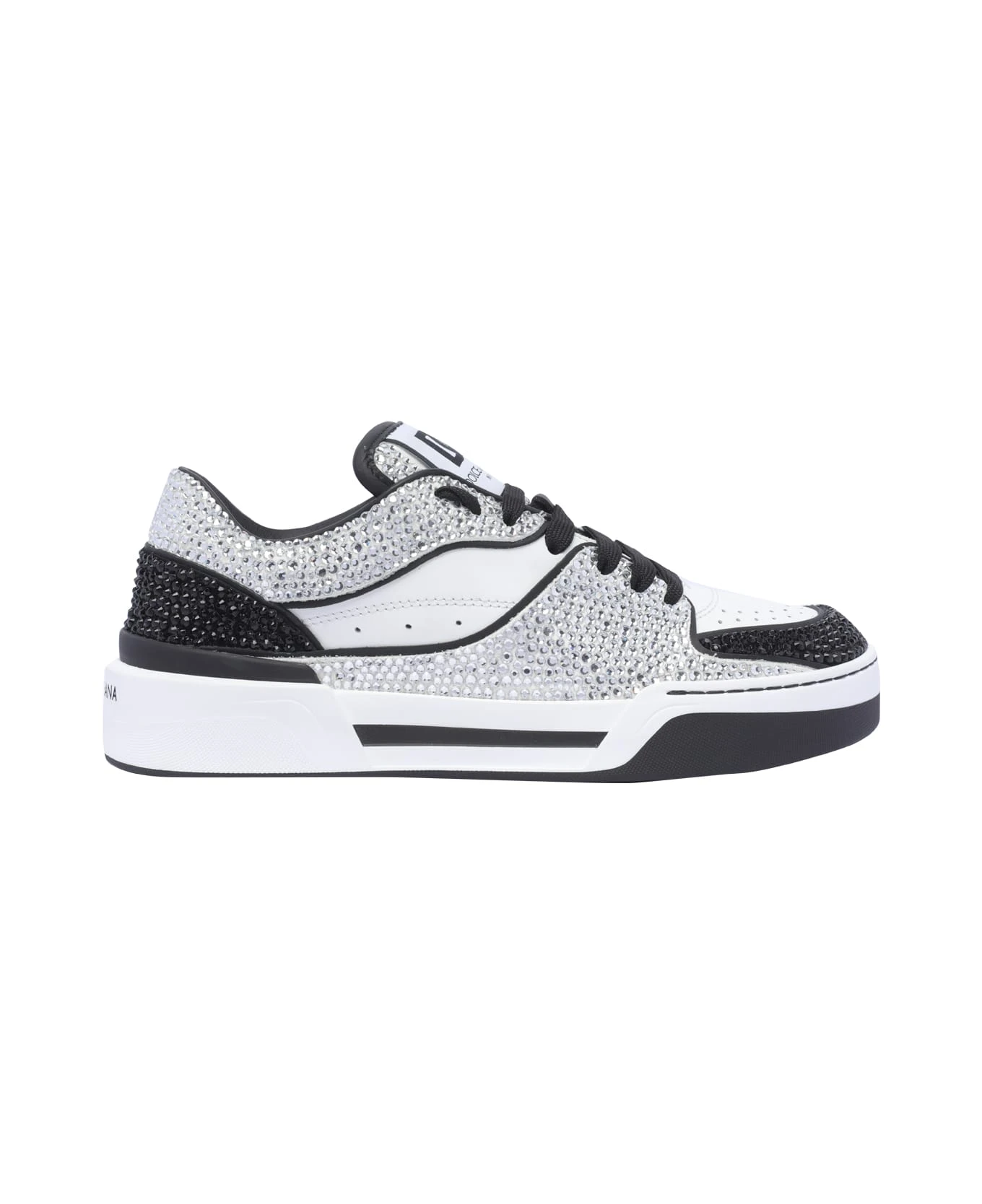 Dolce&Gabbana black and white Trainer New Roma sneakers, leather upper, laces closure, logo, round toe, all over strass details