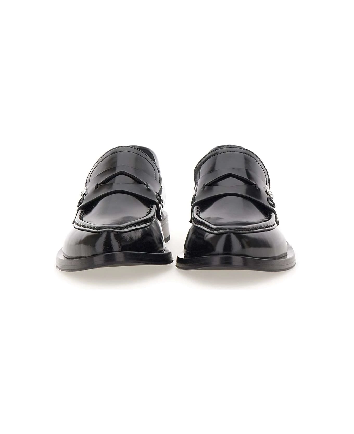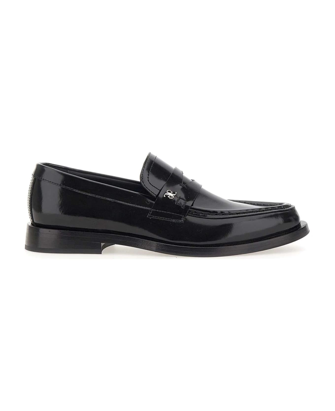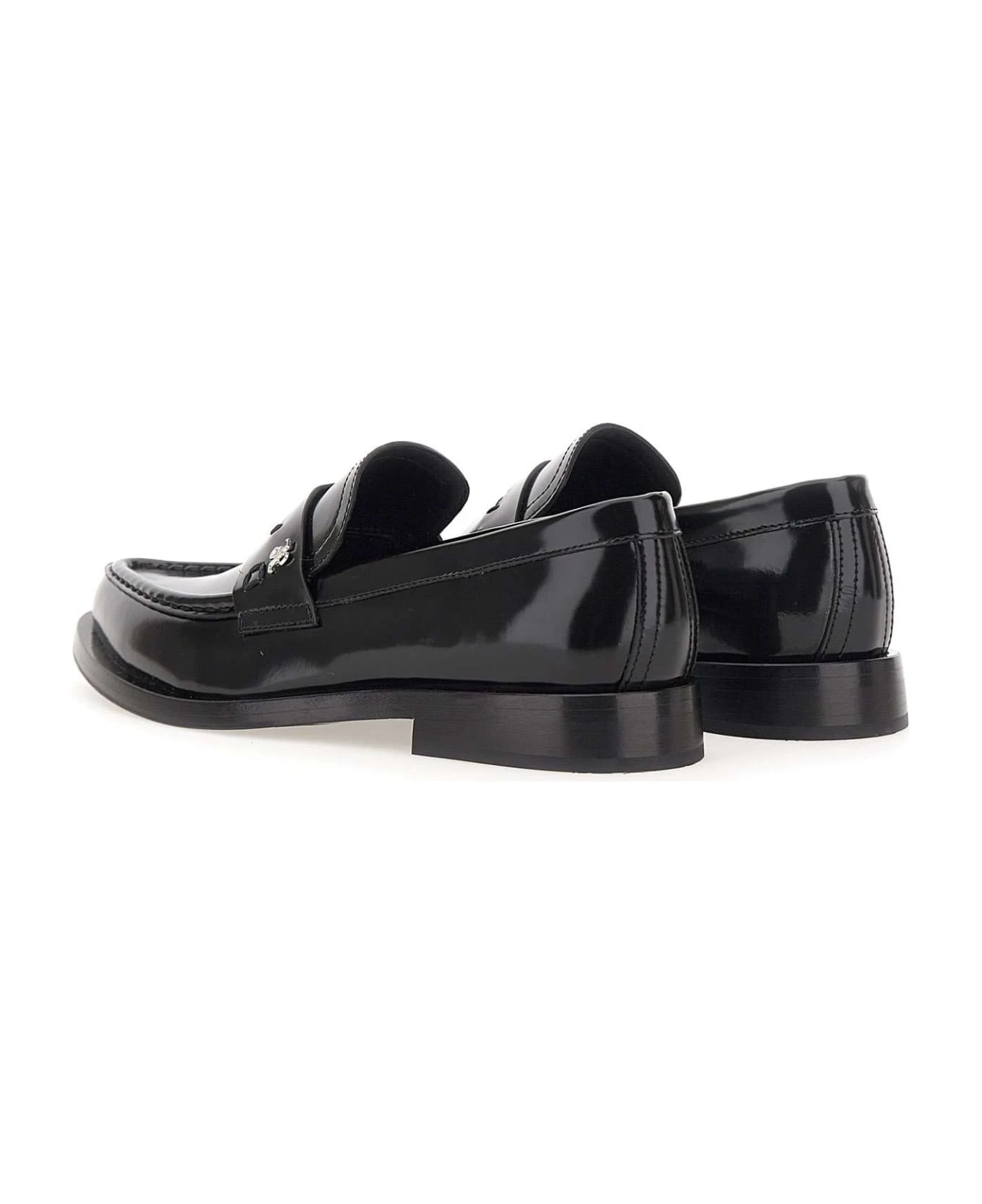 Fabi women’s “Cambridge Sport” calfskin moccasins, black colour, upper epaulette with mini silver metallic logo, visible handcrafted stitching, pointed, leather sole, 2cm heel height. Made in Italy.