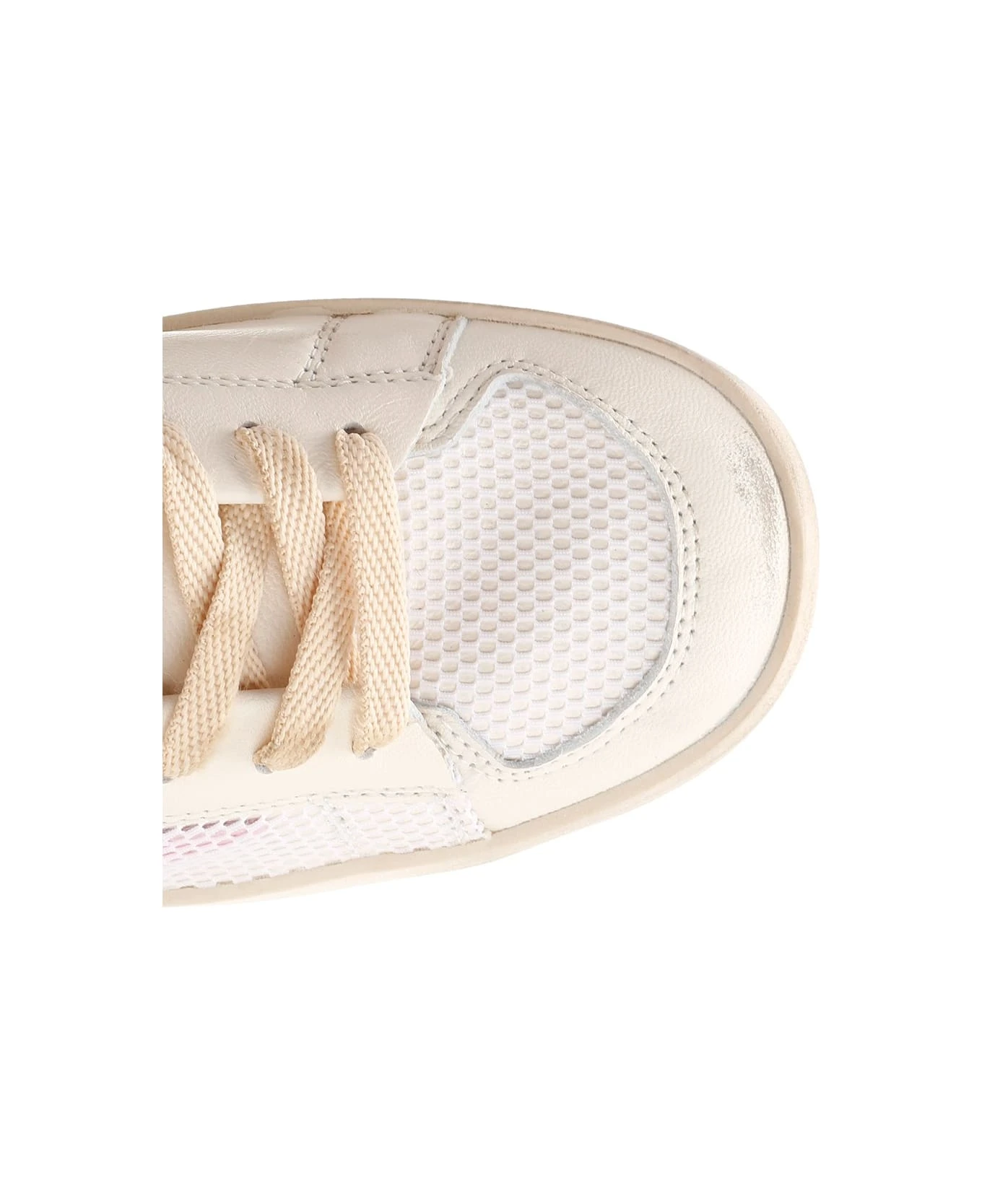 White “Stardan” sneakers from Golden Goose, upper in leather and mesh, pink star and heel tab.