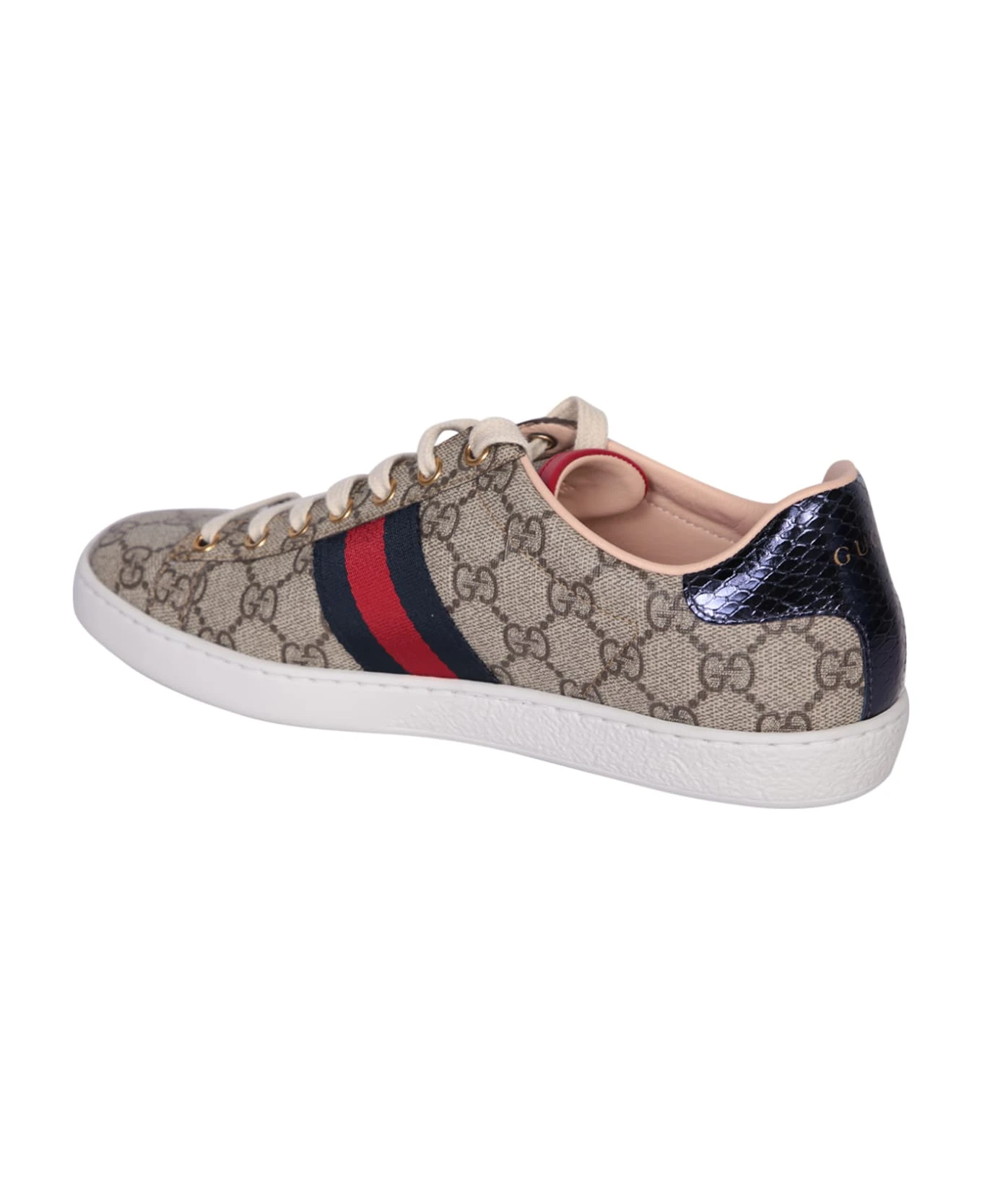 Round toe. Front lace-up fastening. Side web ribbon. All-over GG motif. Logo at heel. Leather details. Rubber sole. Color: beige/ multicolor