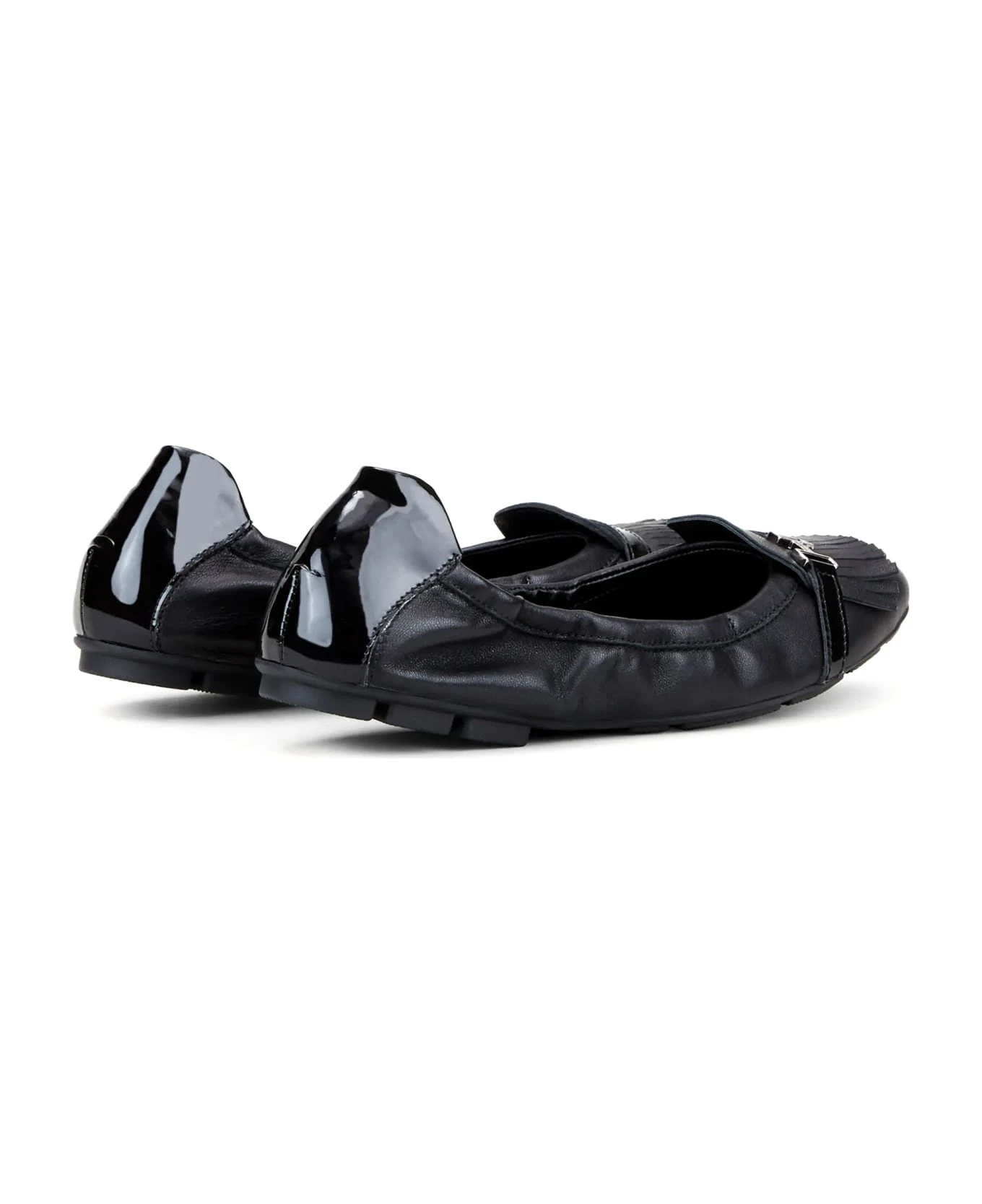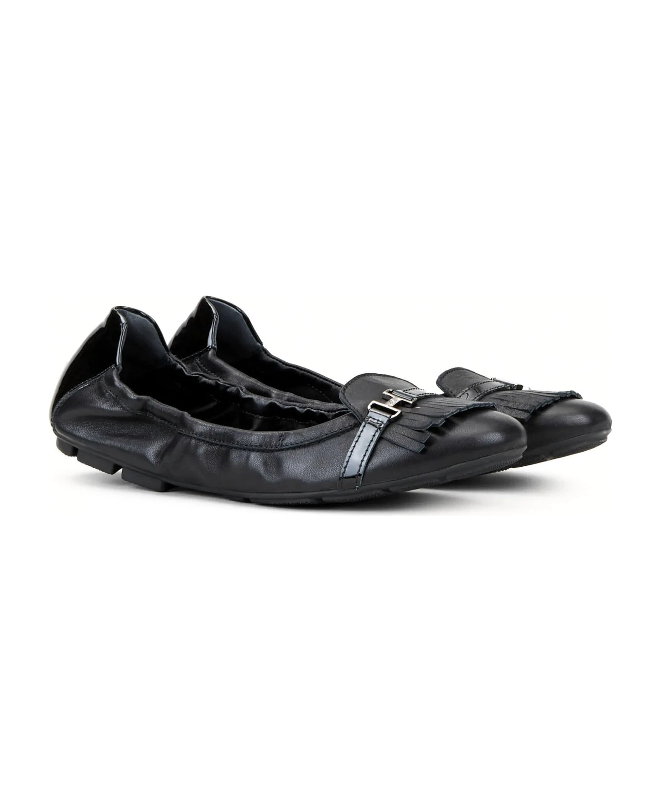 Ballerinas in black leather upper, patent leather detailing, front fringe, metal accessory with engraved Hogan logo, memory foam insole, rubber outsole