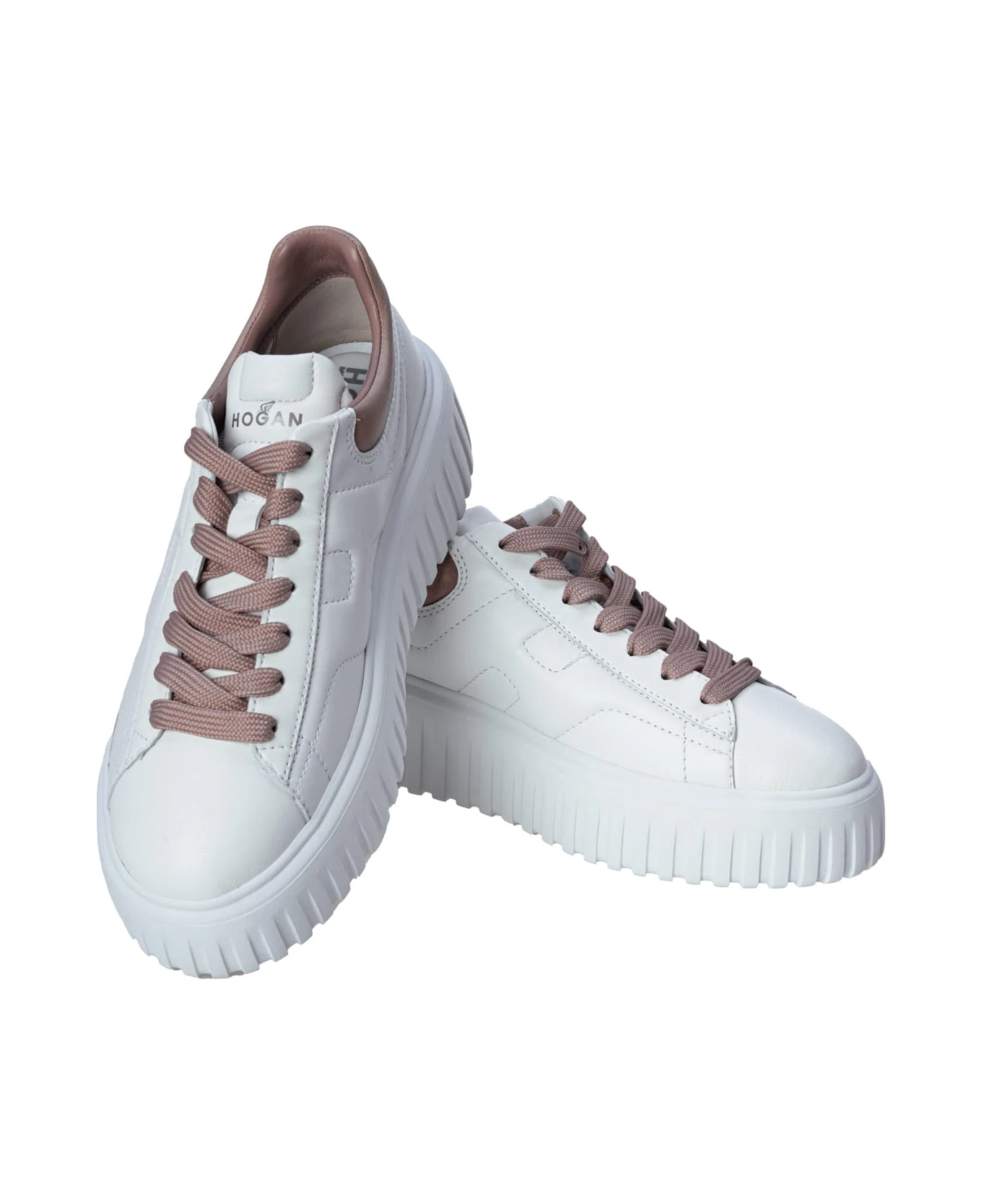 Hogan sneakers Hogan H-Stripes White Pink. Nappa leather upper. Shiny leather inserts. Side H. Fussbett in 8 mm memory foam. EVA sole. Total height 5. 8cm. Care and maintenance instructions included. Fabric pouch included. Includes an additional pair of laces. Made in Italy.