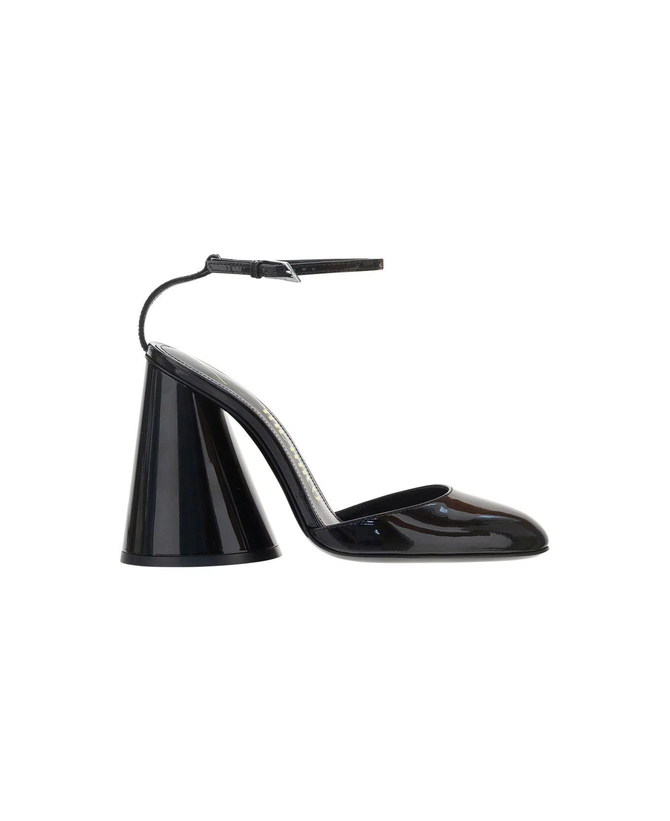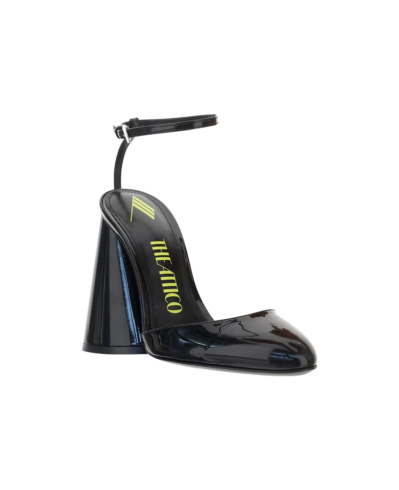 Calfskin luz slingback sandals by the attico, almond closed toe, side ankle strap closure, hourglass geometric heel, contrasting logo insole, shiny leather design.