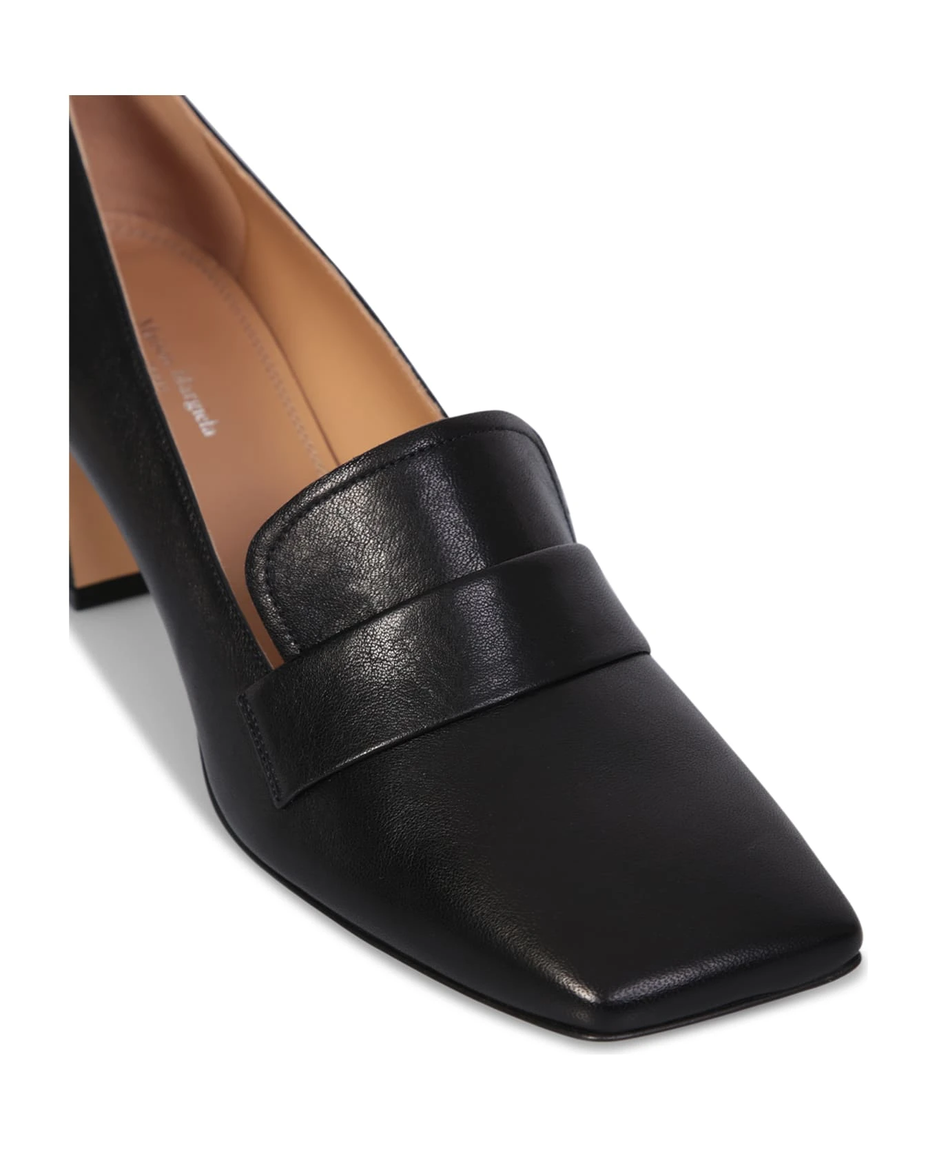 Open toe. Signature Four Stitches logo. Medium wide heel. Color: black
