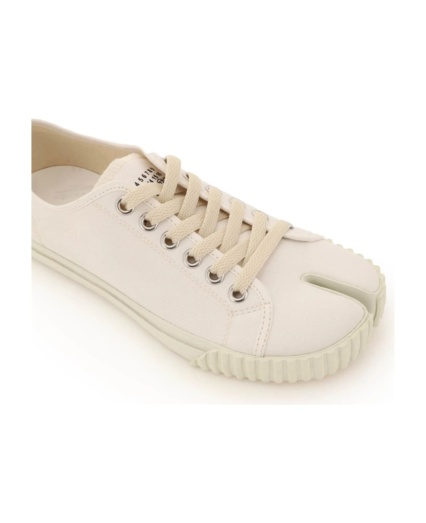 Maison Margiela Tabi sneakers crafted in cotton canvas and characterized by the iconic ‘cut’ on the toe. Silver-tone metal eyelets, logo printed on the tongue, fabric lining, removable leather insole and rubber sole with logo on the back.