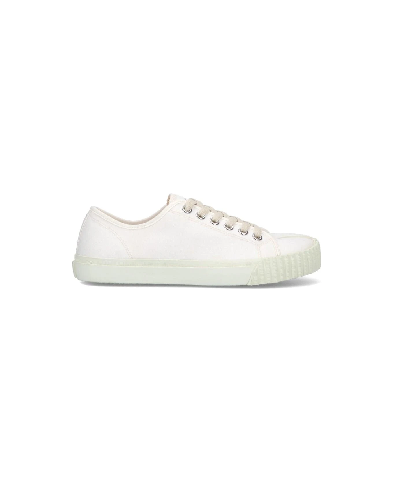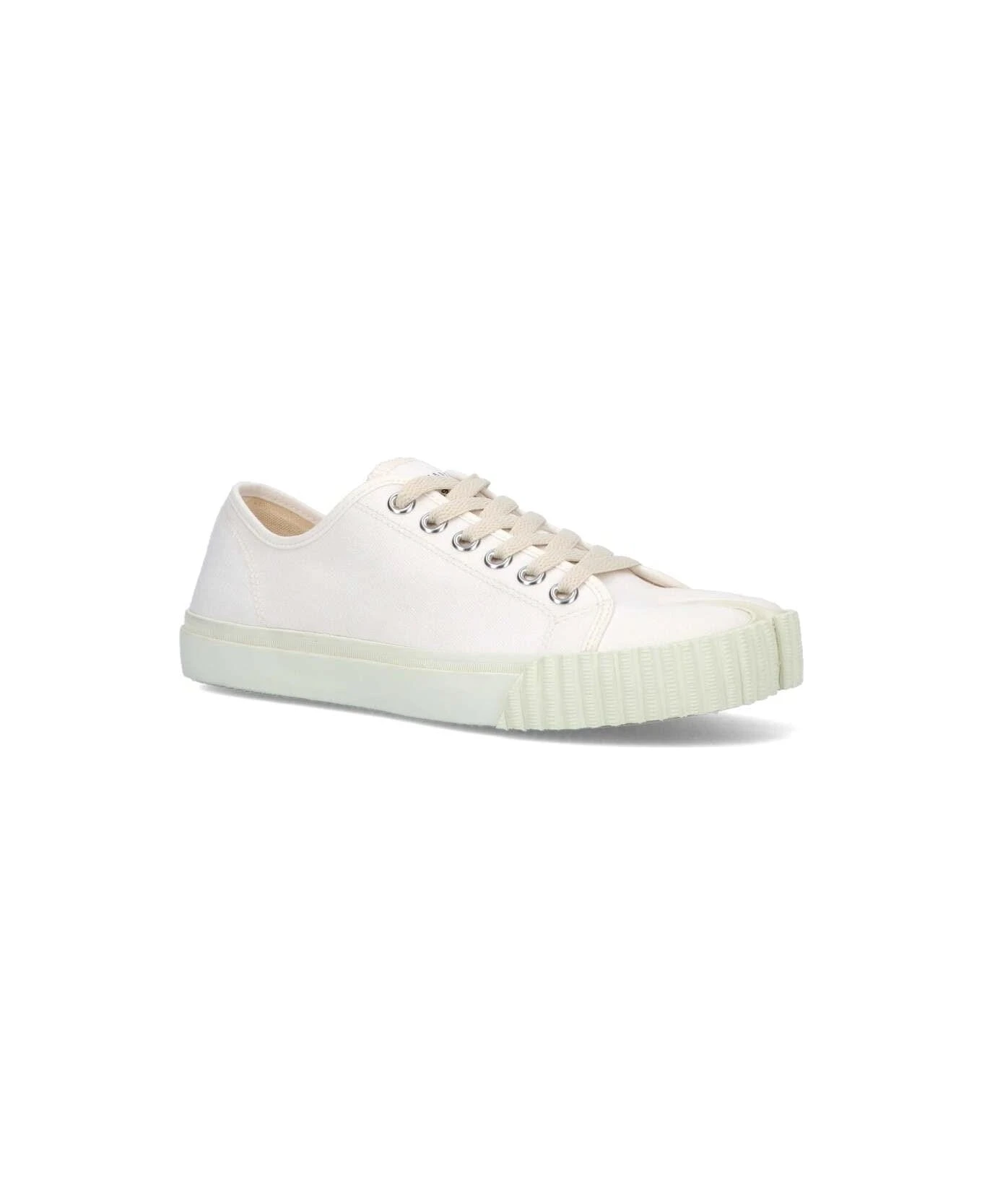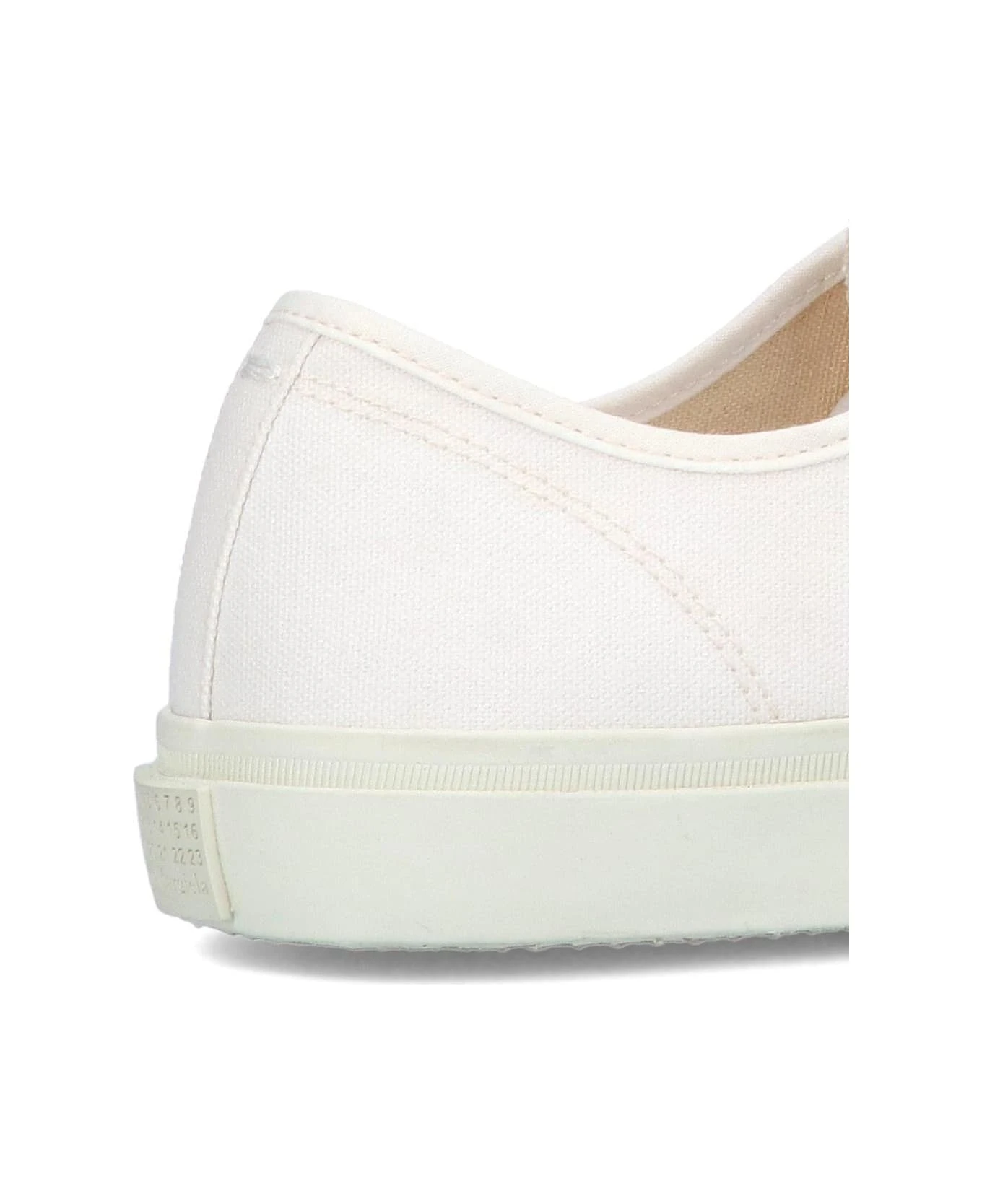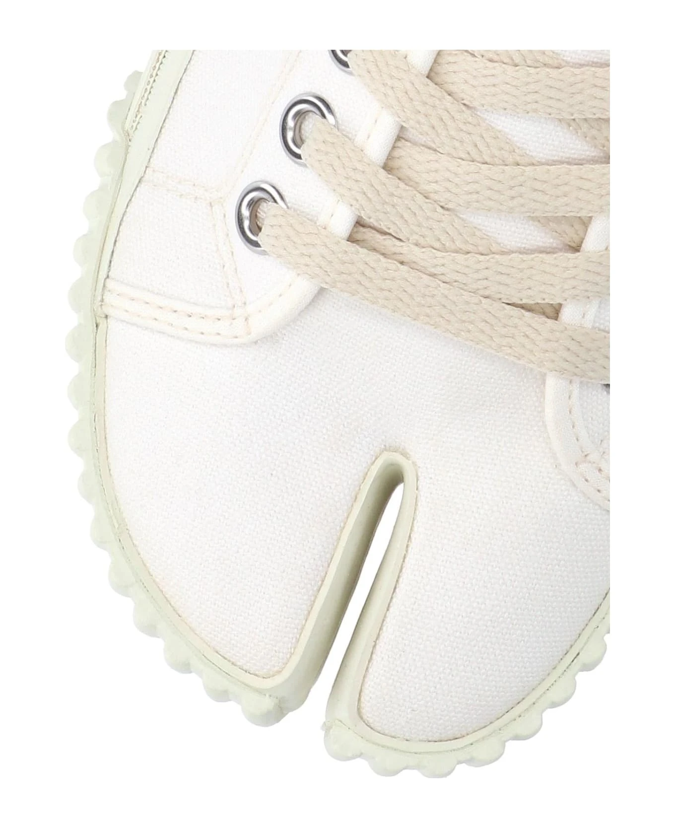 Maison Margiela ‘Tabi’ fabric, cream color sneakers with round tabi detail toe, lace-up closure, rubber sole, and a tone-on-tone embossed logo detail at the back.