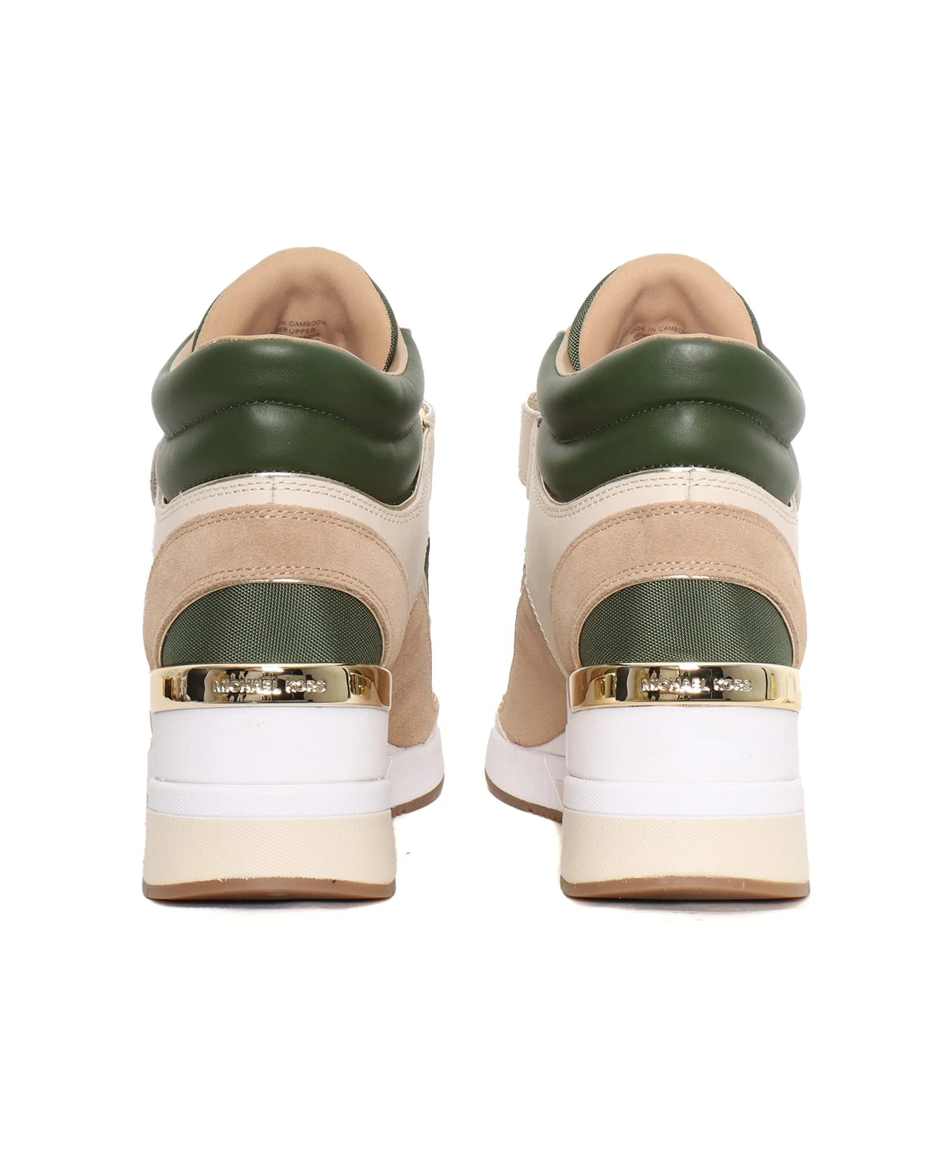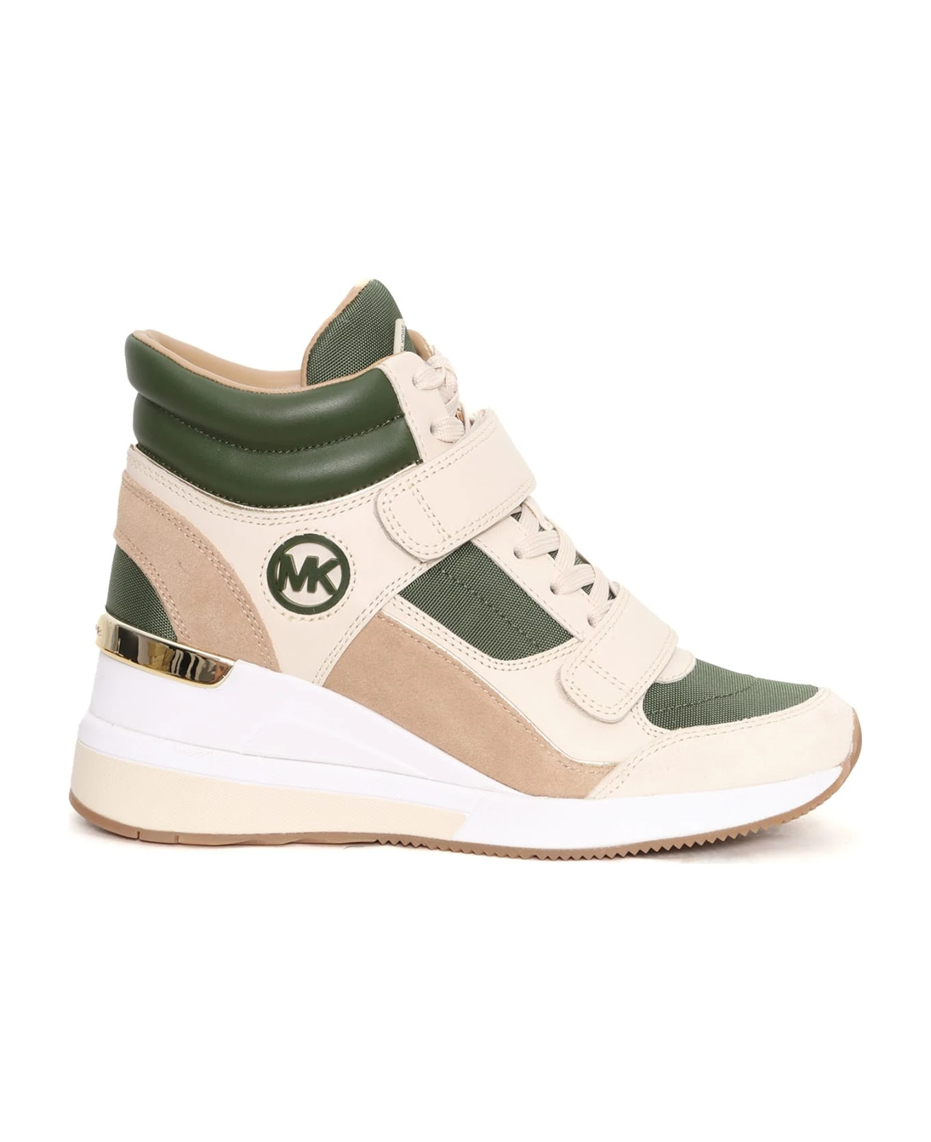 Leather and suede sneakers, cotton lining, color block inserts, embossed side logo, gold-colored detail on the heel, insole with logo, front velcro fastening, laced-up, wedge heel, non-slip rubber sole