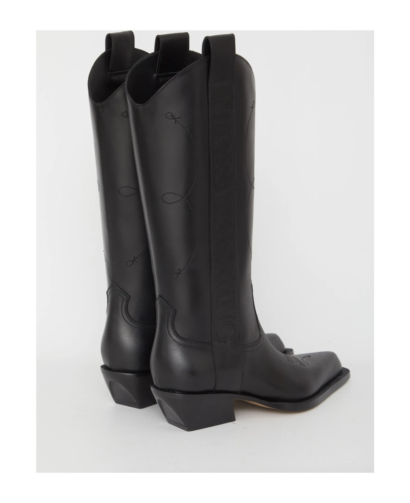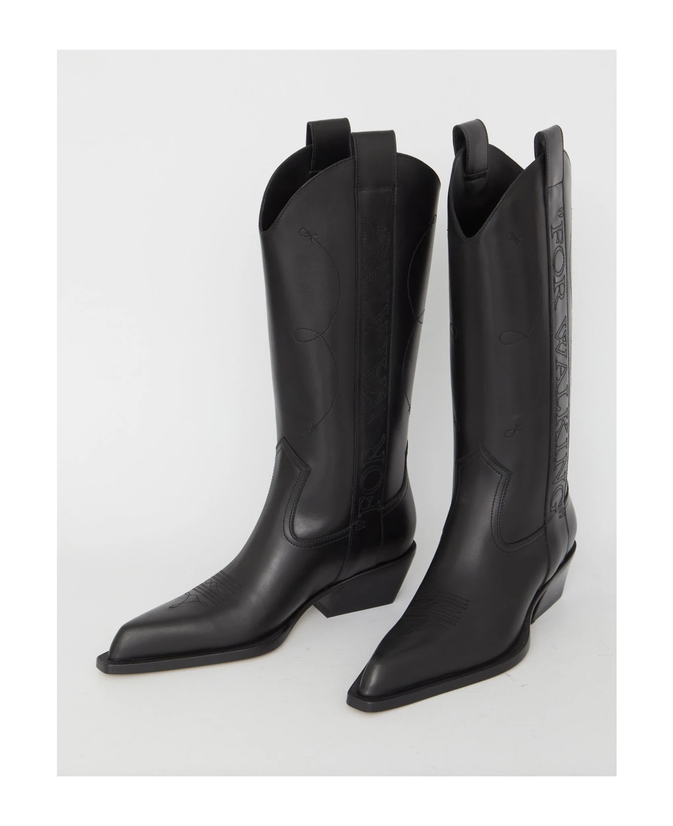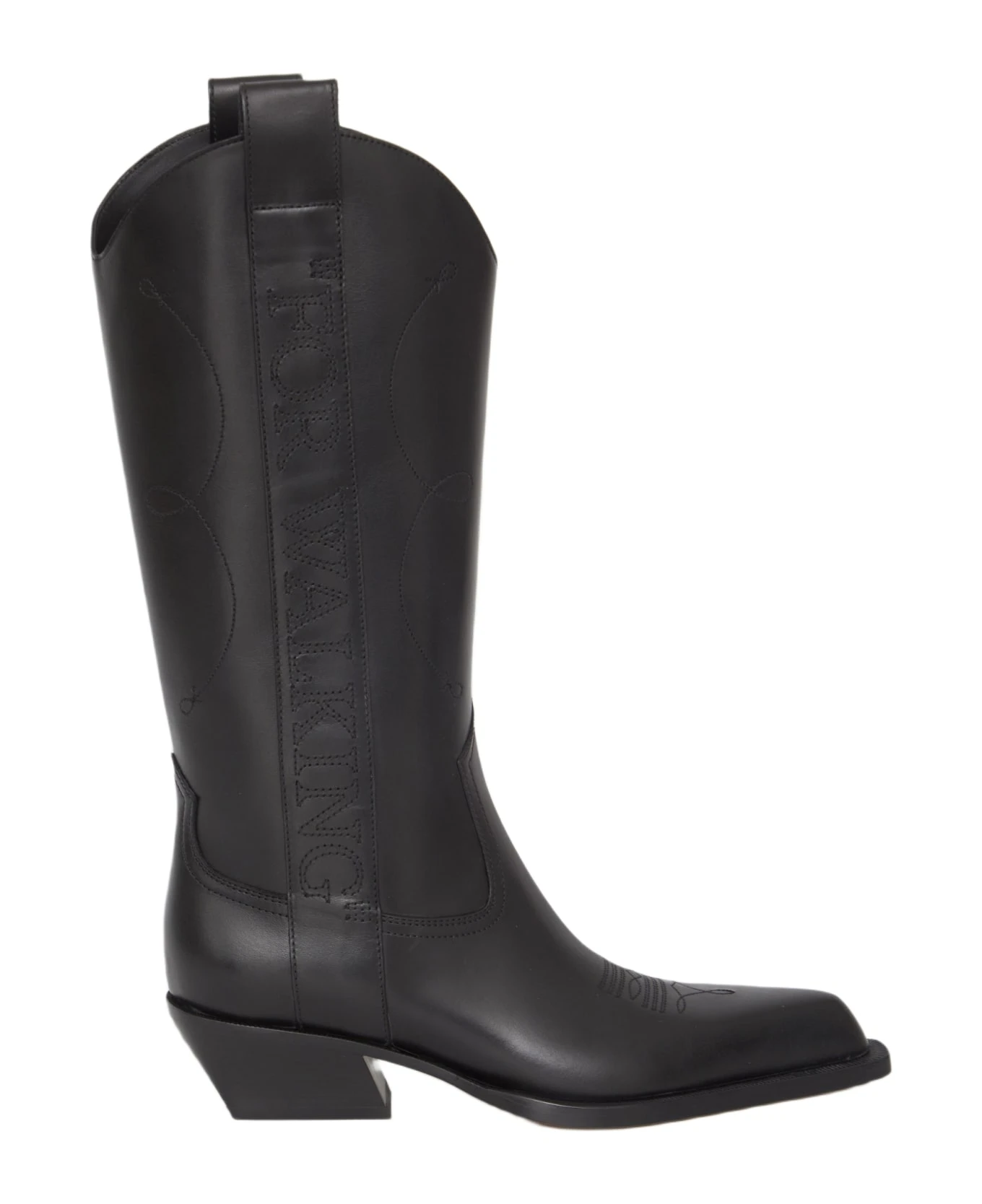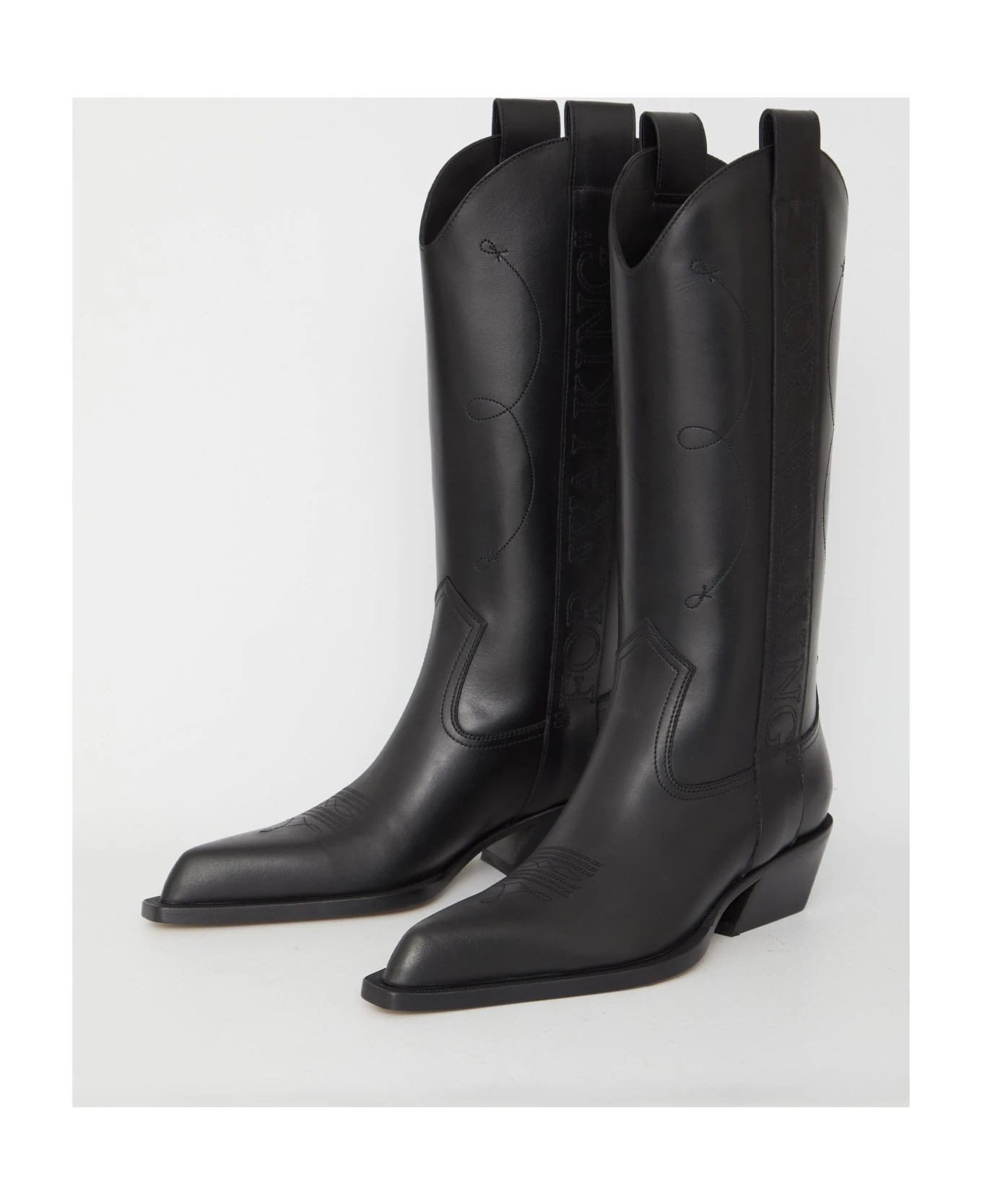 Texan boots in black leather with side “For Walking” embroidery. Pointed design, block heel and leather sole.