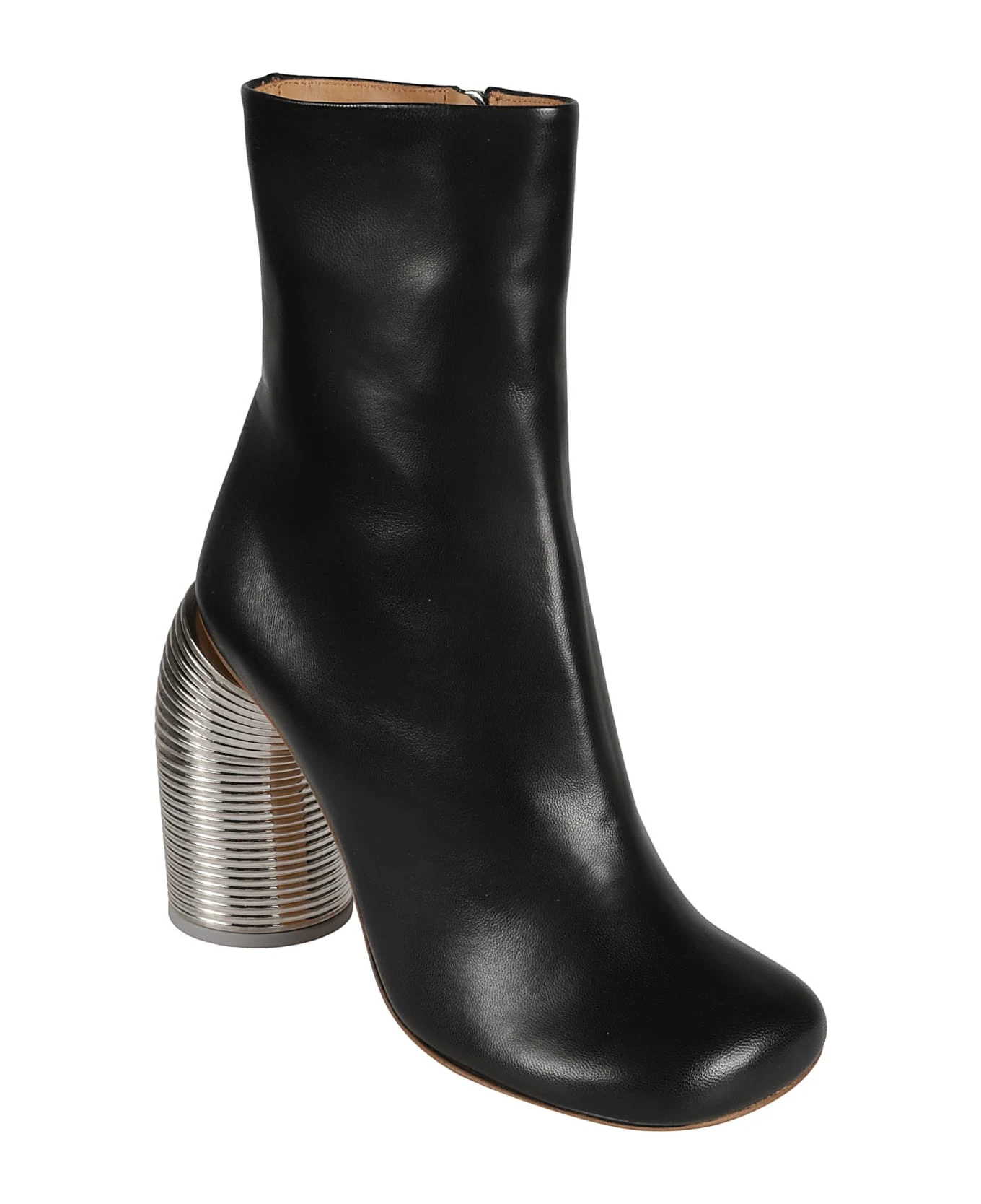Spring leather ankle boots from OFF-WHITE featuring black, leather, concealed side zip fastening, round toe, ankle-length and high sculpted heel.