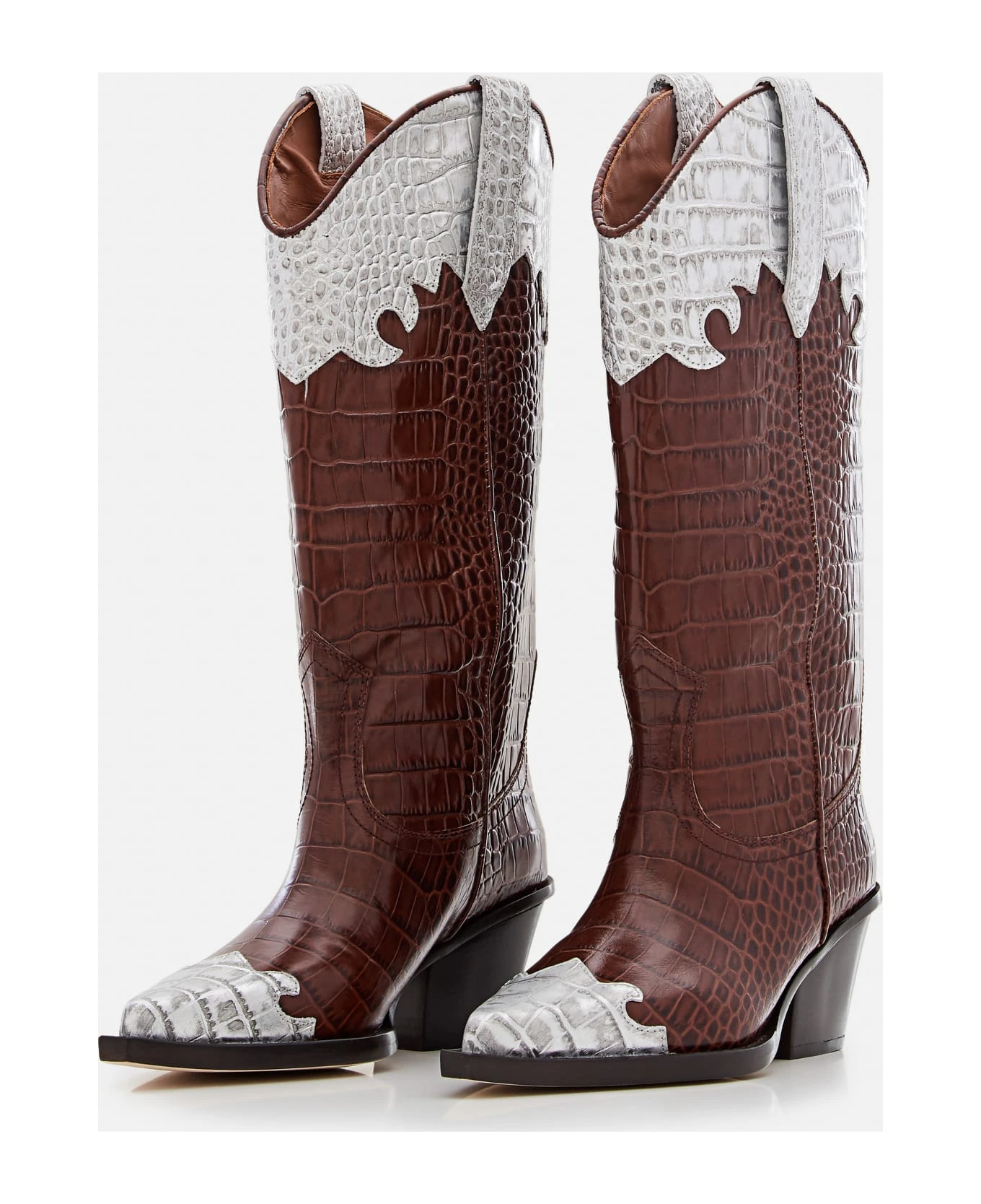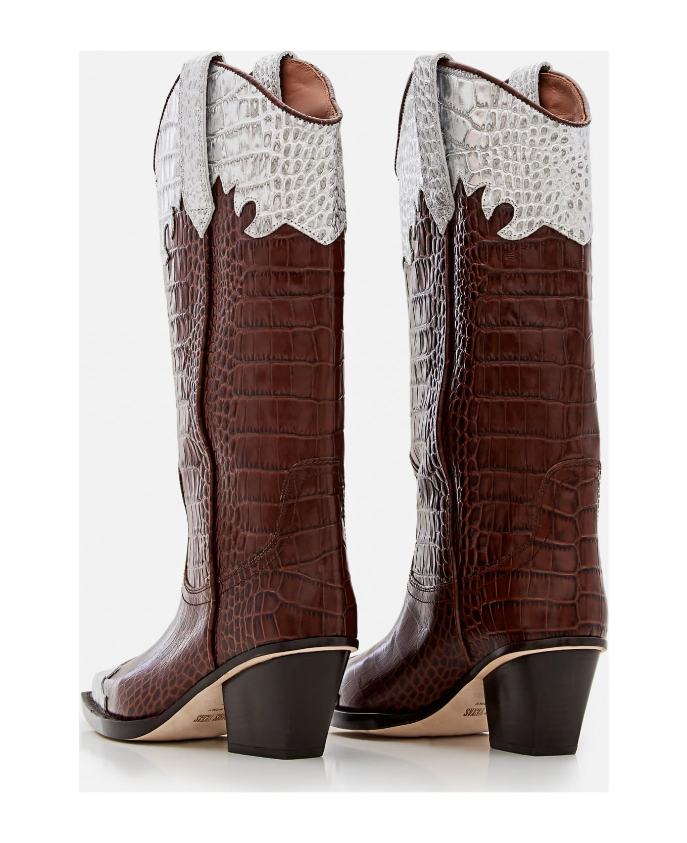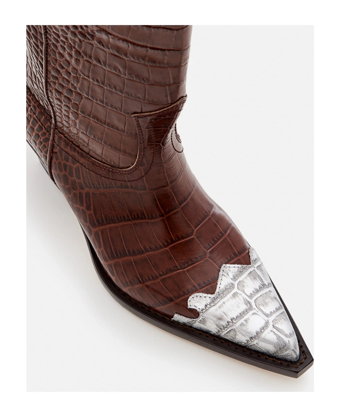 Shiny leather upper. Pointed toe. Embossed croco details on the leg. Fake snakeskin detail on top. Curved top hem. Color: brown.