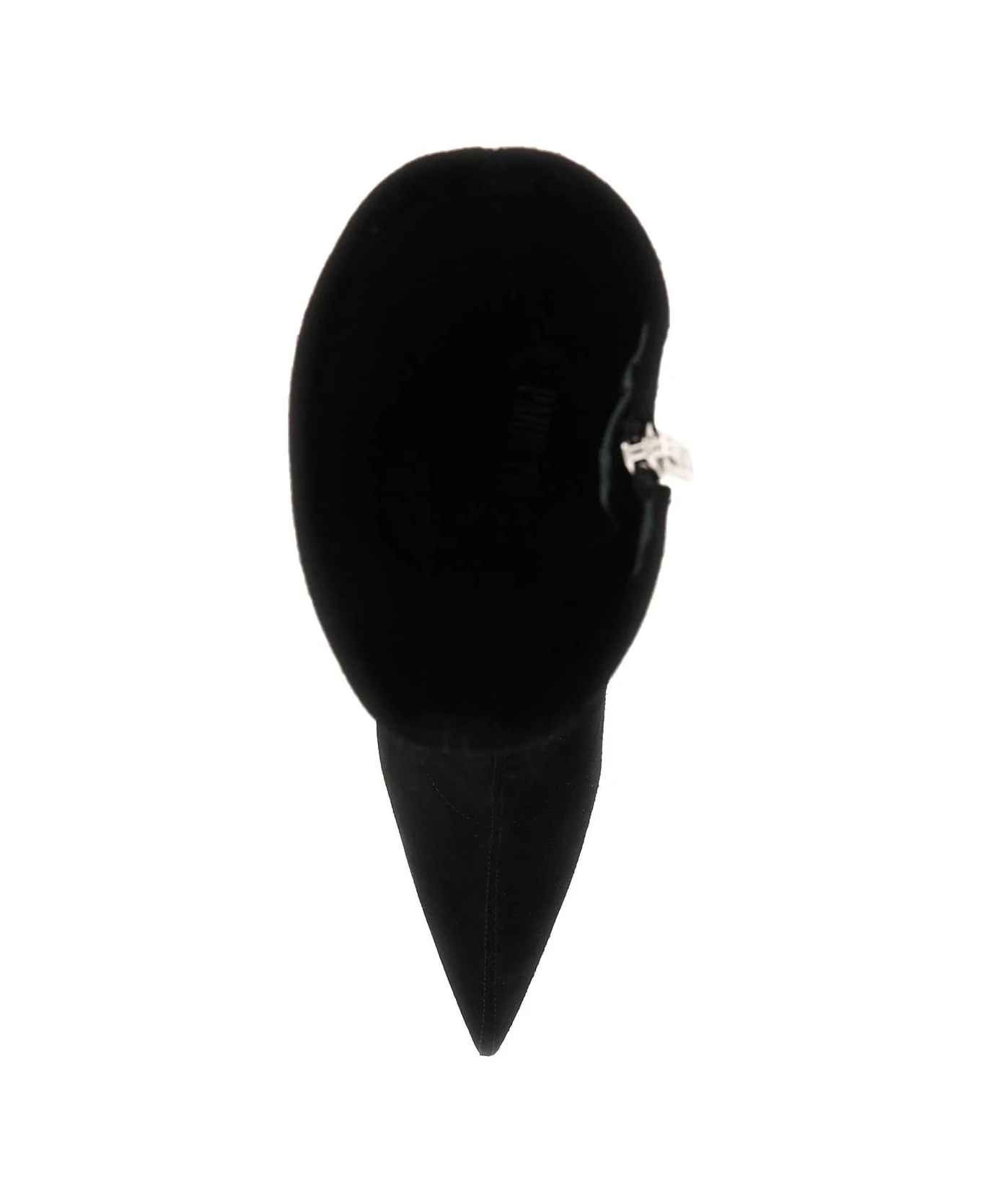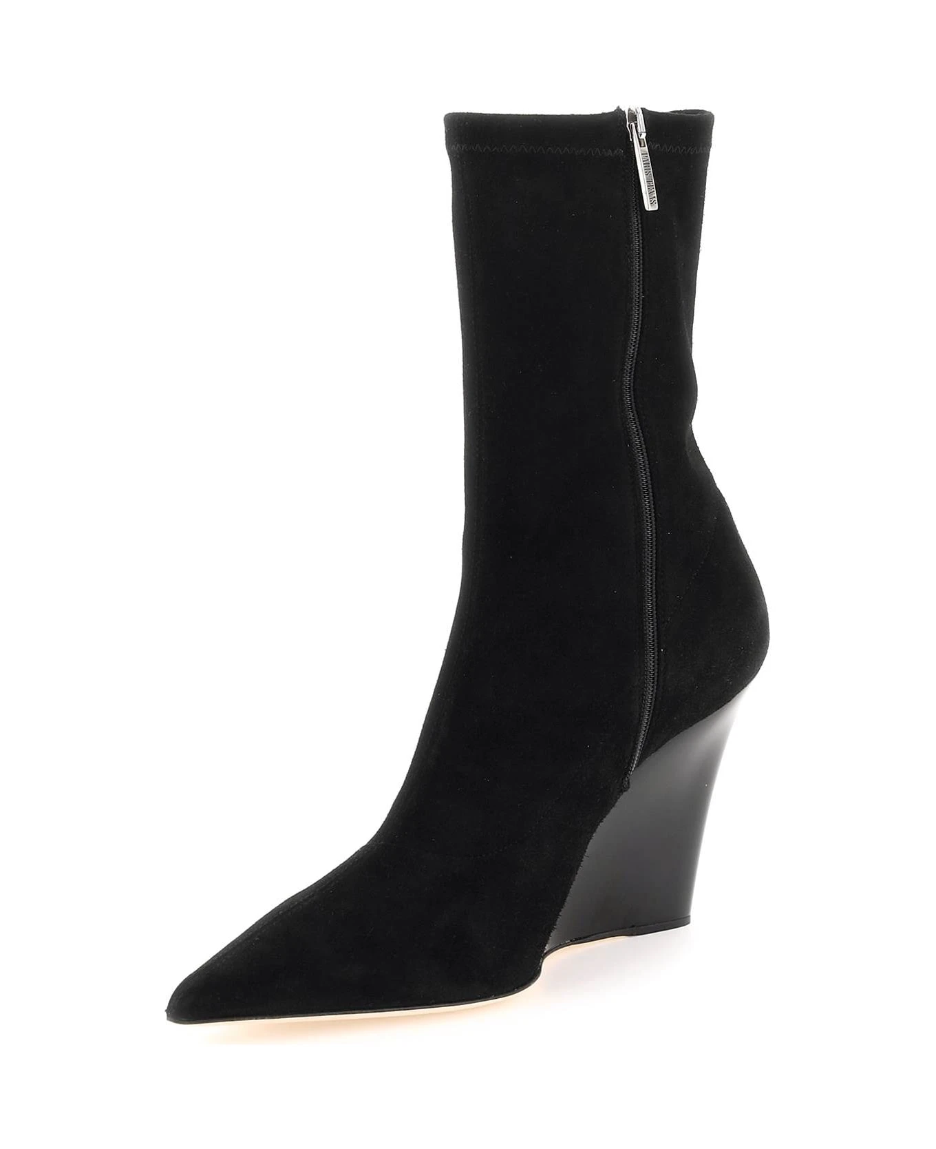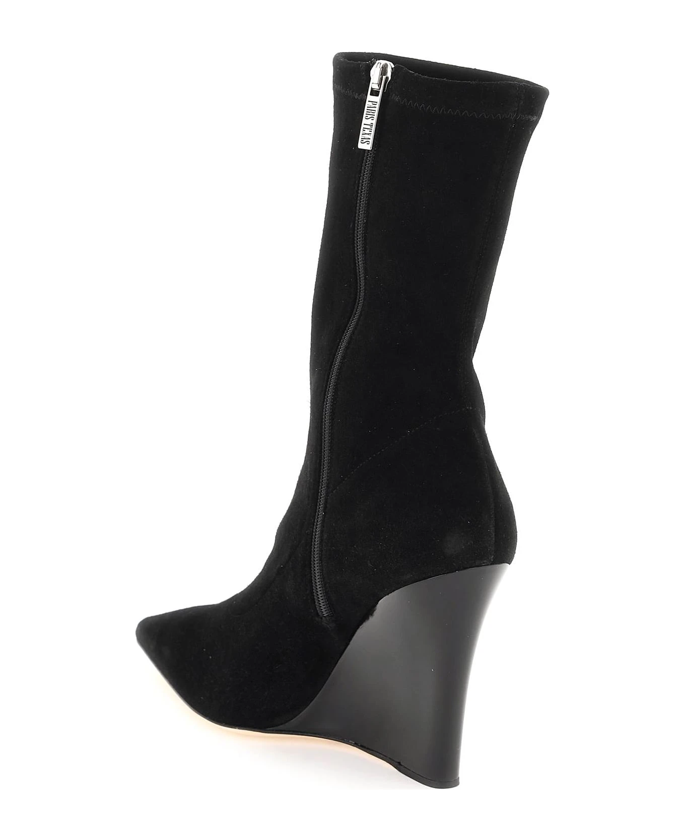 Suede Wanda ankle boots with lacquered high wedge heel. Side zippered closure, unlined interior, leather insole and leather sole.
