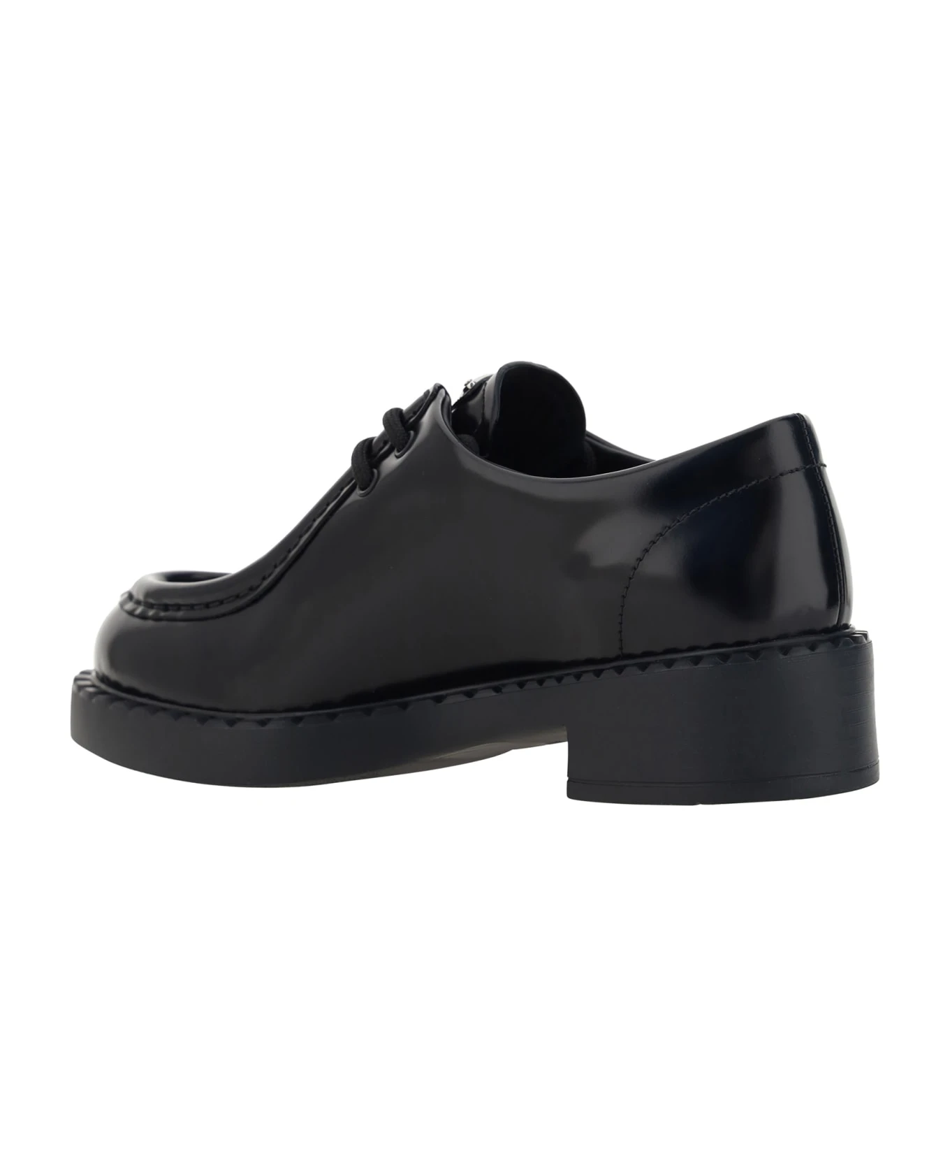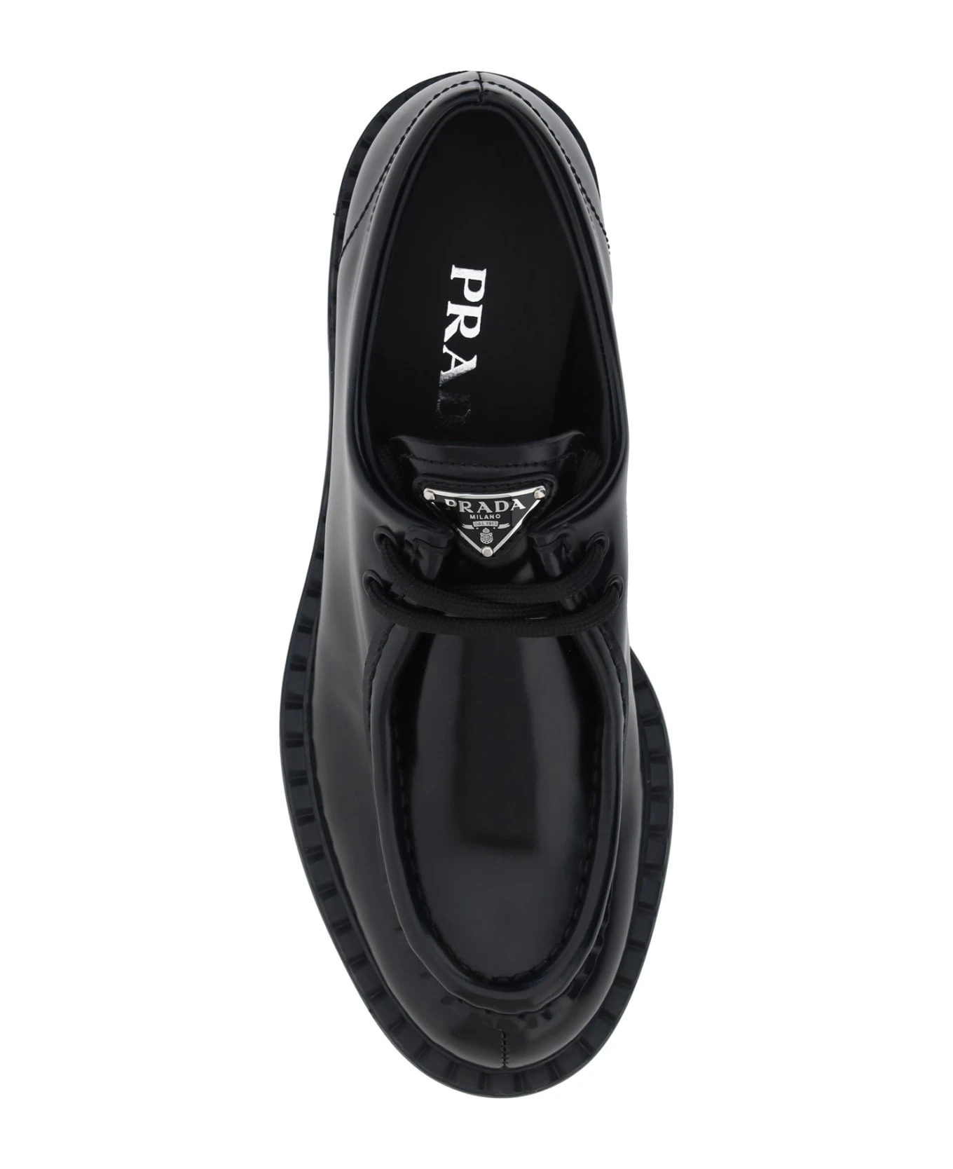 Calfskin chocolate loafers by prada, slightly elongated round toe, block heel, front leather tray embellished with iconic triangular plaque with signature enamelled brand, pressed logoed insole.