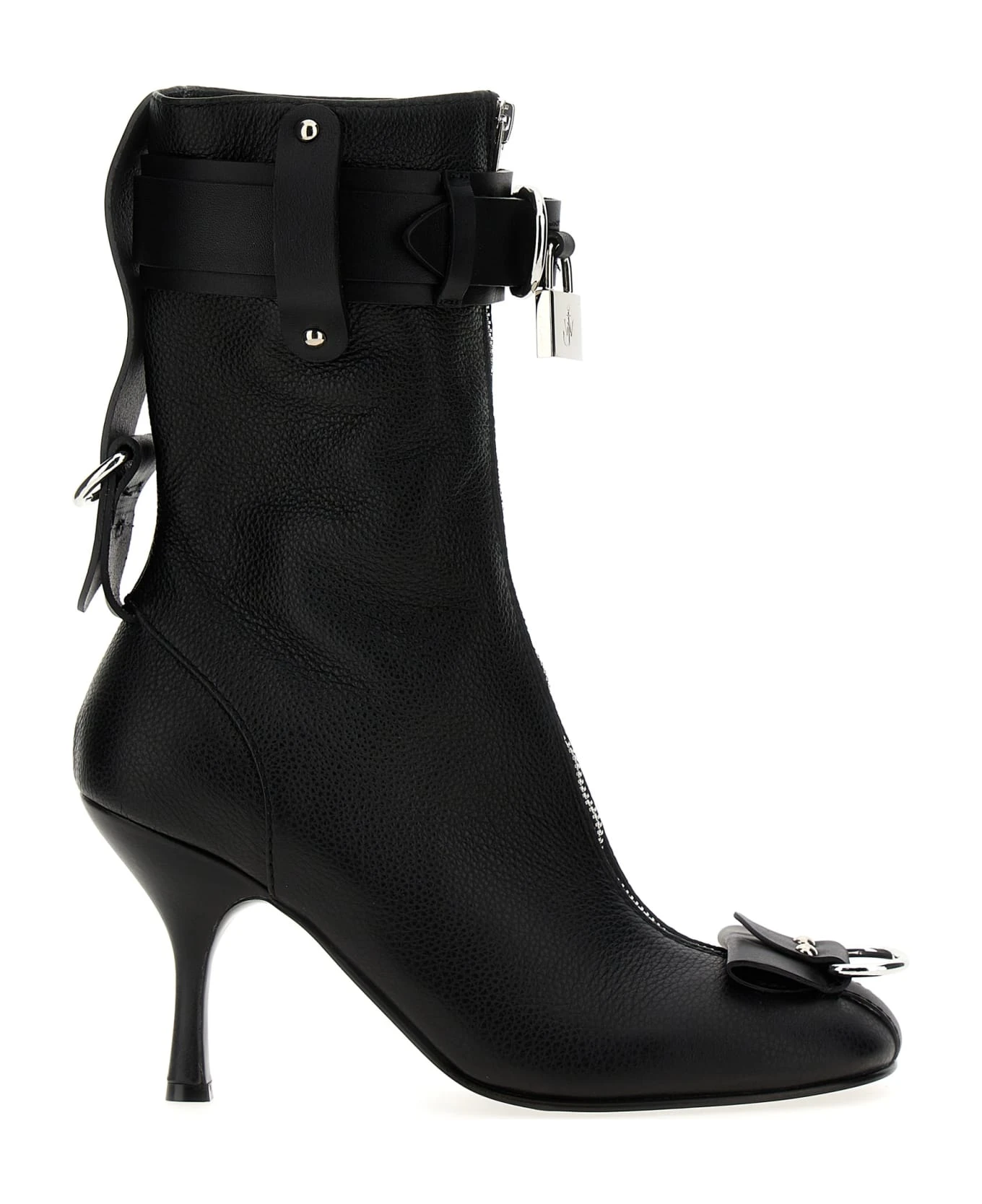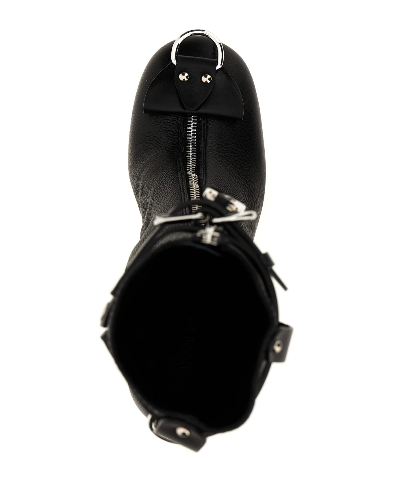 ‘Punk’ boots in garnet leather with front zip closure and adjustable strap, metal details, heel.