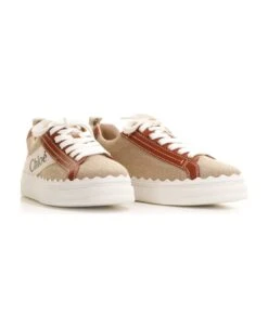 Chloé ‘lauren’ Beige Low Top Sneakers With Logo Detail And Brown Leather Trim In Canvas Woman