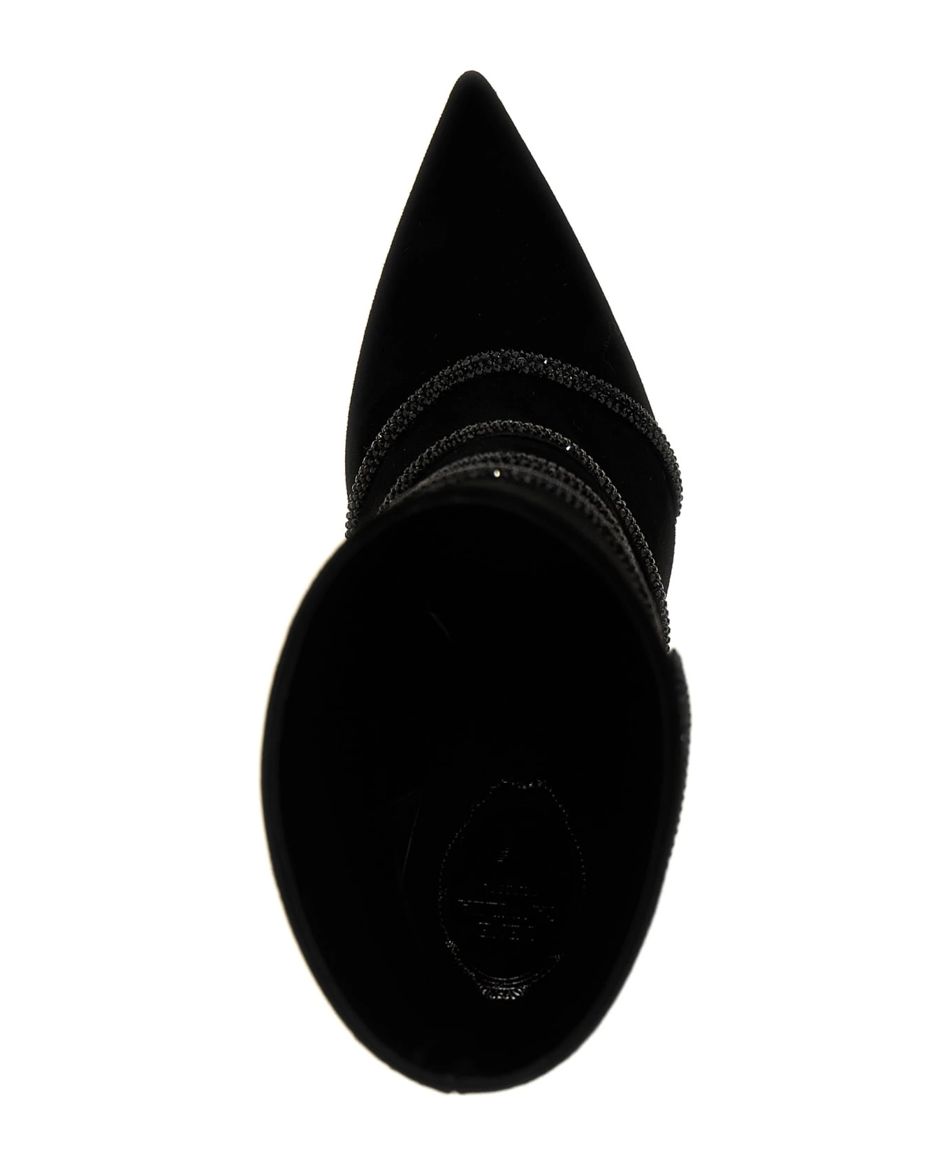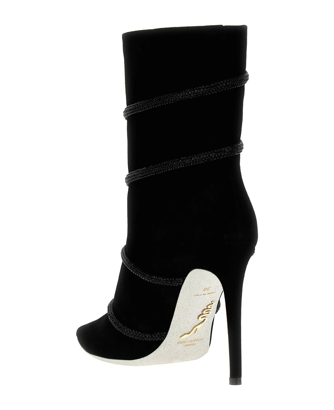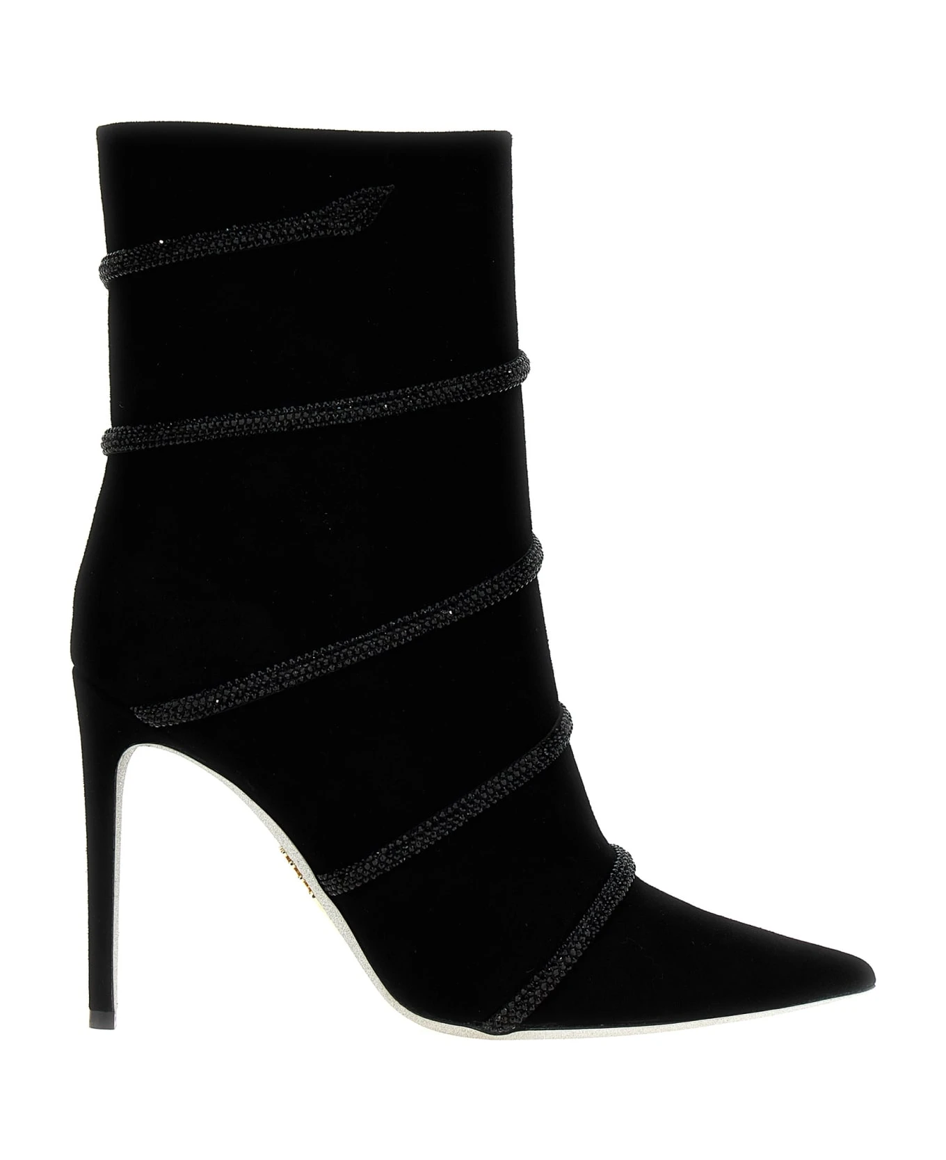 Suede ankle boots with rhinestone appliqué, pointed toe model with heel.