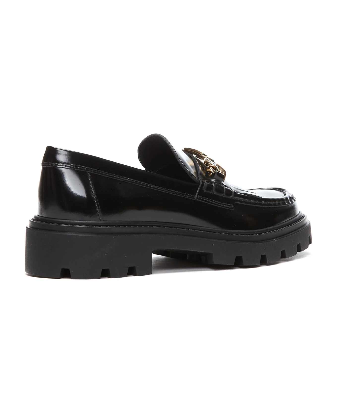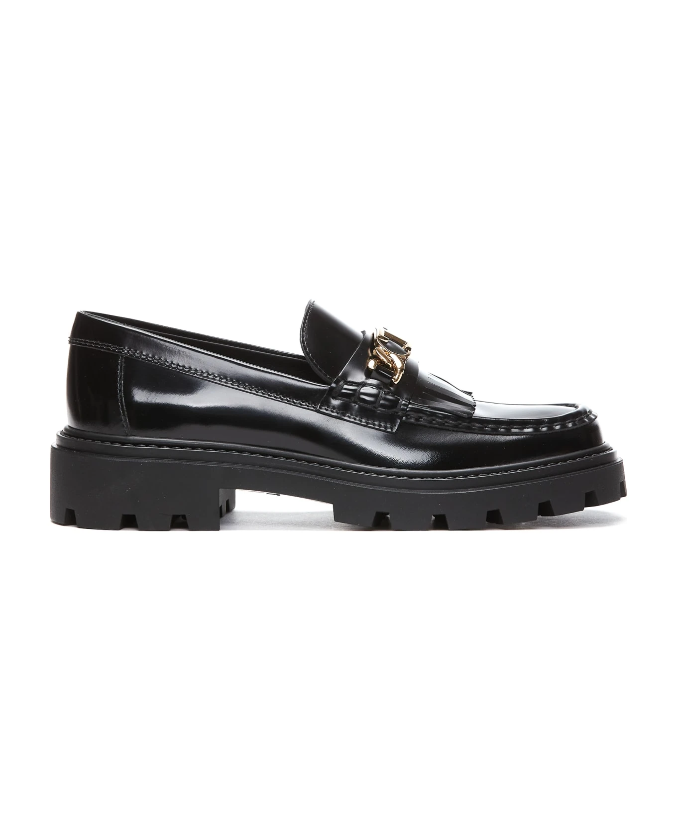 Tod’s black fringed loafers, leather upper, slip on, round toe, frontal gold logo