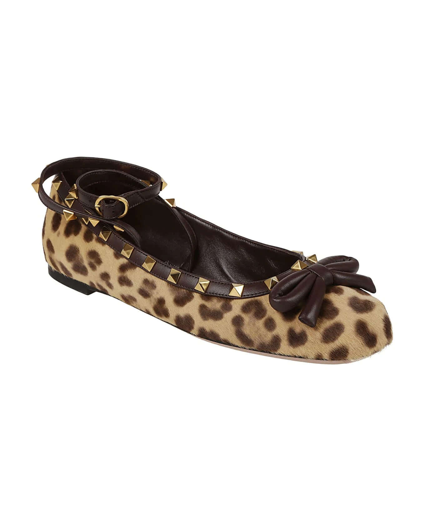 Rockstud ballerina in leopard print calfskin and ponyskin BY VALENTINO GARAVANI. Adjustable ankle strap in nappa as profiles and bow applied at the top. Stud detail along the profiles.