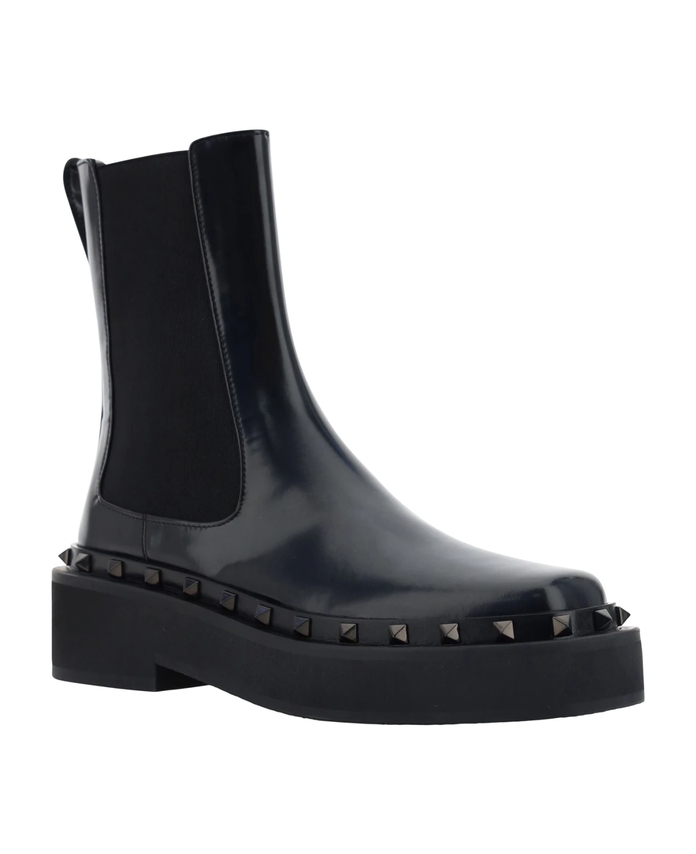 Rockstud m-way ankle boots by valentino garavani, elasticized bands on side panels, leather pullback for fit support, round toe, block heel, iconic brand studs applied to all-over sole profile, patent leather design.