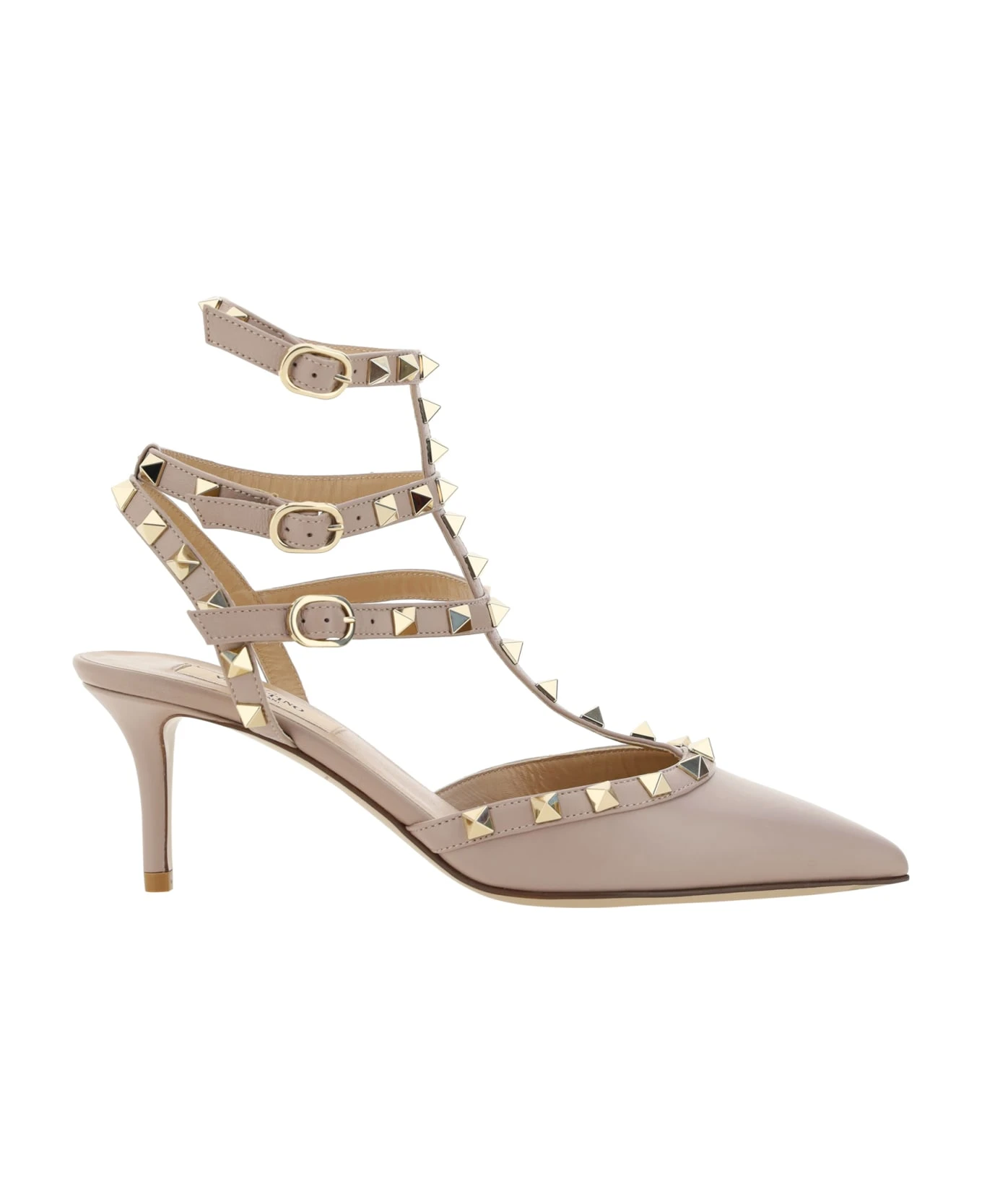 Rockstud sandals by valentino garavani, elongated geometric toe, three adjustable ankle straps with side buckle closure, matte leather design, leather stiletto heel, iconic all-over brand applied studs, logoed insole.