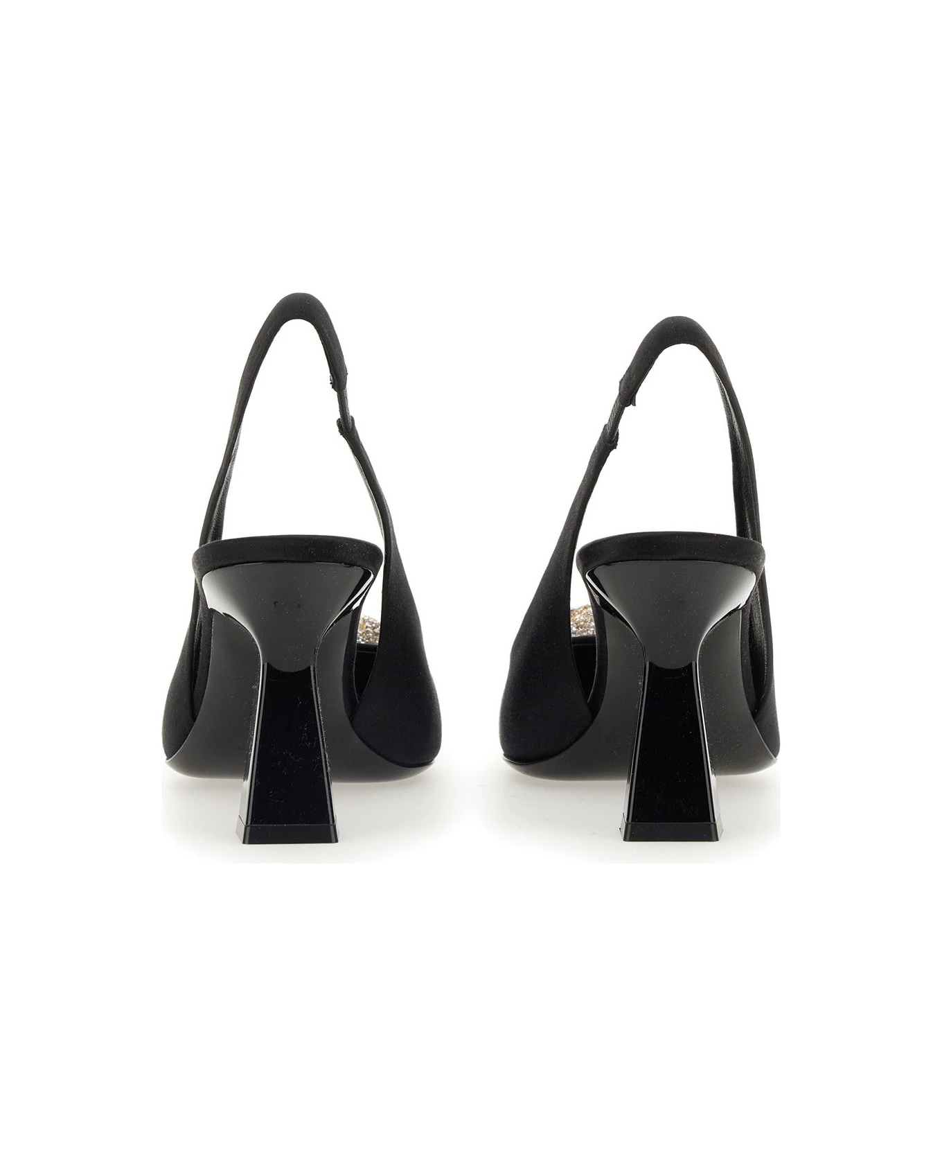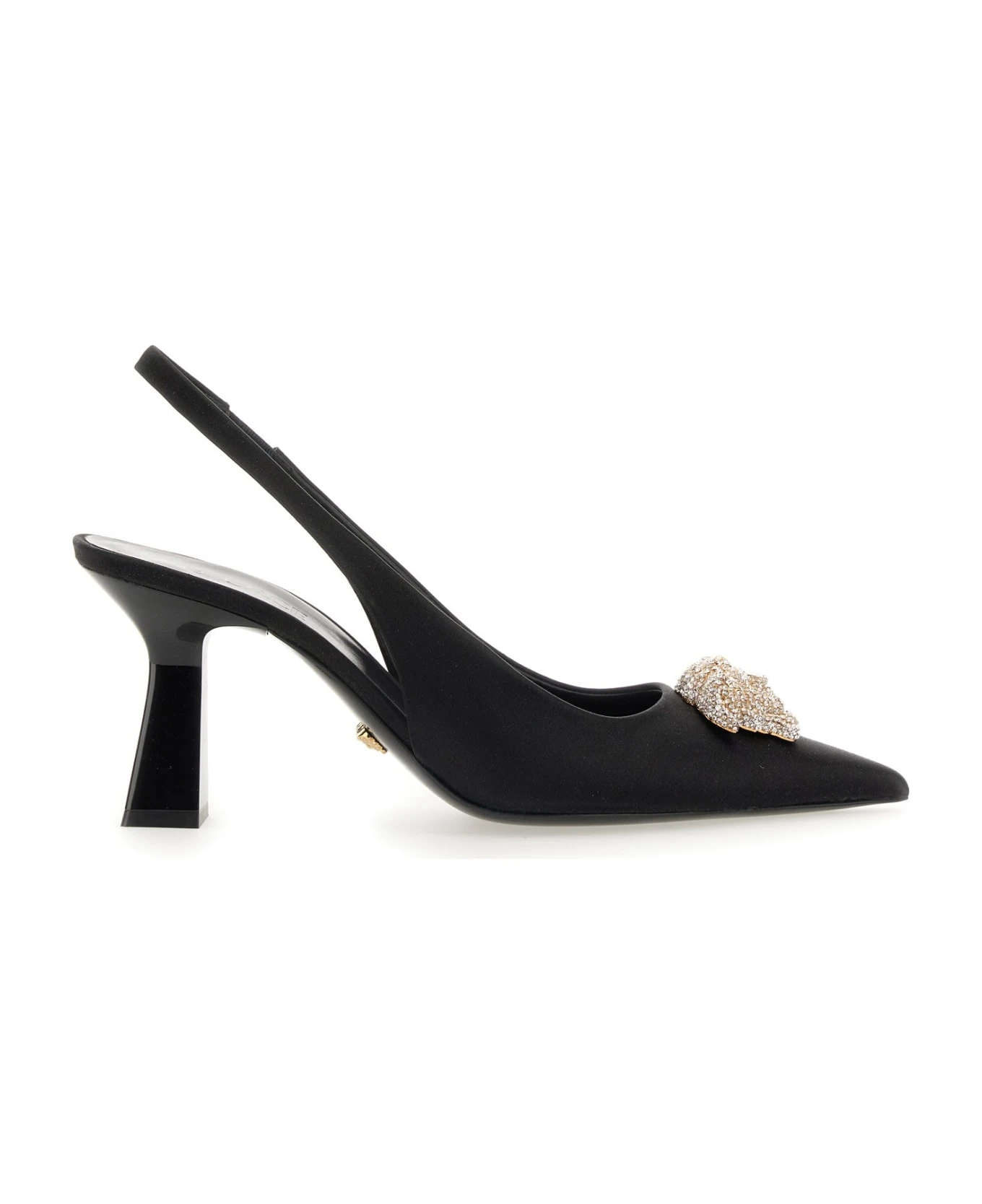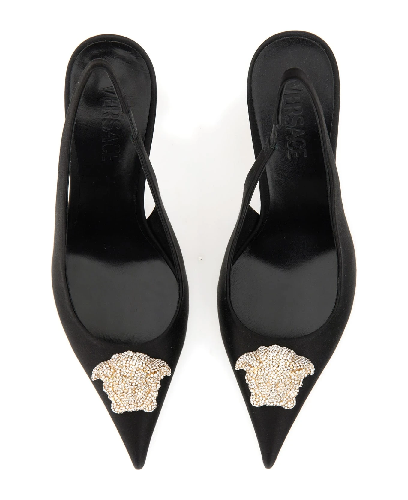 – Heel: 10 Cm- Buckle Closure On Heel- Satin Upper With La Medusa Crystal Plaque- Leather Sole- 72% Viscose, 28% Silk- Made In Italy