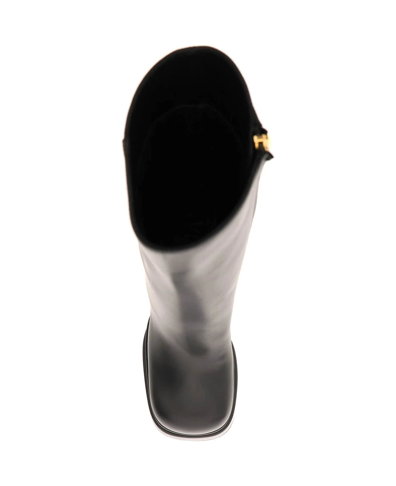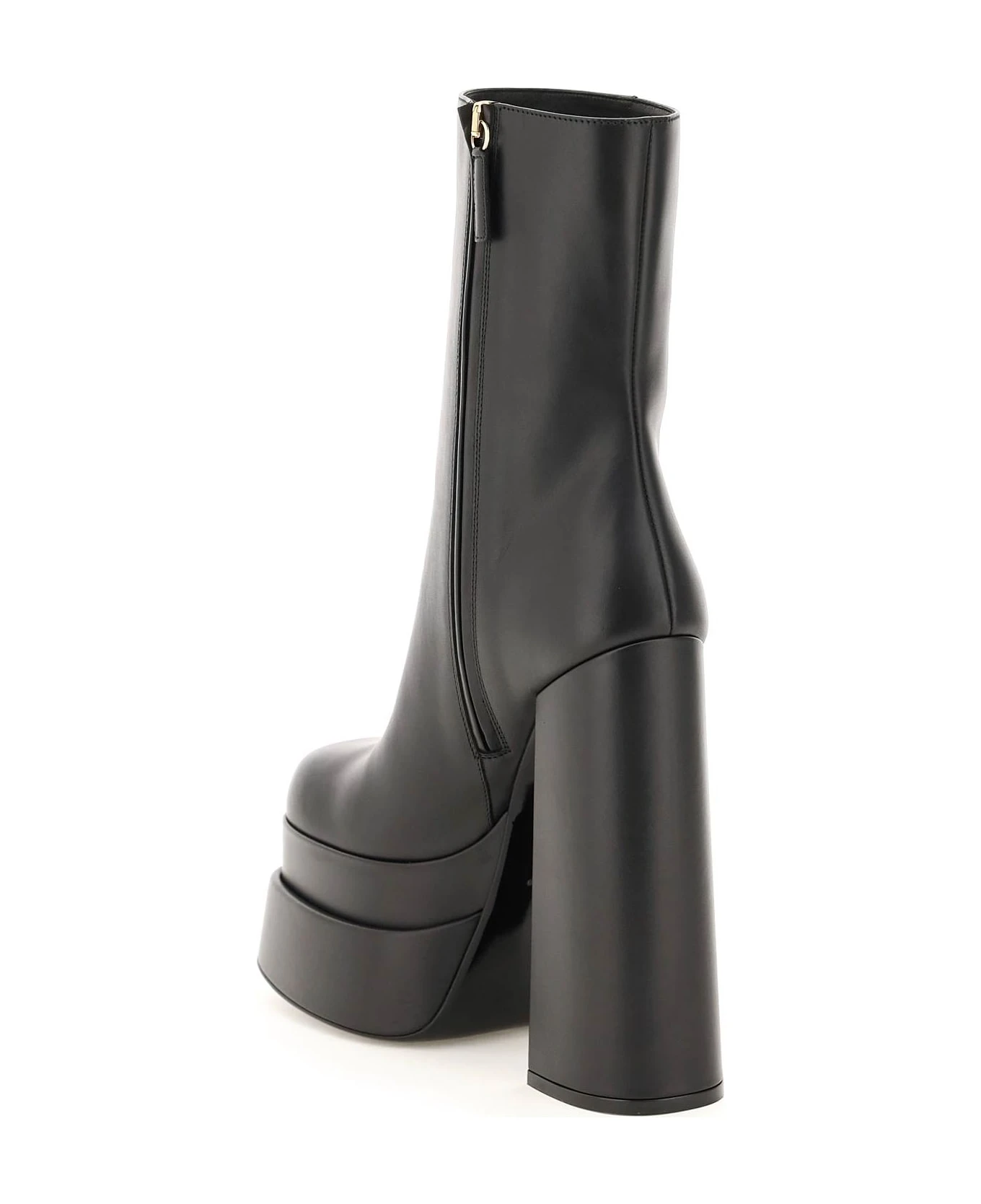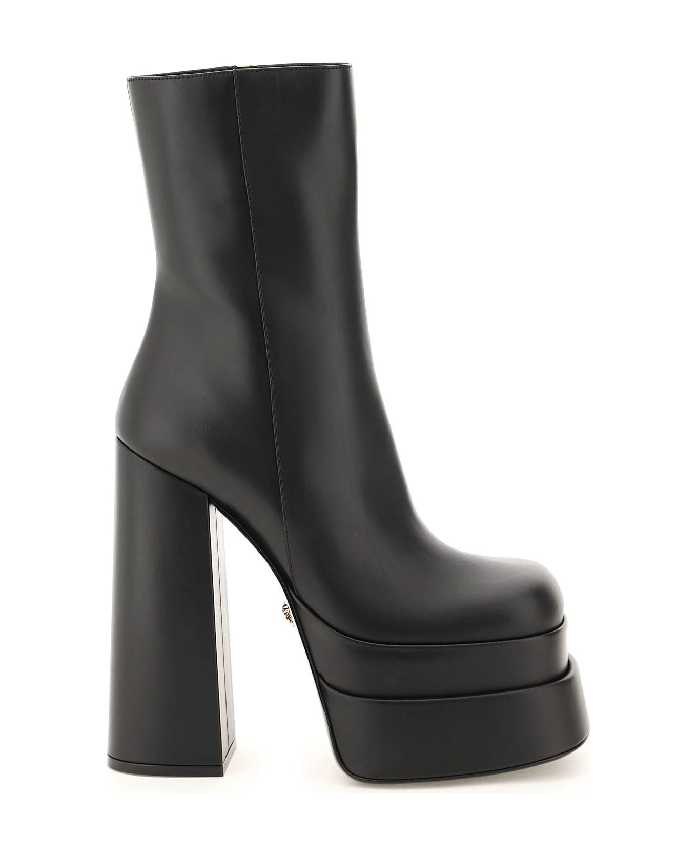 Intrico ankle boots by Versace crafted in smooth calf leather and characterized by the double platform and the maxi heel. Side zip closure, leather interior, leather sole with gold-finished metal Medusa applied on the bottom.