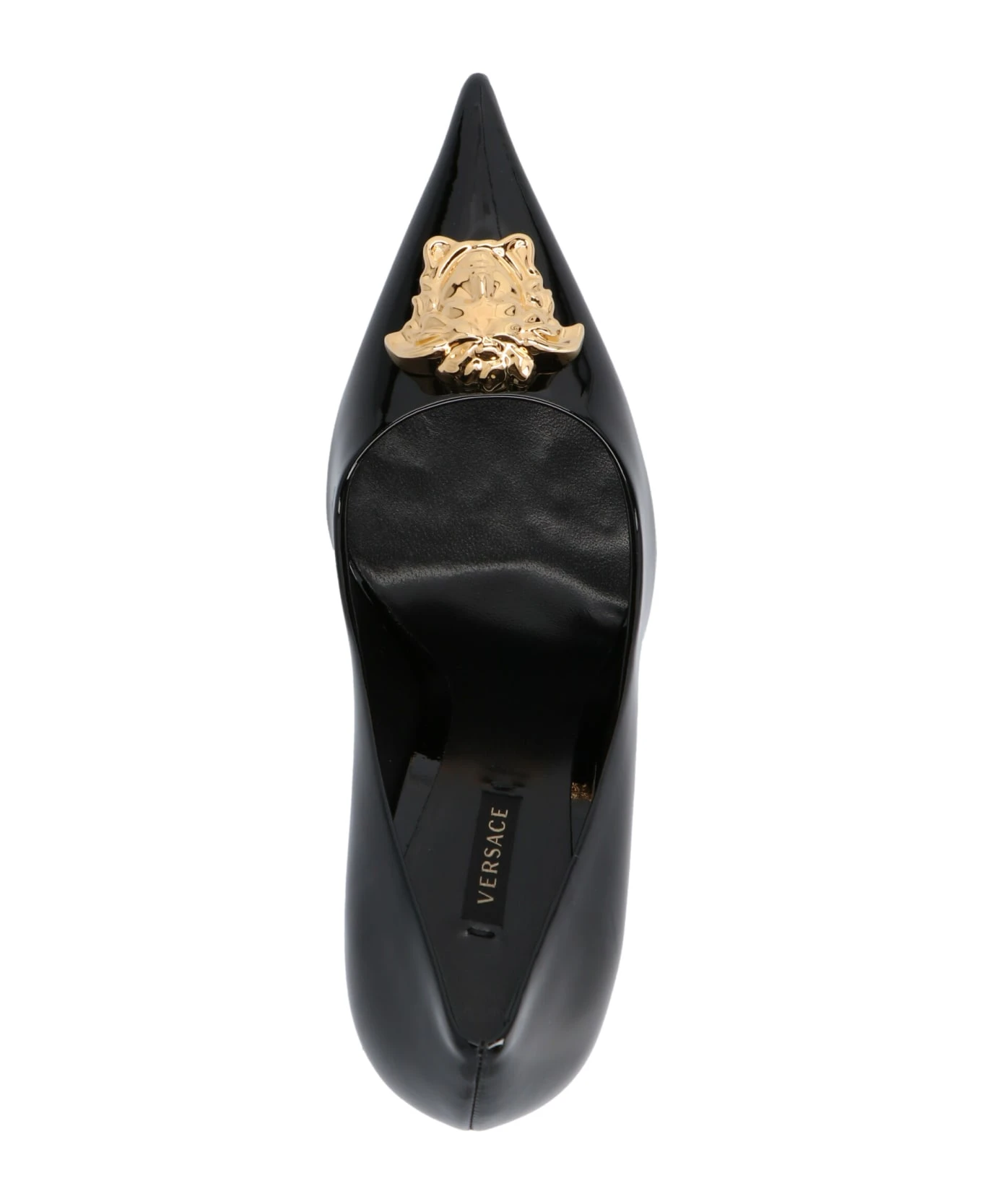 Patent-effect leather pumps featuring a gold color ‘Medusa’ logo detail.