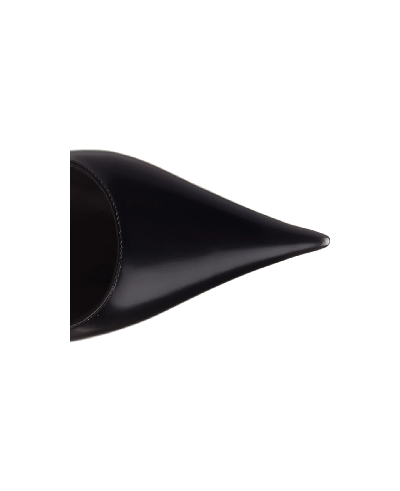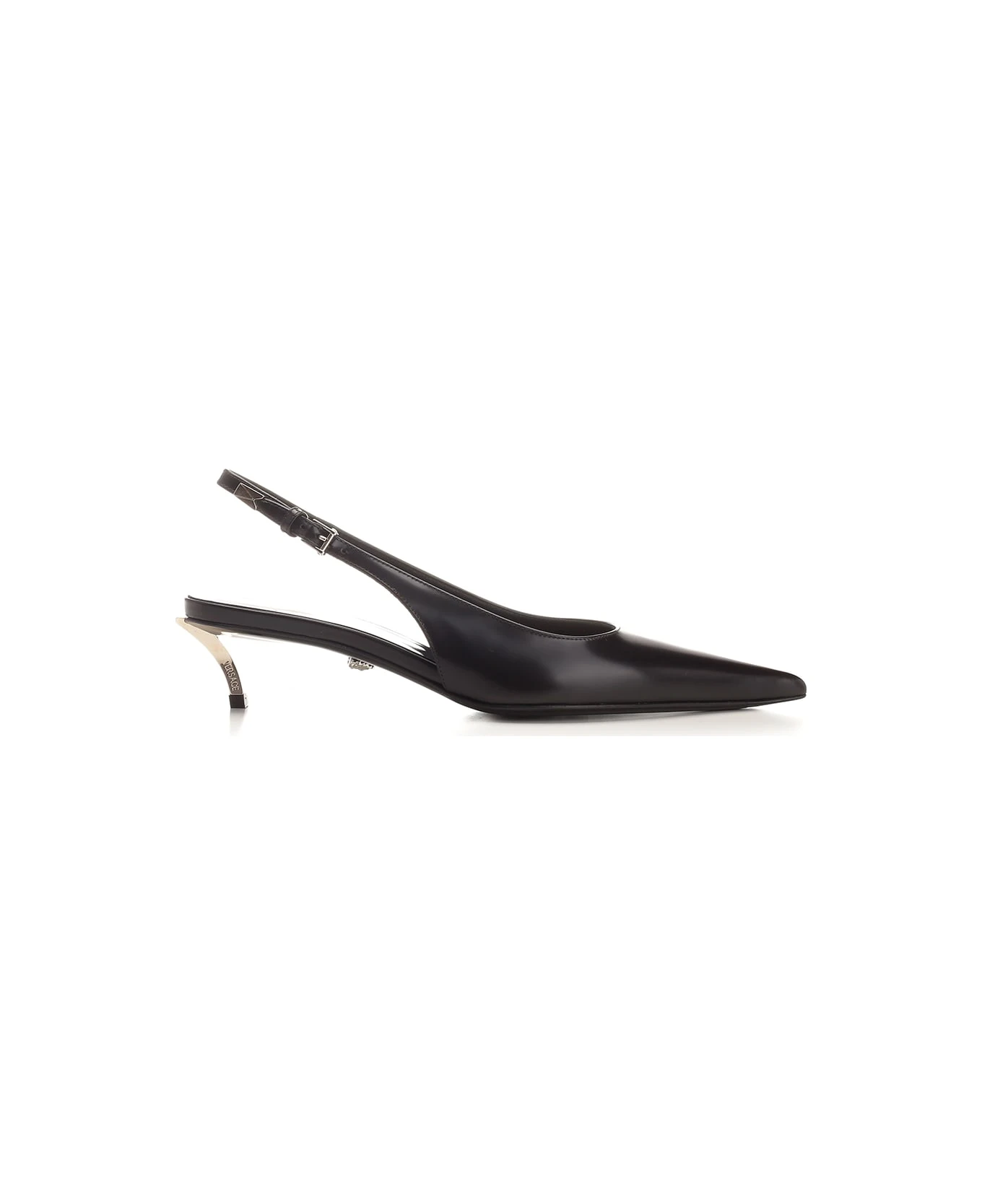 ‘Pin-Point’ Slingback Pumps from Versace in black leather featuring an elongated pointed-toe silhouette and a curved, silver-tone kitten heel