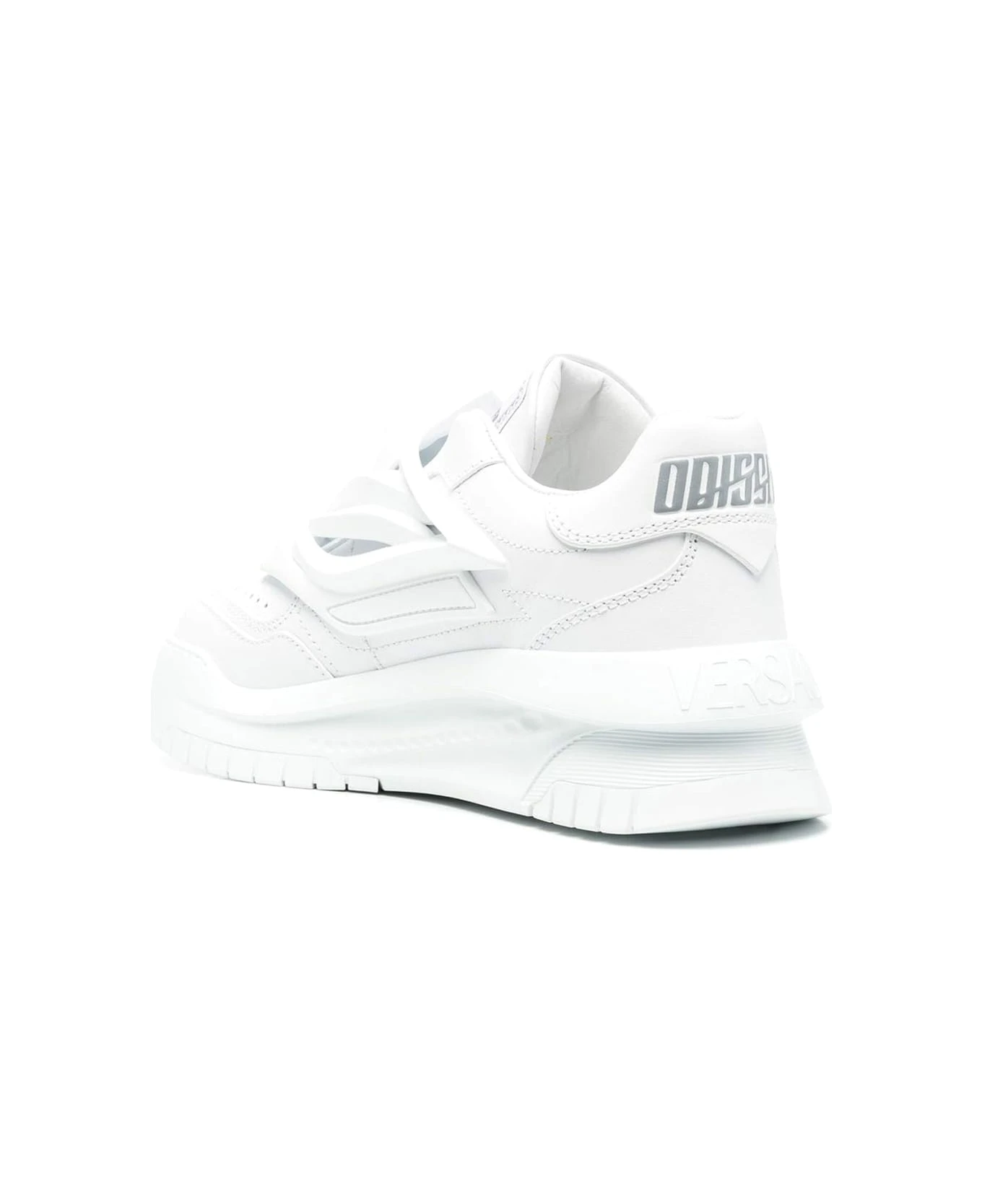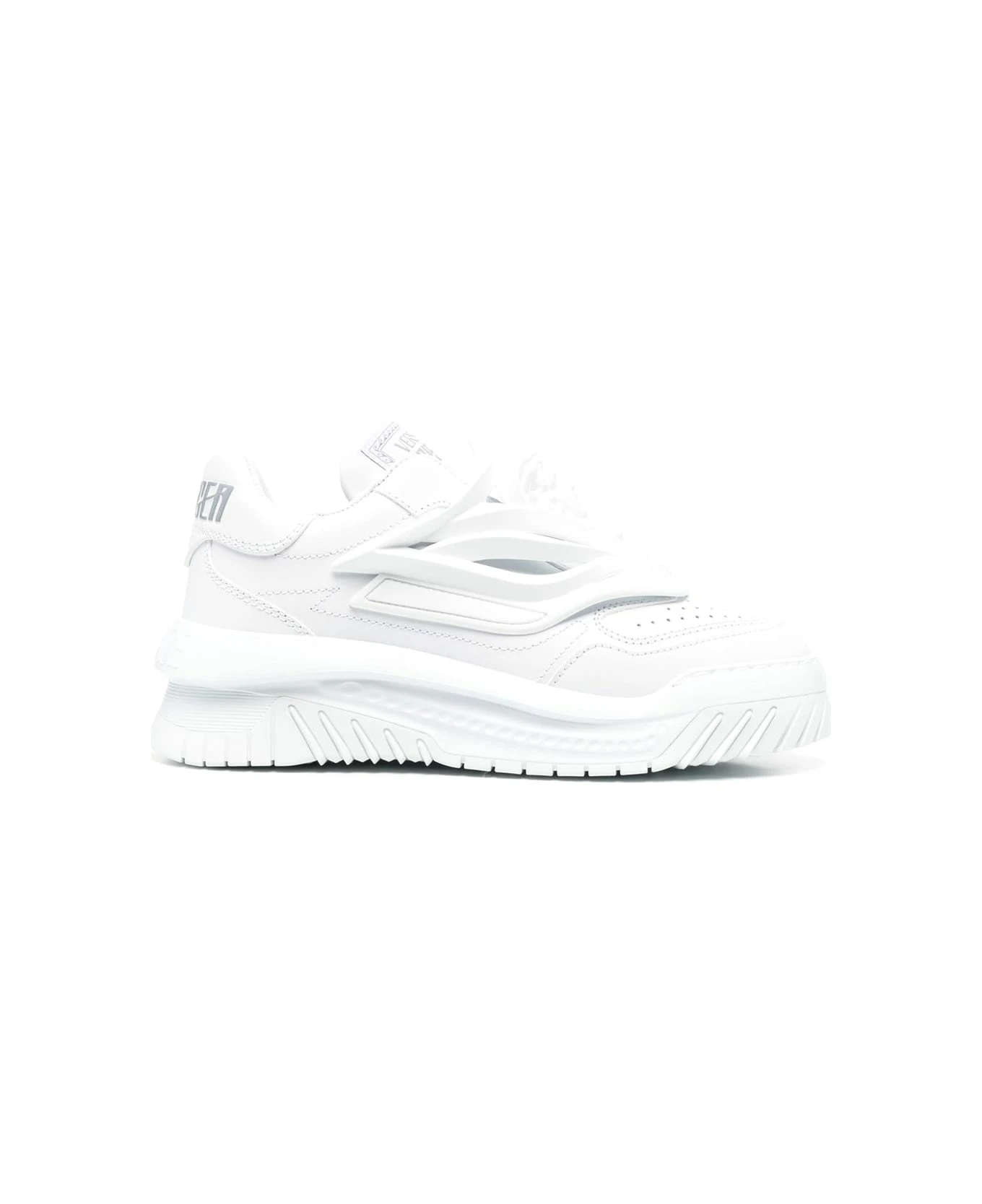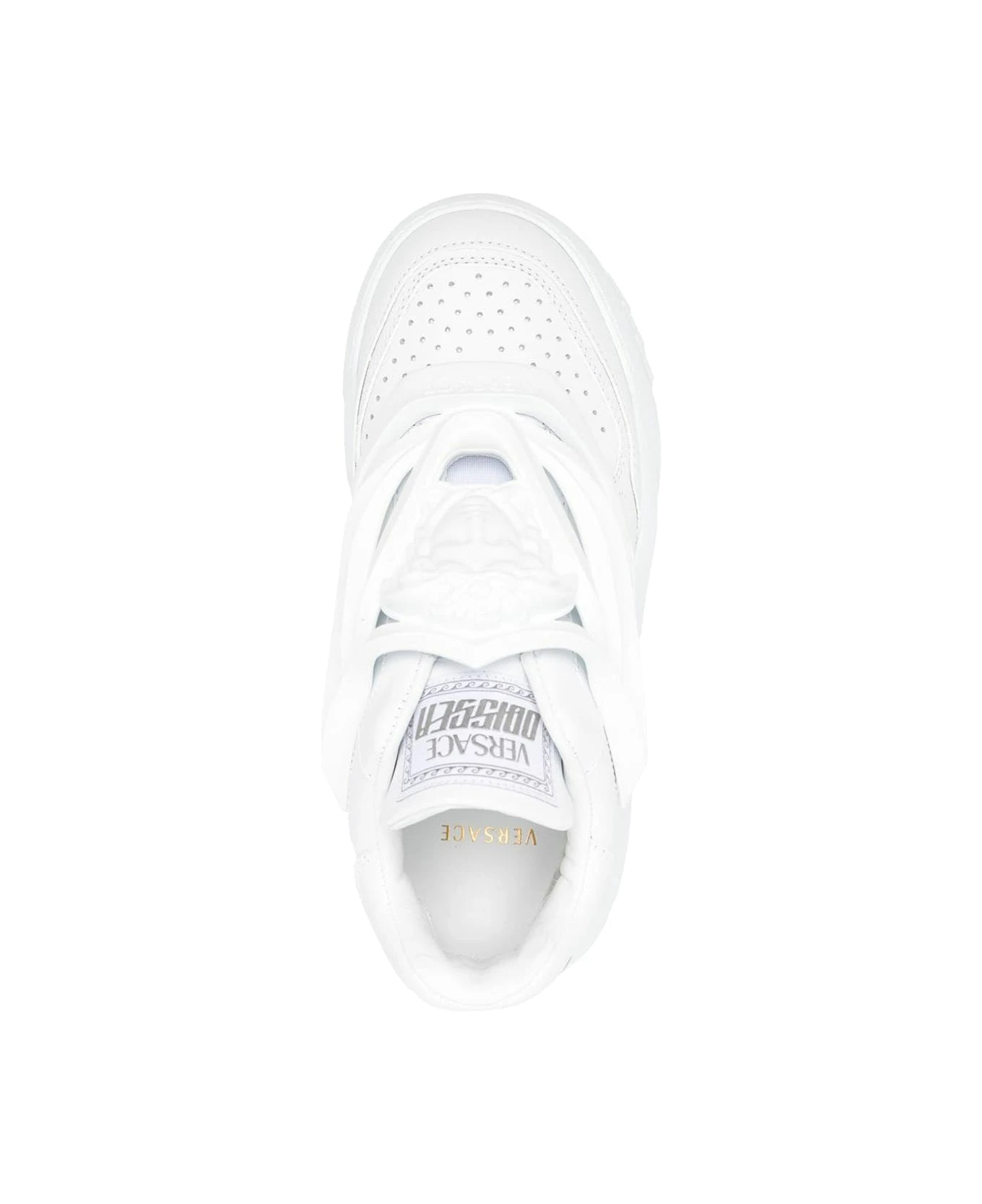 Cloud white, calfskin, logo on the heel, round toe, perforated toe, front closure with laces and chunky rubber sole.